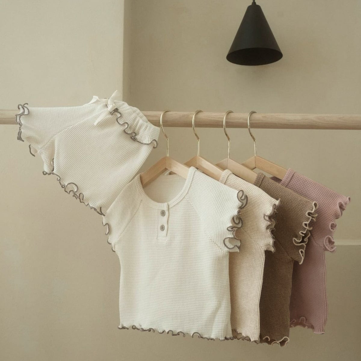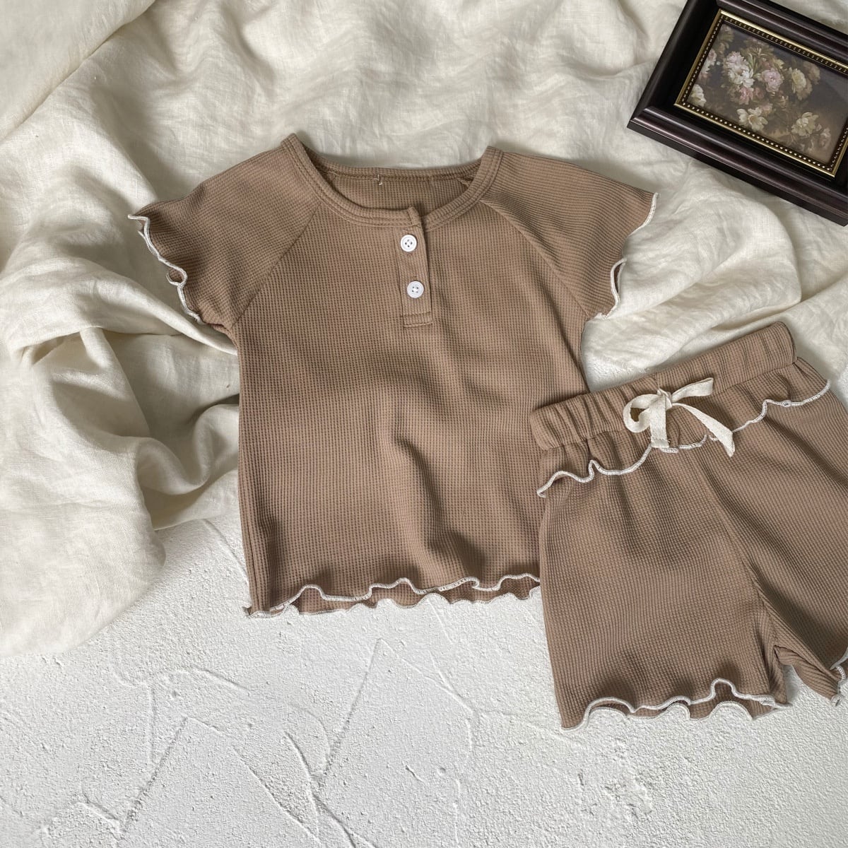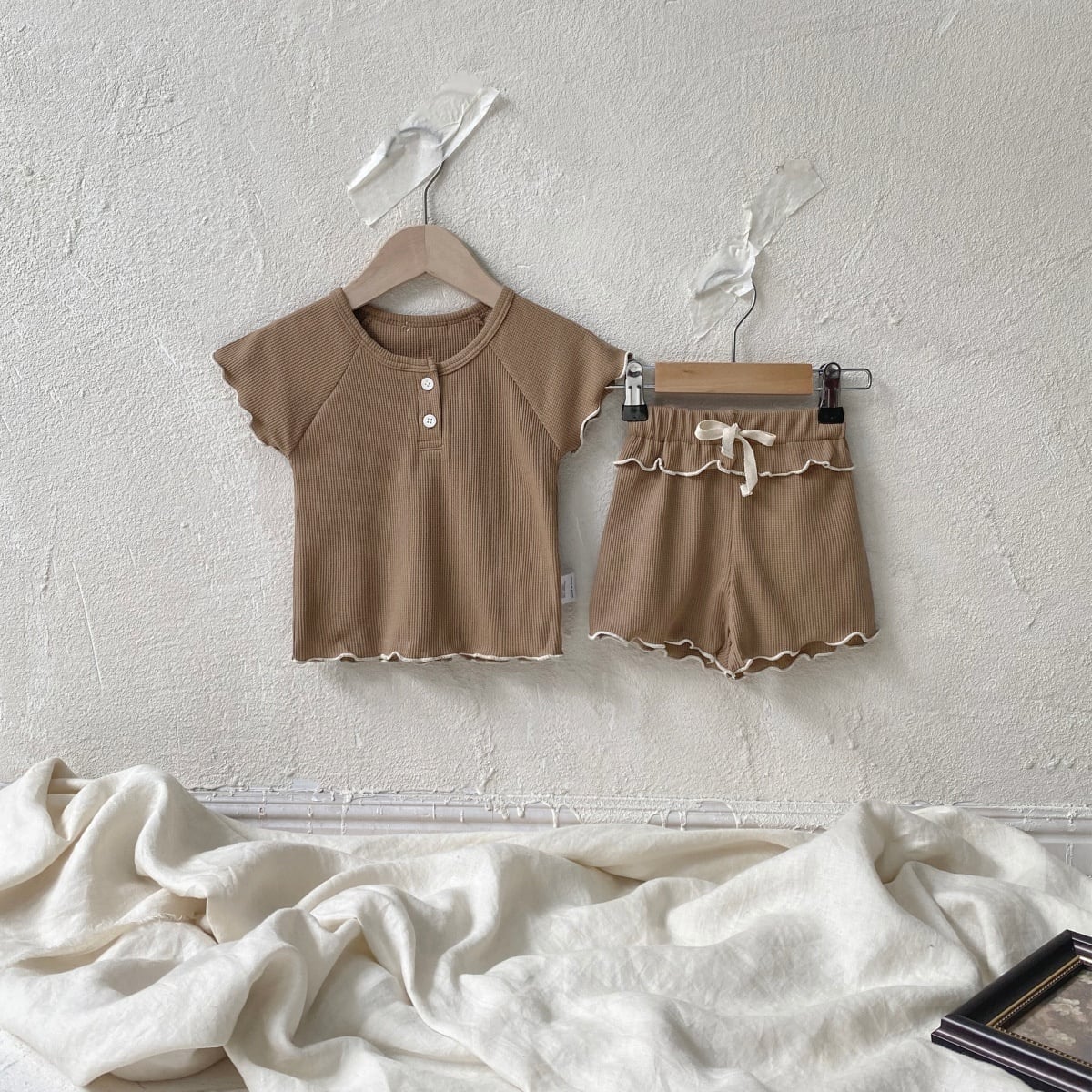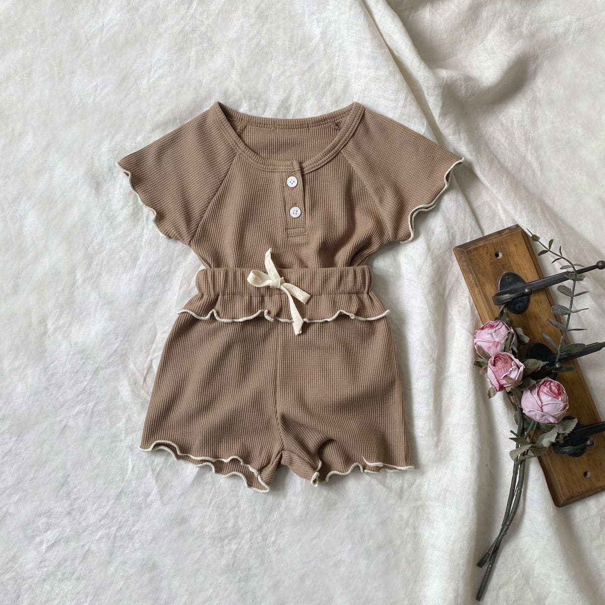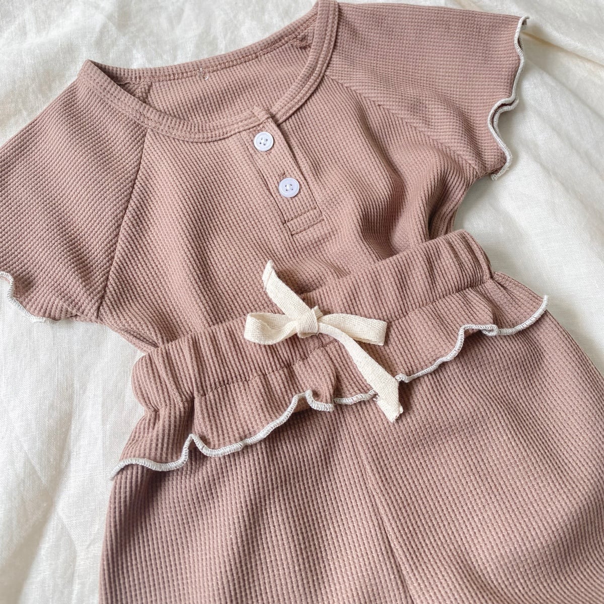 ,ベビー幼児女の子フリル半袖上下セット ワッフル かわいい夏服 ルームウエア 部屋着 アイボリー ベージュ ピンク ブラウン lwa0117