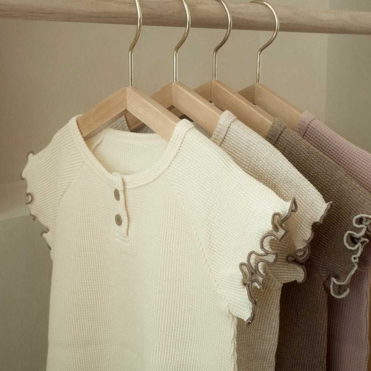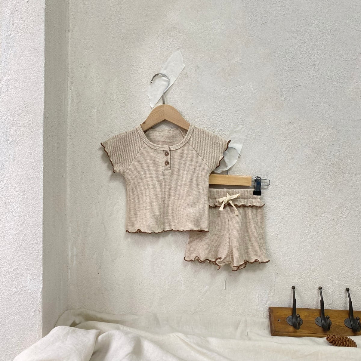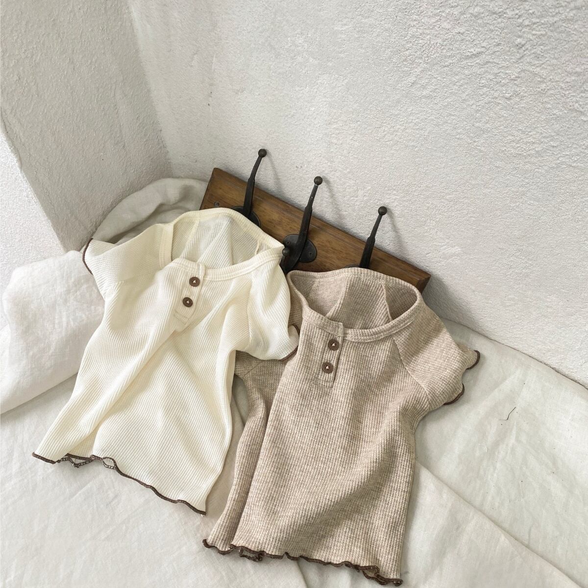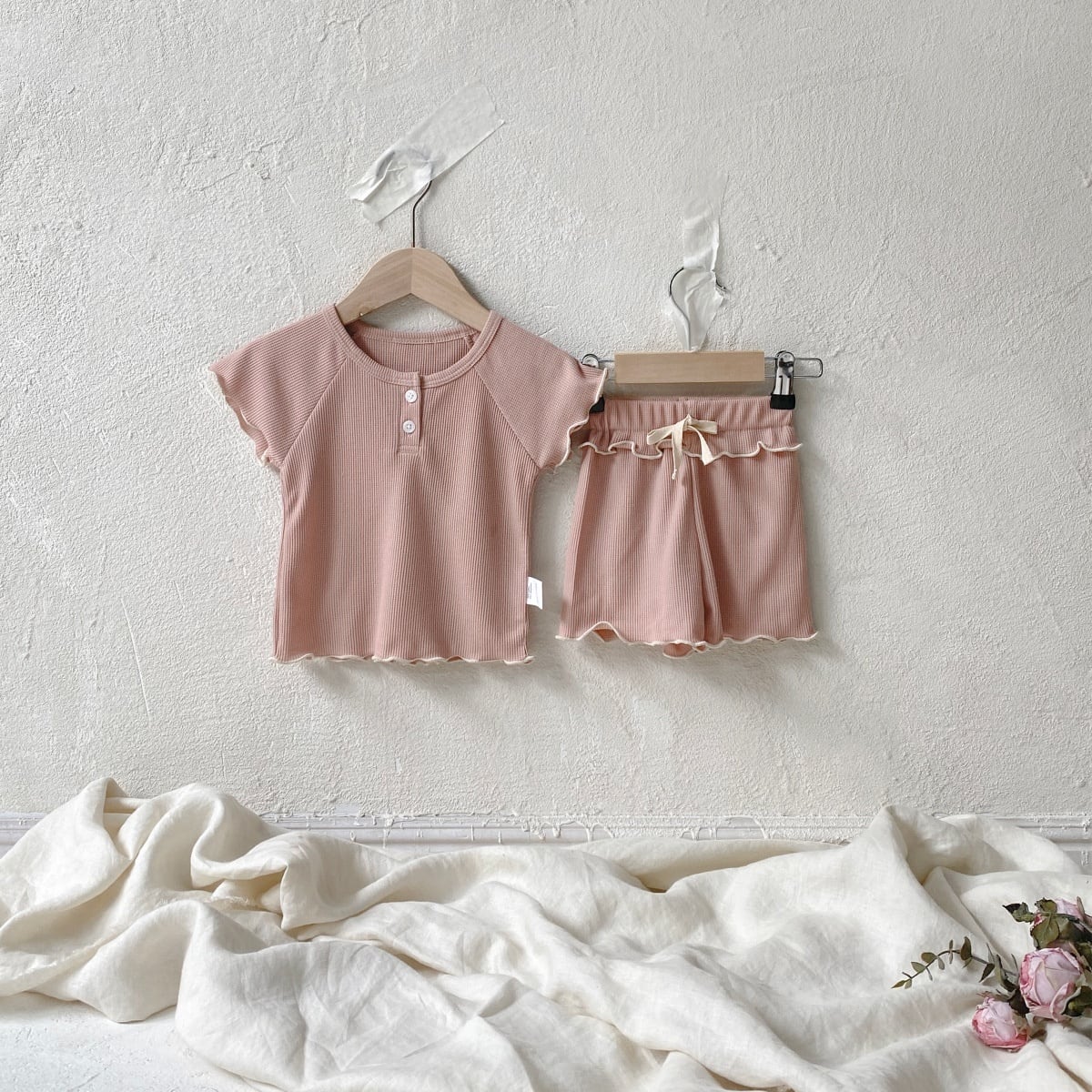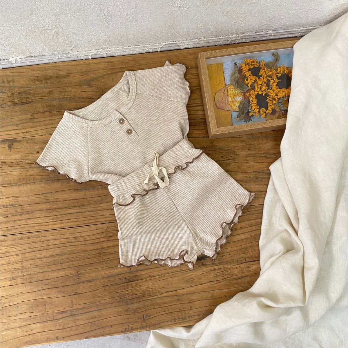 ,ベビー幼児女の子フリル半袖上下セット ワッフル かわいい夏服 ルームウエア 部屋着 アイボリー ベージュ ピンク ブラウン lwa0117