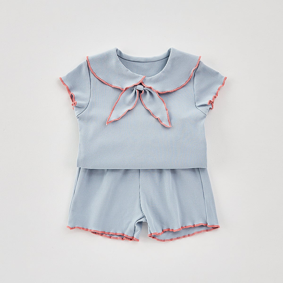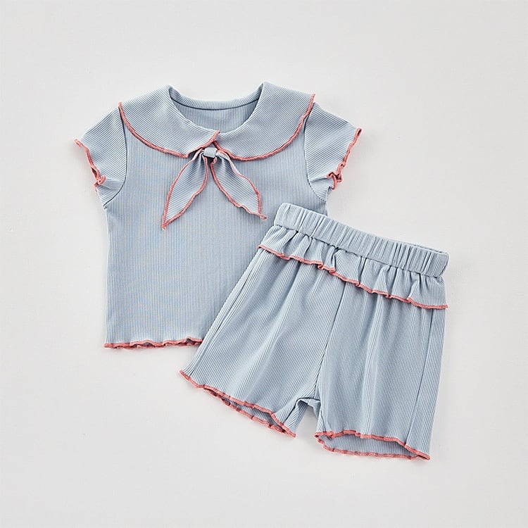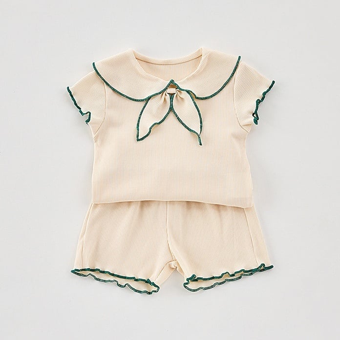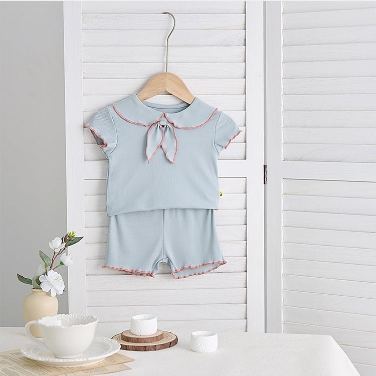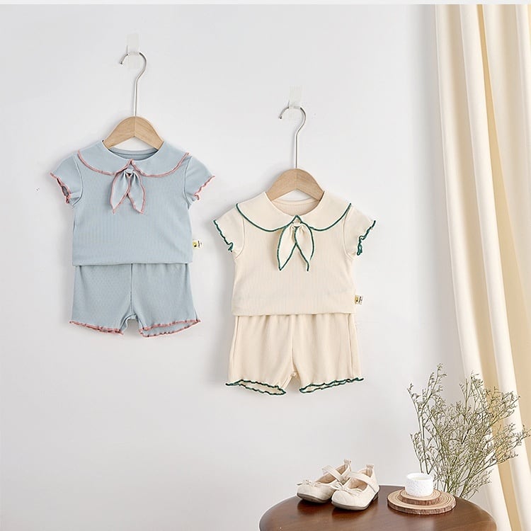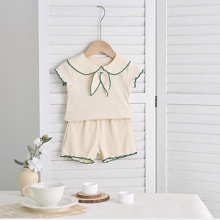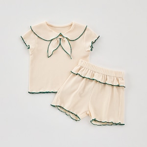 可愛らしいデザインのベビー幼児女の子丸襟スカート付き半袖セットアップです!フリルが施され、丸襟にスカーフがポイントで、夏のお出かけにぴったりのアイテムです。
