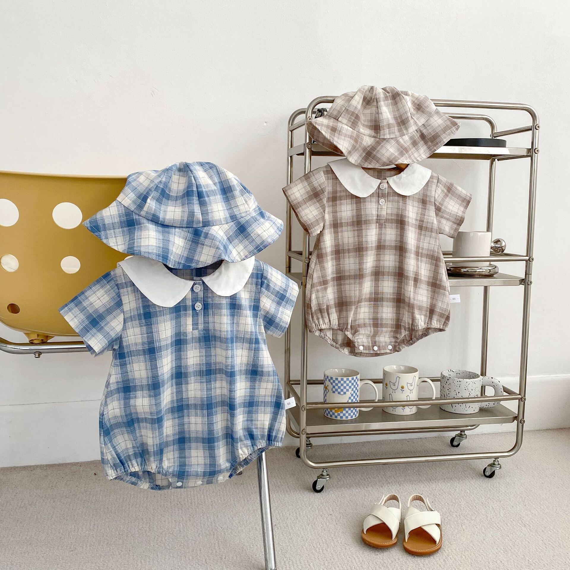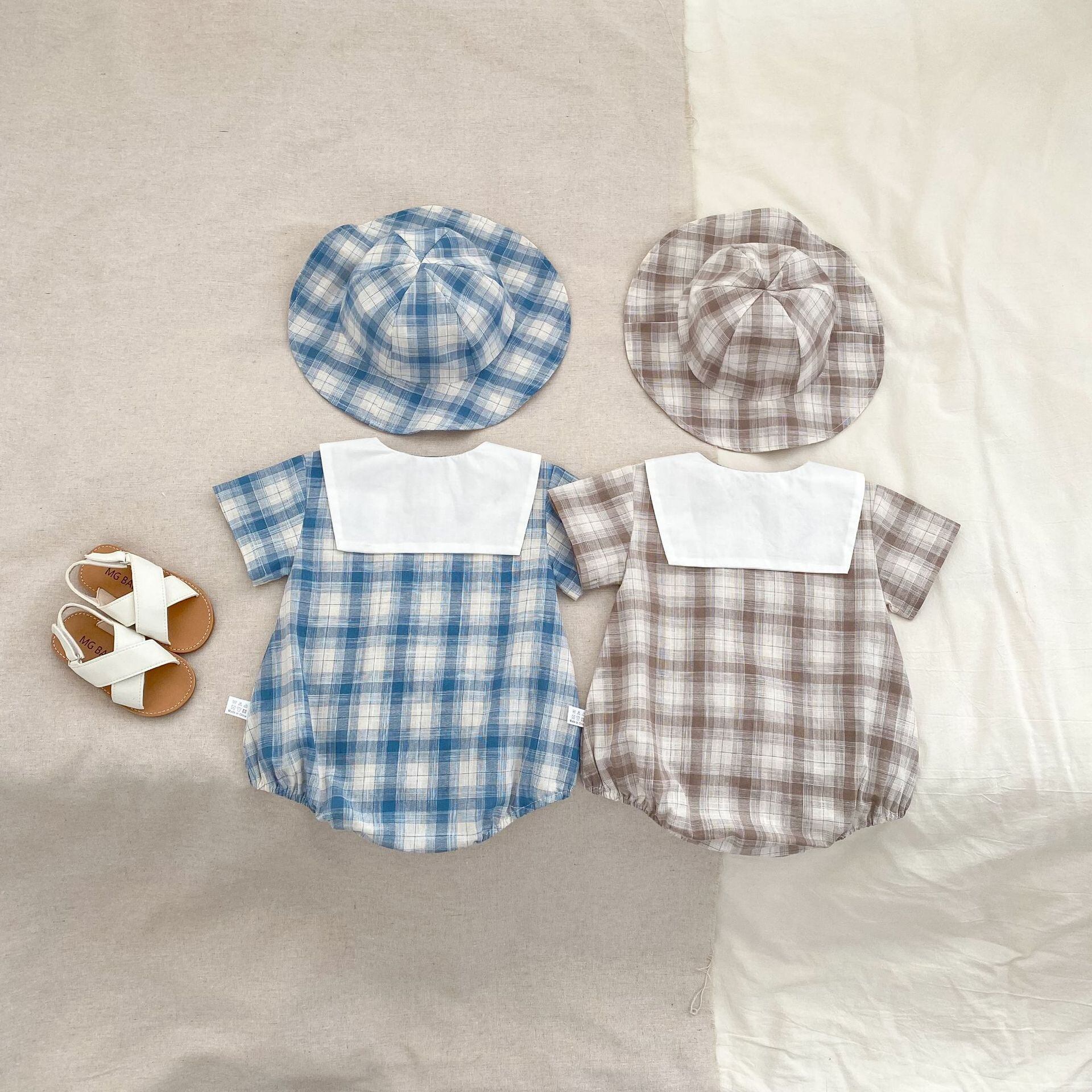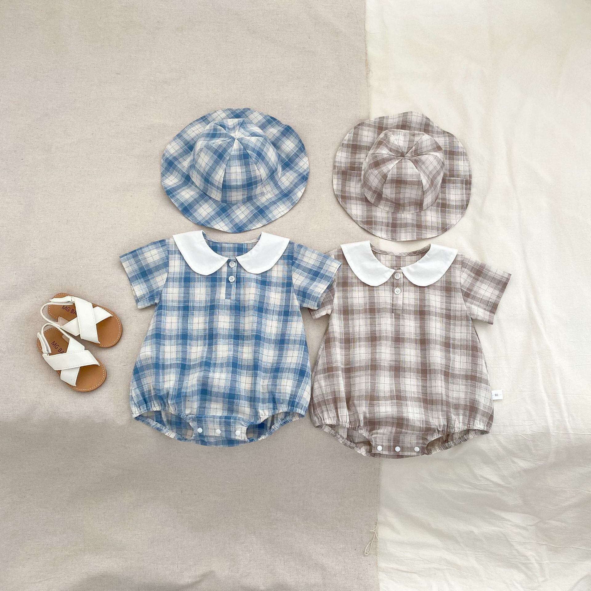 ,ベビー男の子ギンガムチェック丸襟ロンパース 帽子付き ブラウン ブルー かわいい夏服 lwb0202