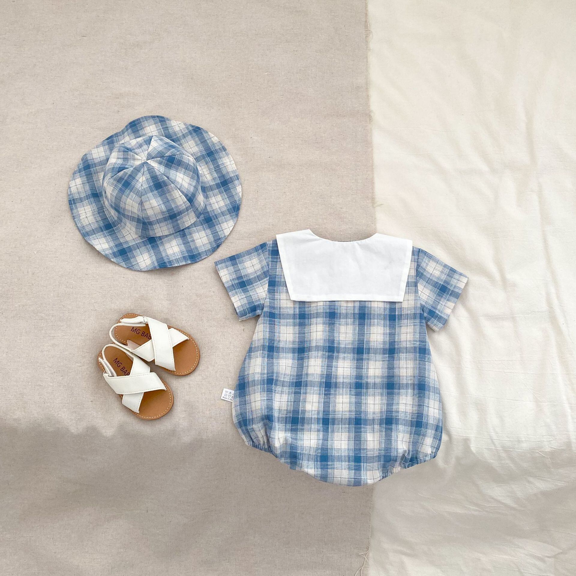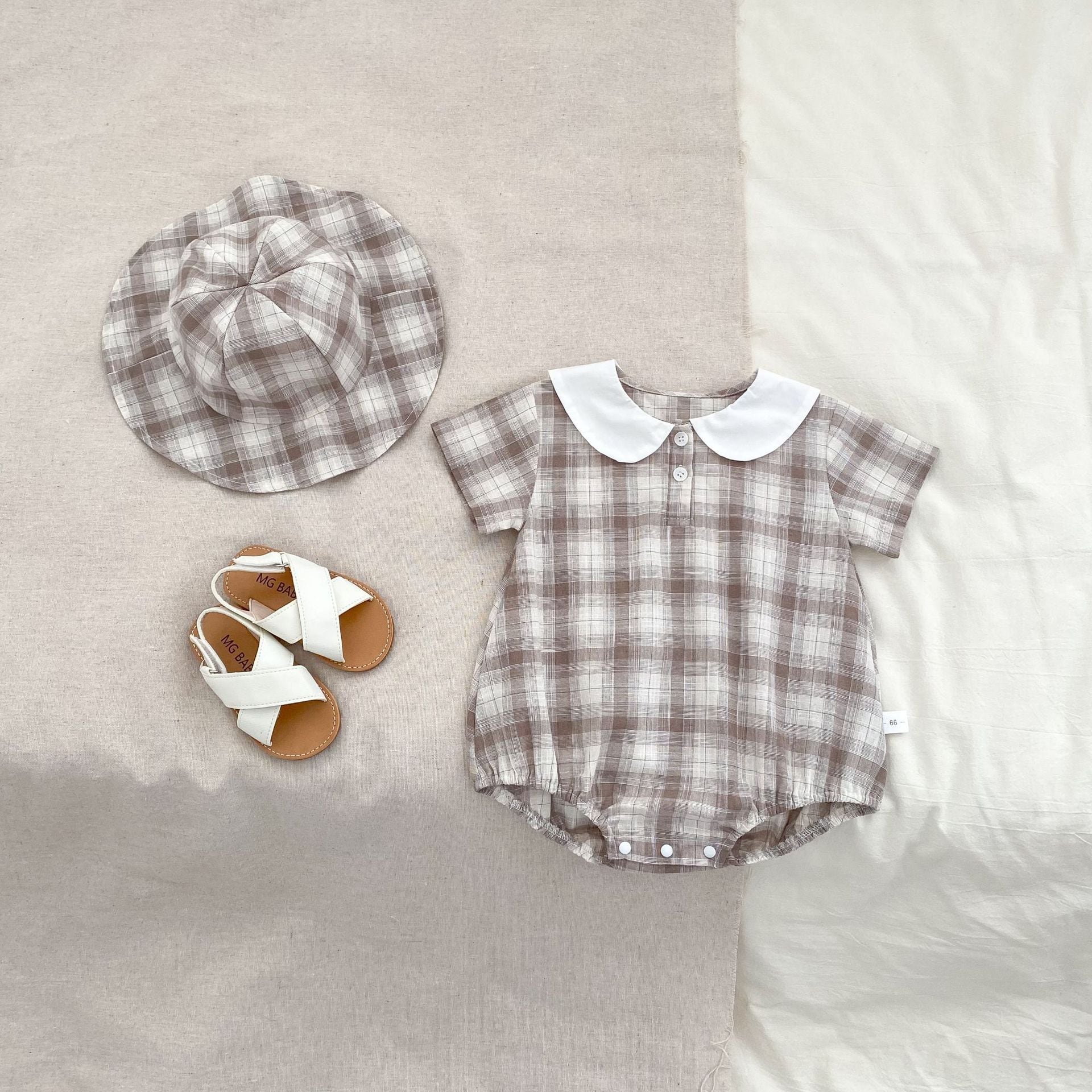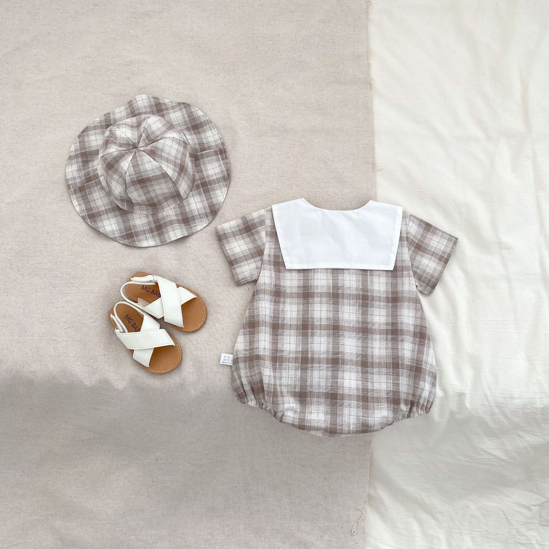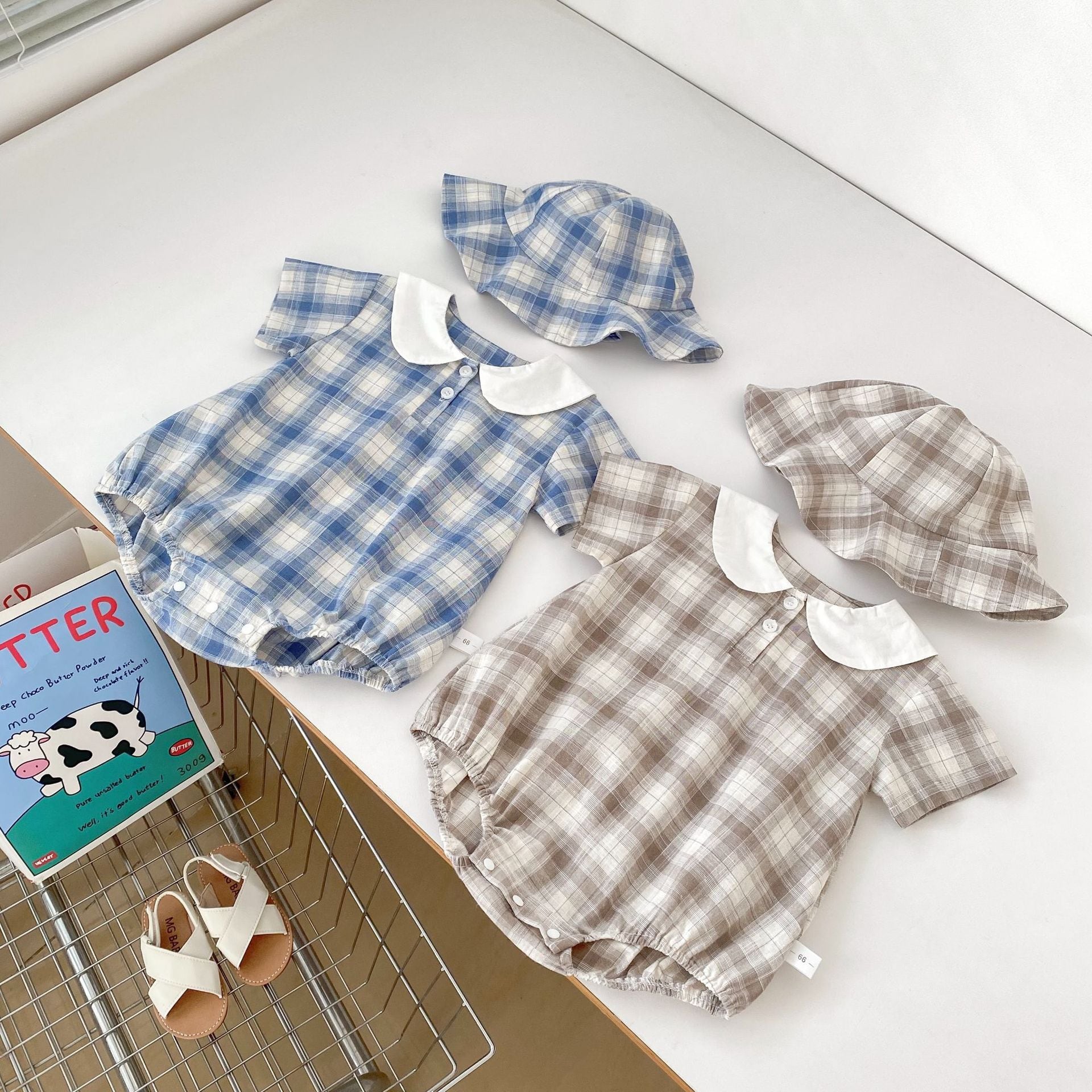 ,ベビー男の子ギンガムチェック丸襟ロンパース 帽子付き ブラウン ブルー かわいい夏服 lwb0202