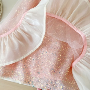 外生地はエレガントなチュールで、裏生地はキラキラのスパンコールが施されています。