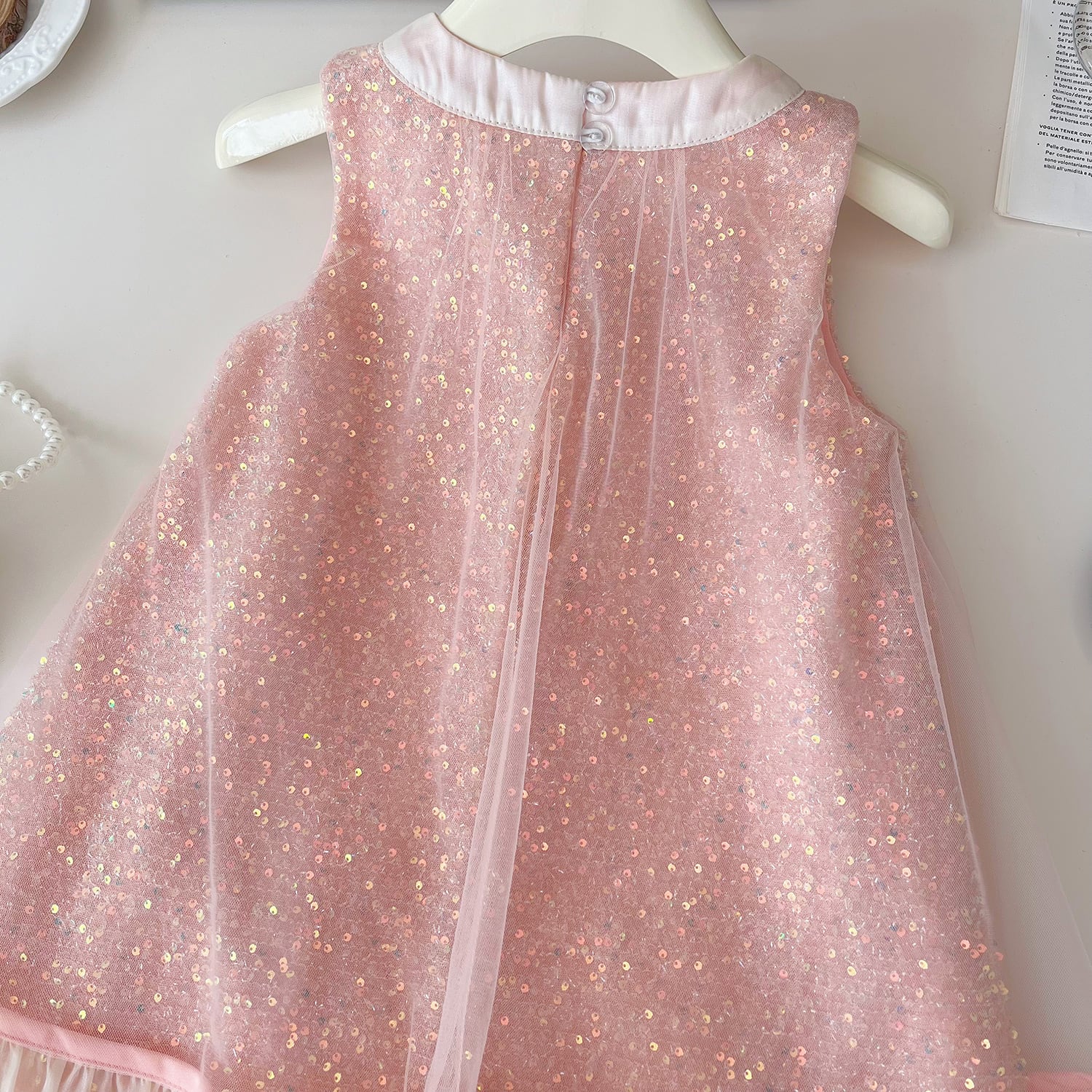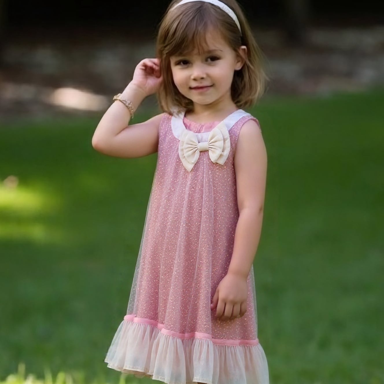 ,キッズ女の子リボン襟ノースリーブワンピース Aライン フリル裾 ピンク 結婚式 発表会 誕生日会 lwk0106
