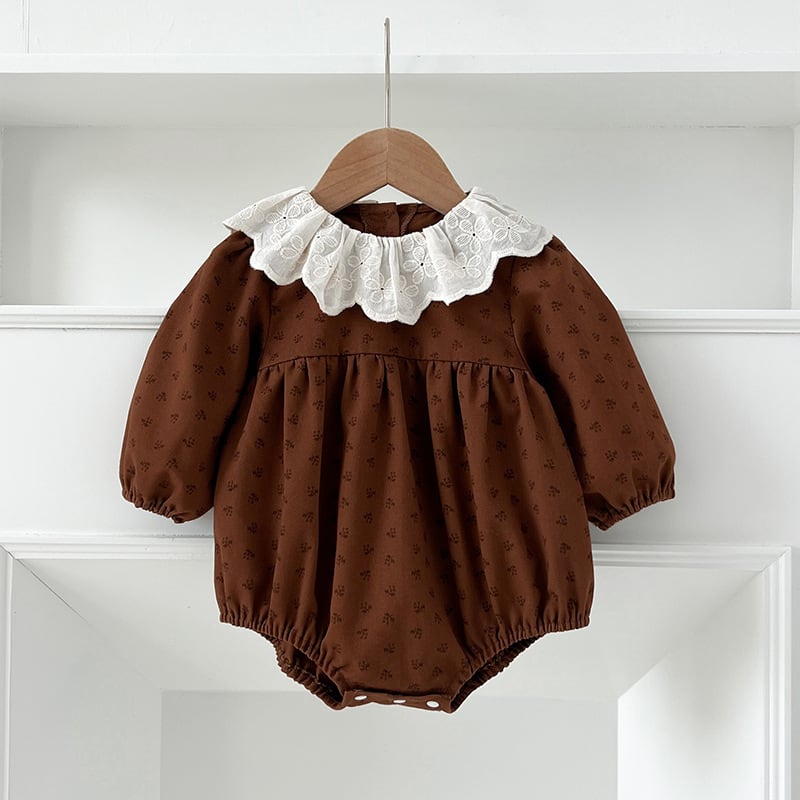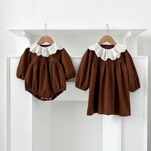 ,ベビーキッズ女の子100%フリル襟付きリンクコーデ ロンパース ワンピース 姉妹お揃い ブラウン ブラック lwa0048