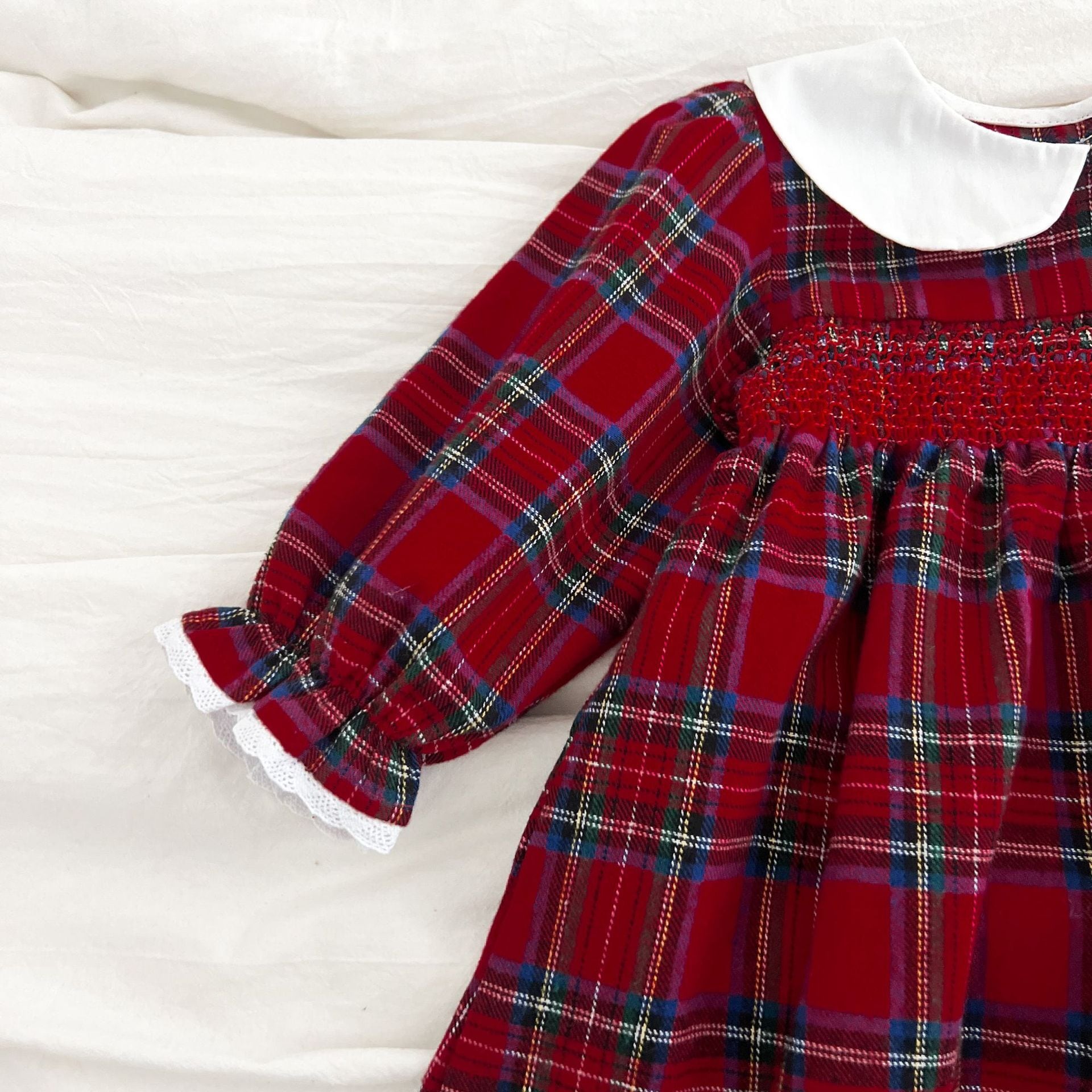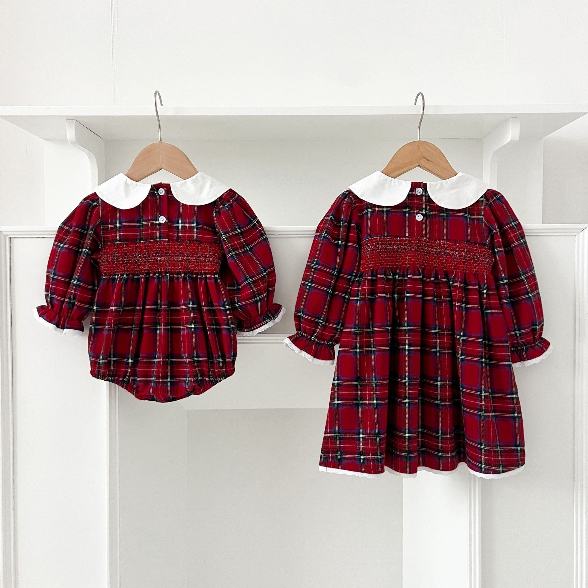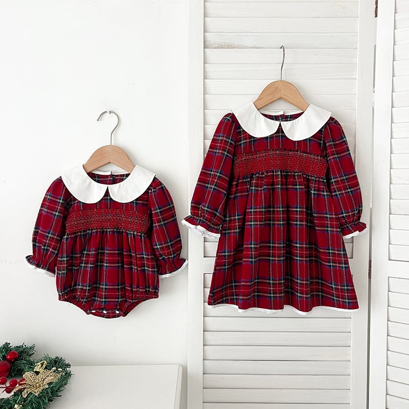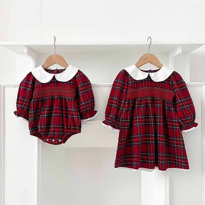,ベビーキッズ女の子クリスマスレッドチェック柄長袖ロンパースワンピース リンクコーデ 姉妹お揃い かわいい秋冬服 lwa0071