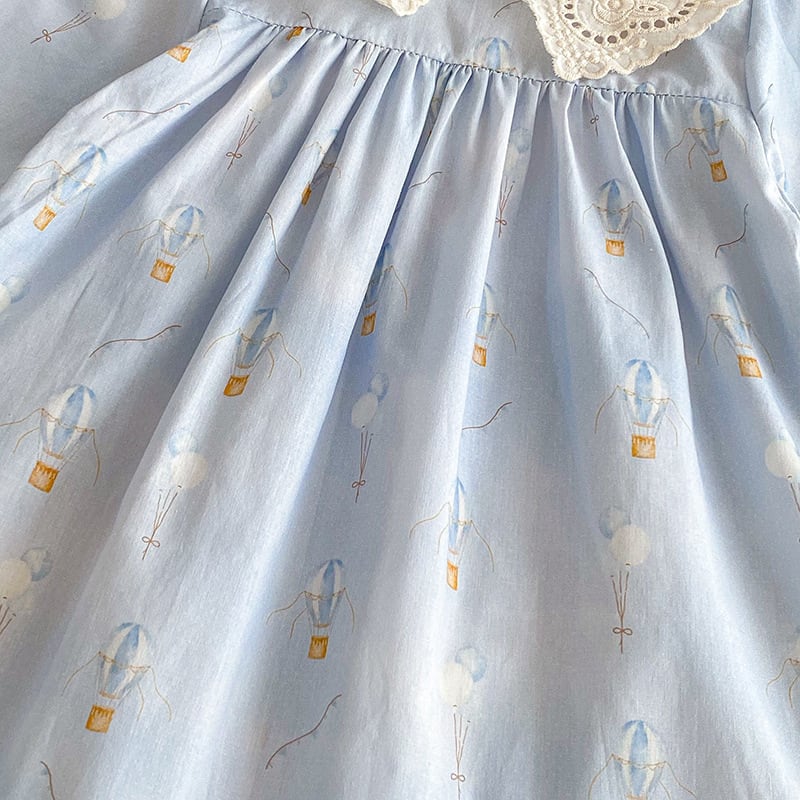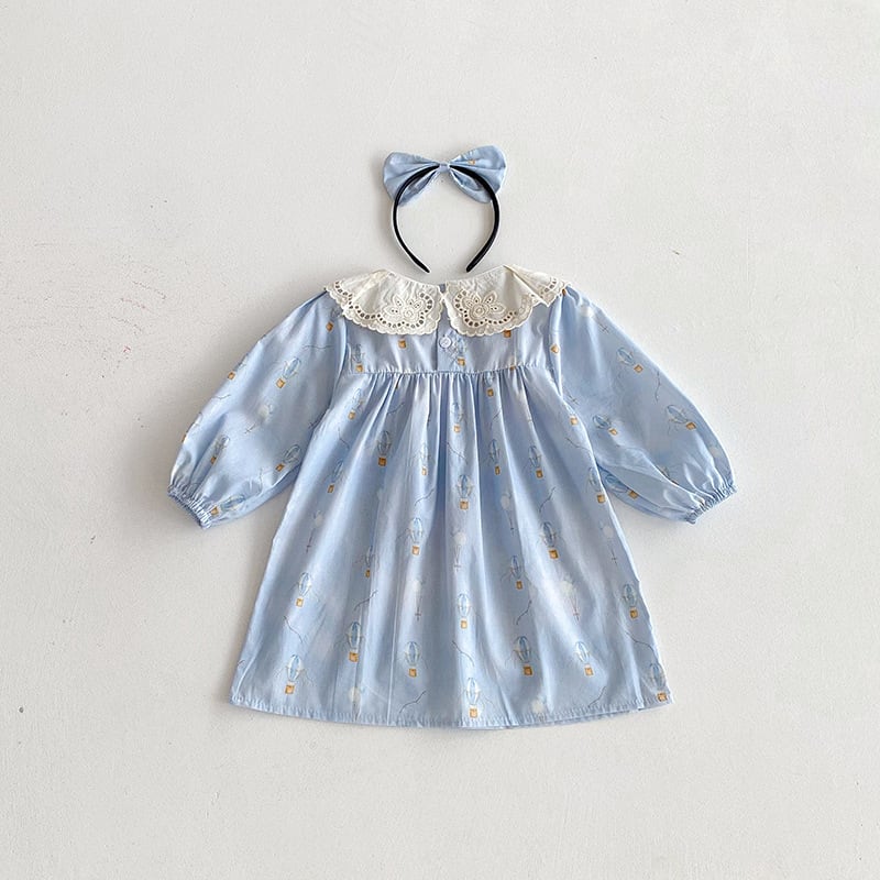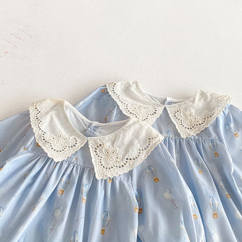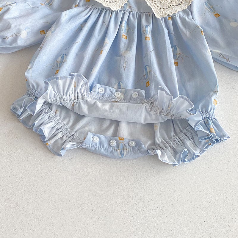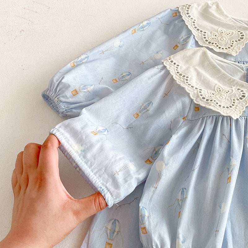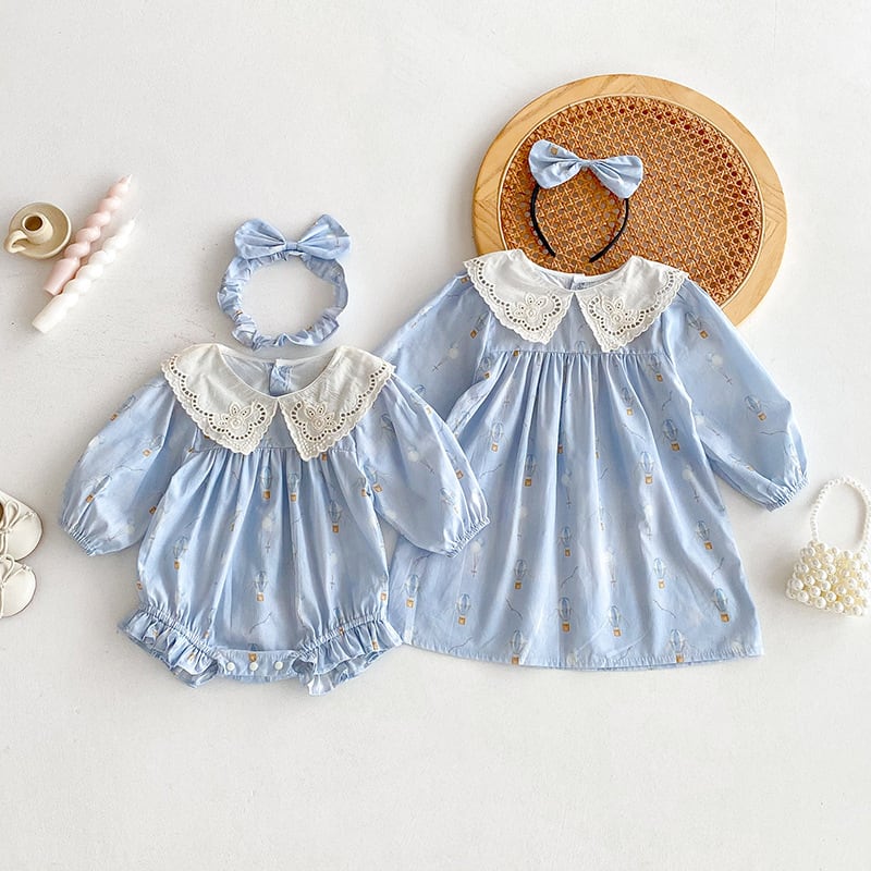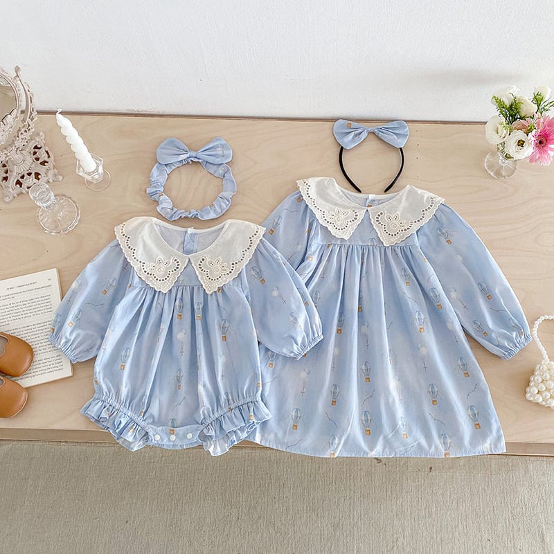 ,ベビーキッズ女の子風船柄長袖ロンパースワンピース リンクコーデ ブルー 姉妹お揃い かわいい秋冬服 lwa0123