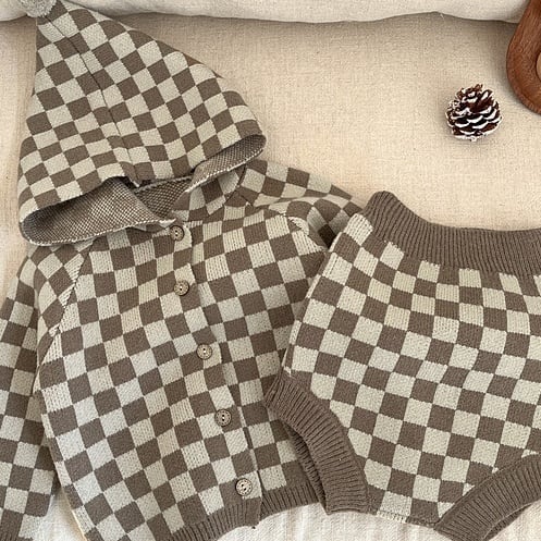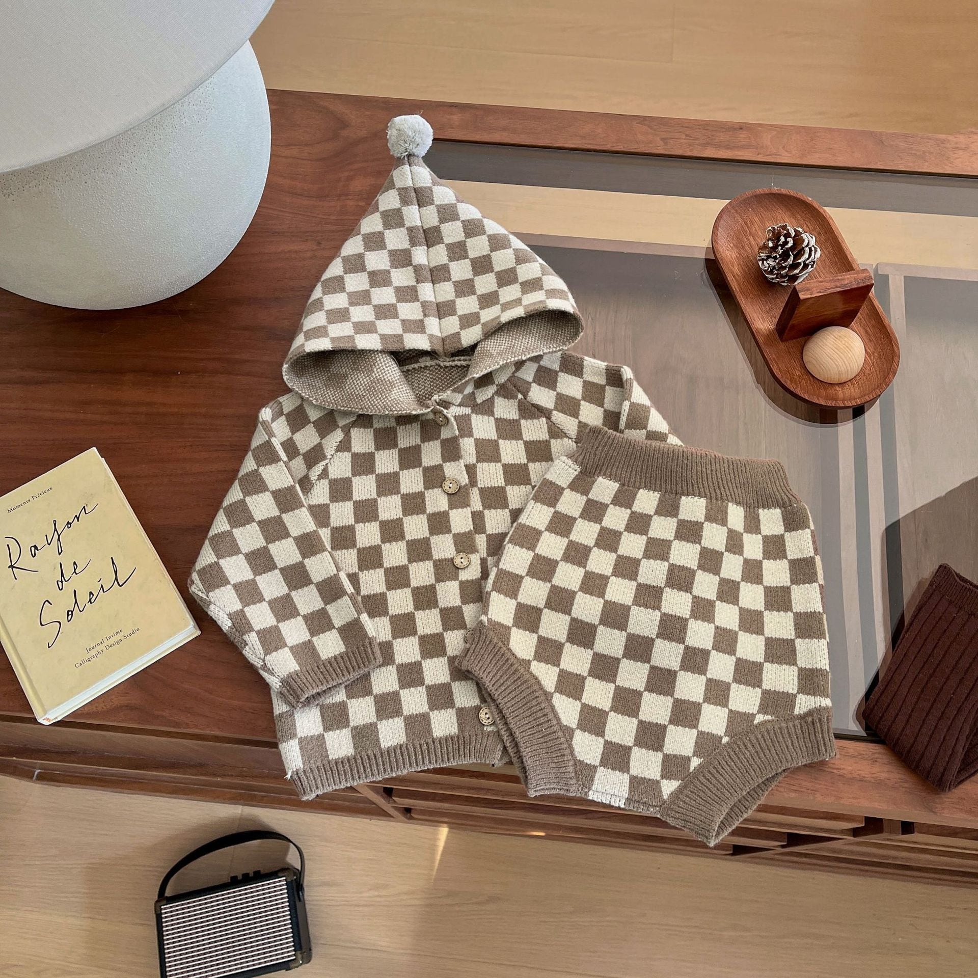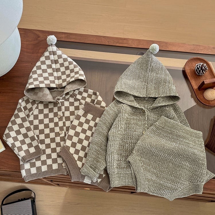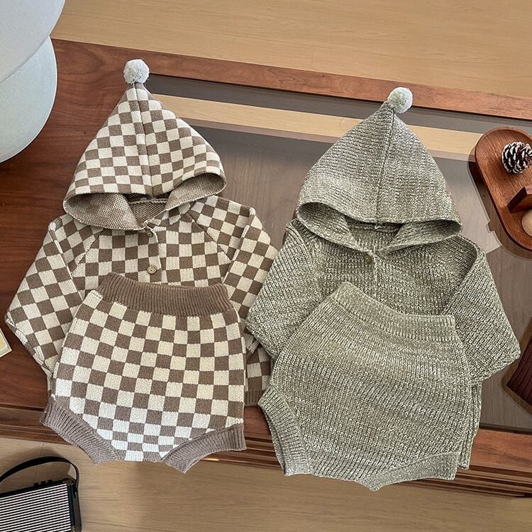 ,ベビー幼児男の子女の子フード付きニットセットアップ カーディガン ブルマパンツ オリーブグリーン チェック柄 かわいい秋冬服 lwa0128