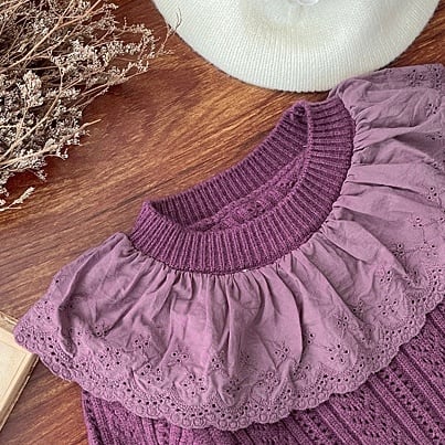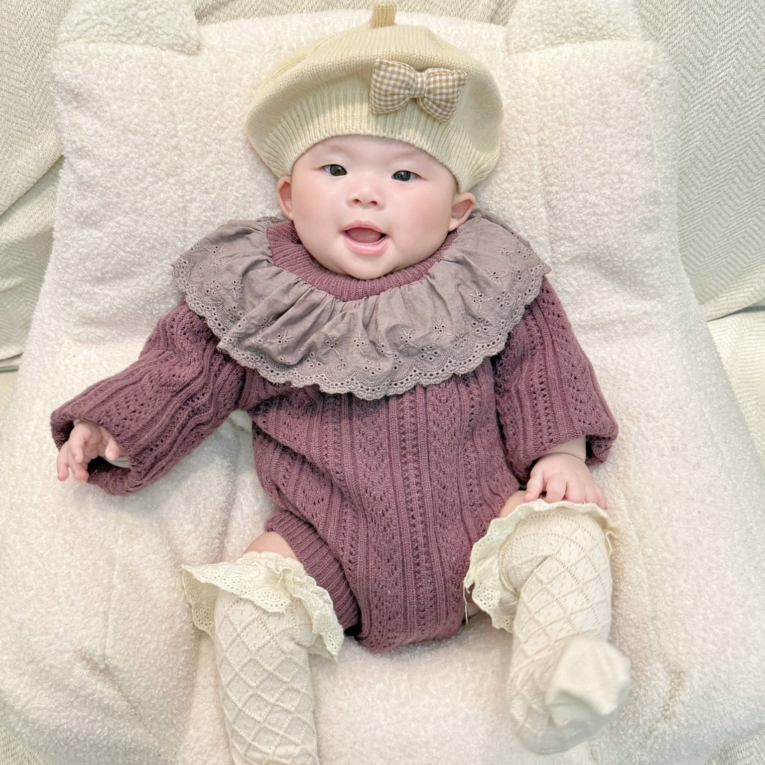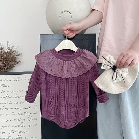 ,ベビー女の子ビッグ襟ニットロンパース パープル ケーブル編み かわいい秋冬服 lwb0074