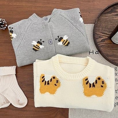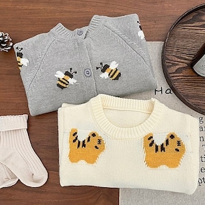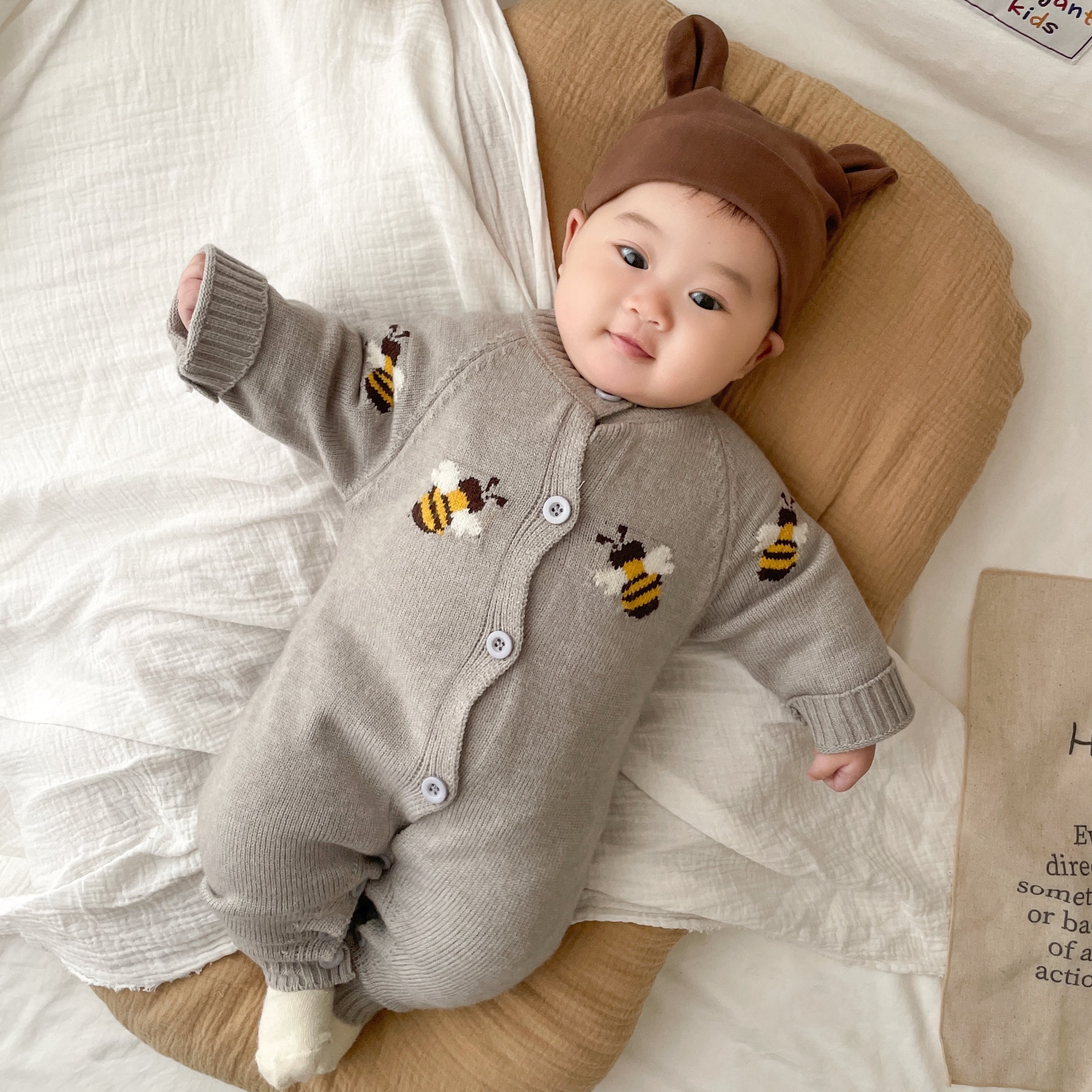,ベビー女の子男の子アニマルモチーフニットロンパース カバーオール BEE タイガー 前開き かわいい秋冬服 グレー アイボリー lwa0130