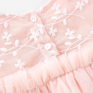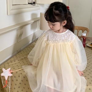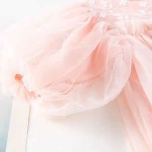 長袖のチュールパフスリーブに胸元のお花が愛らしく、背中には2つ並んだボタンで着脱も簡単。