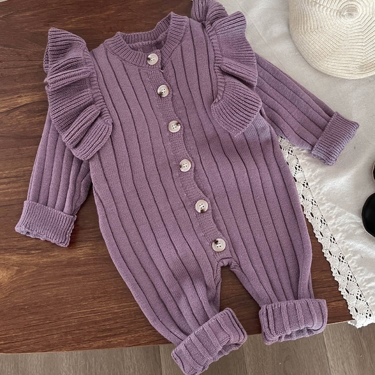 ,ベビー女の子肩フリル付き長袖ロンパース 前開きカバーオール アイボリー パープル かわいい秋冬ベビー服 お出かけ lwb0082