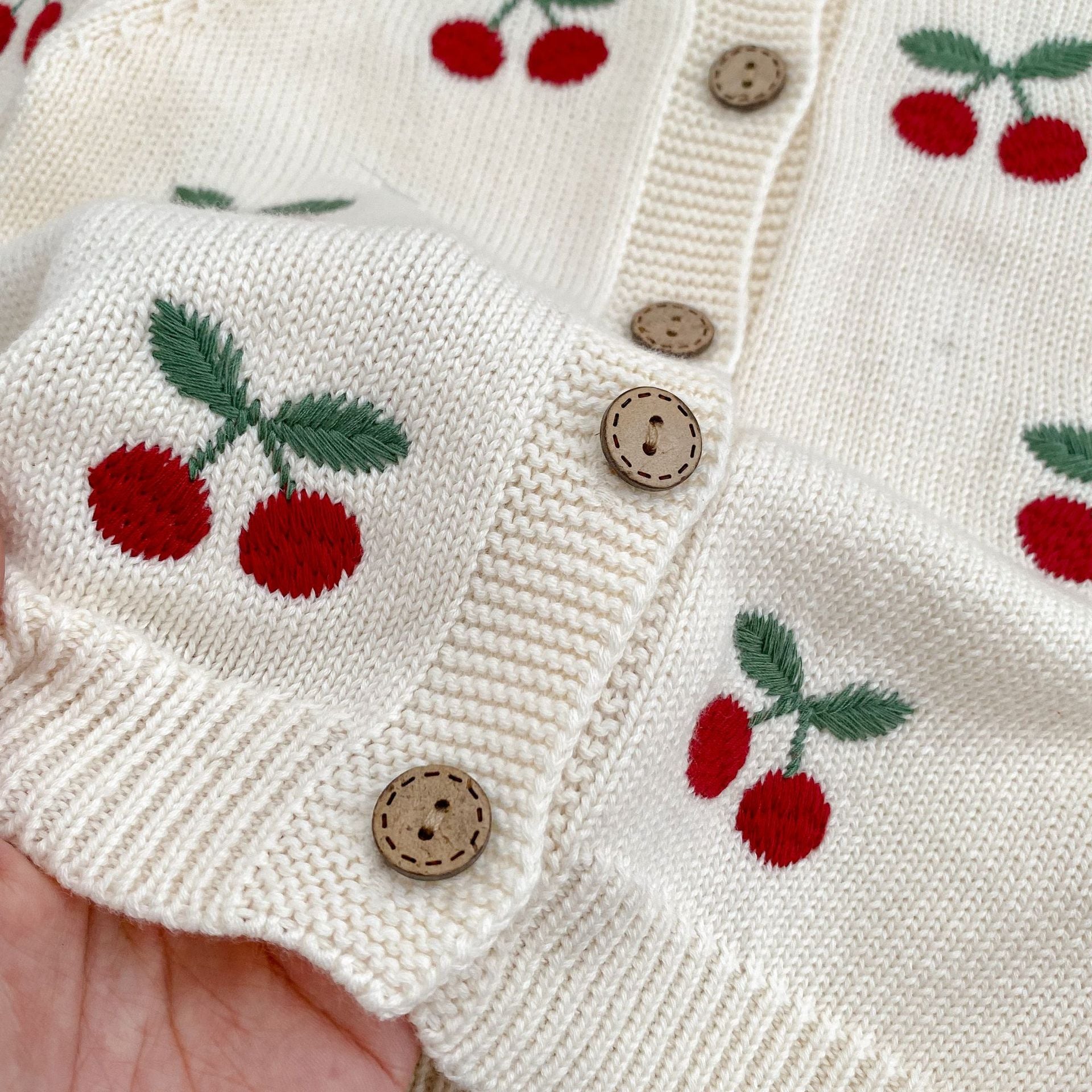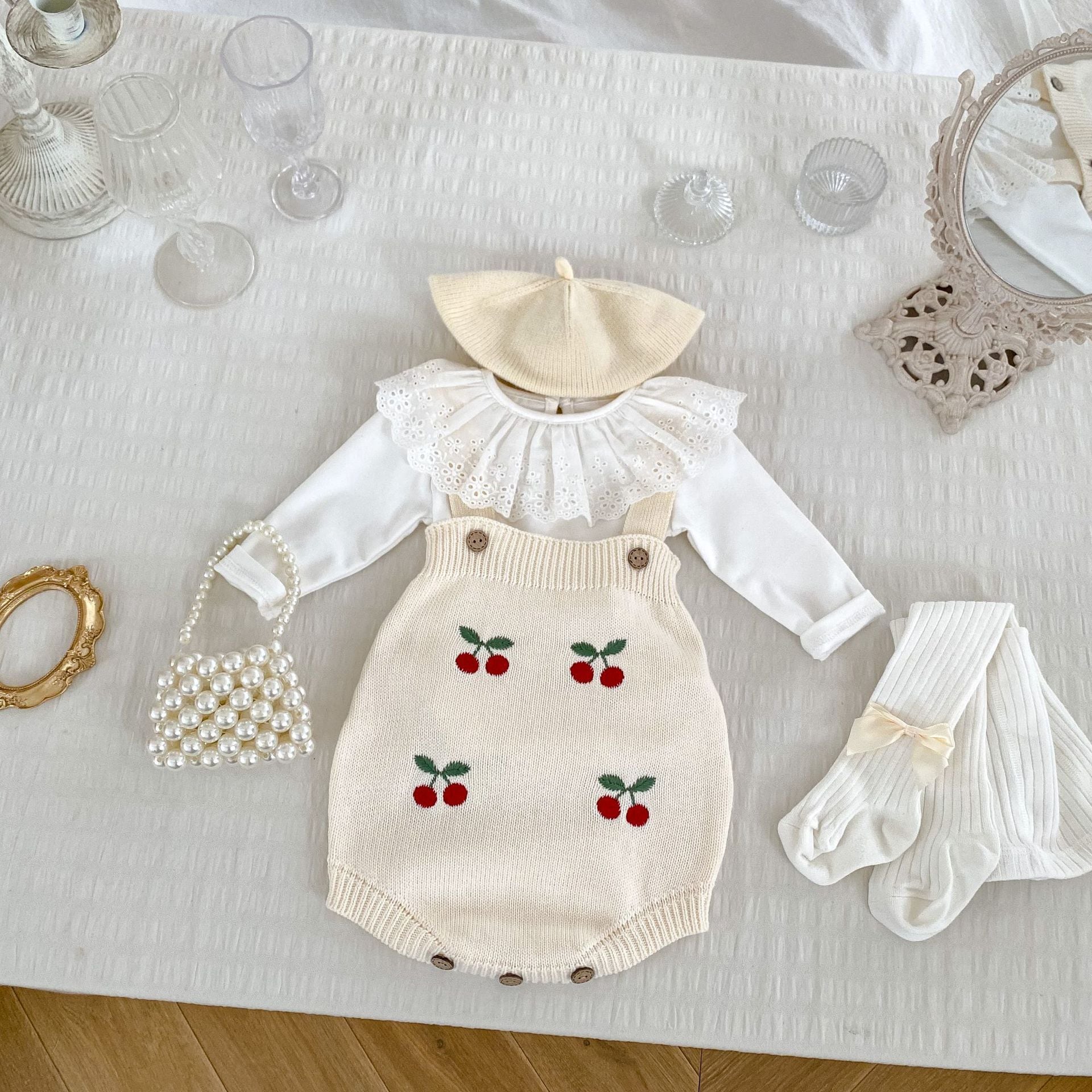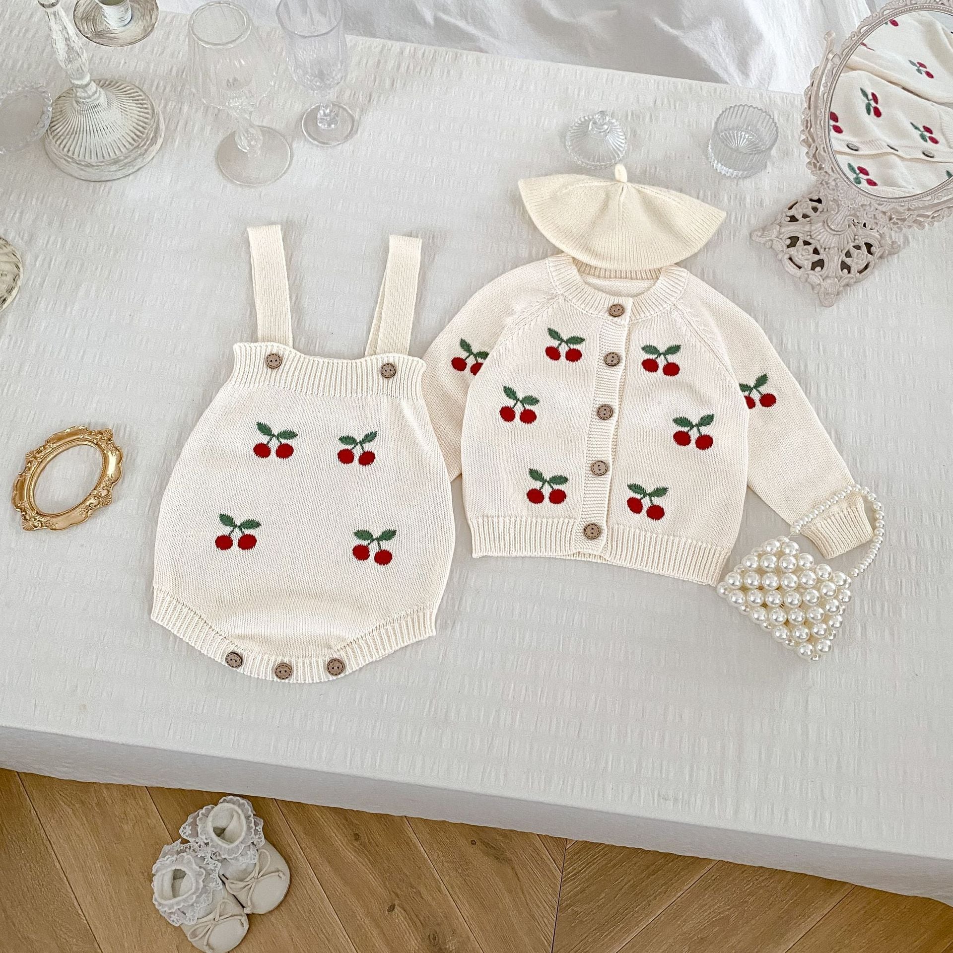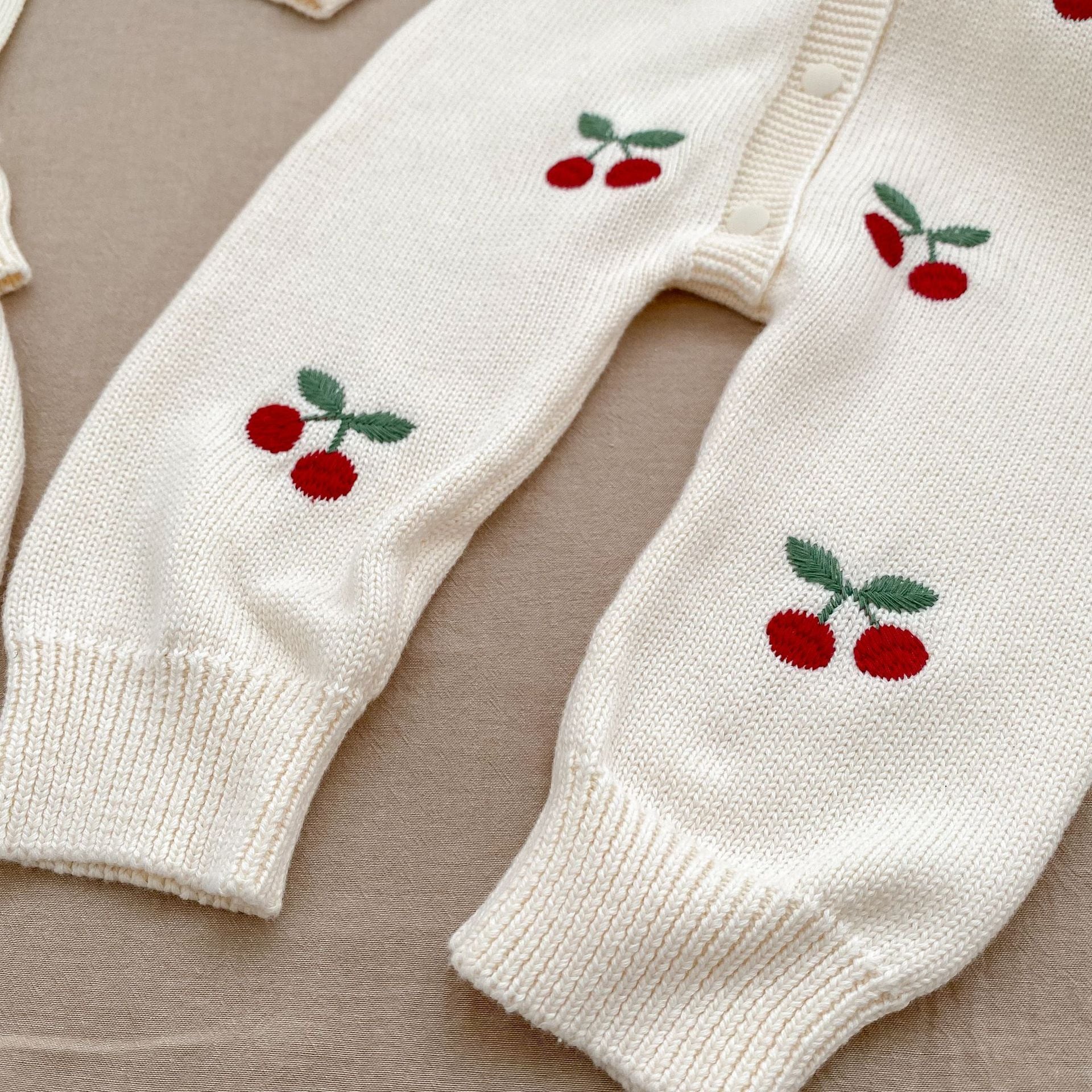 ,ベビー女の子さくらんぼ柄ニット セットアップ カバーオール ロンパース かわいい秋冬ベビー服 お出かけ バースデーフォト lwa0134