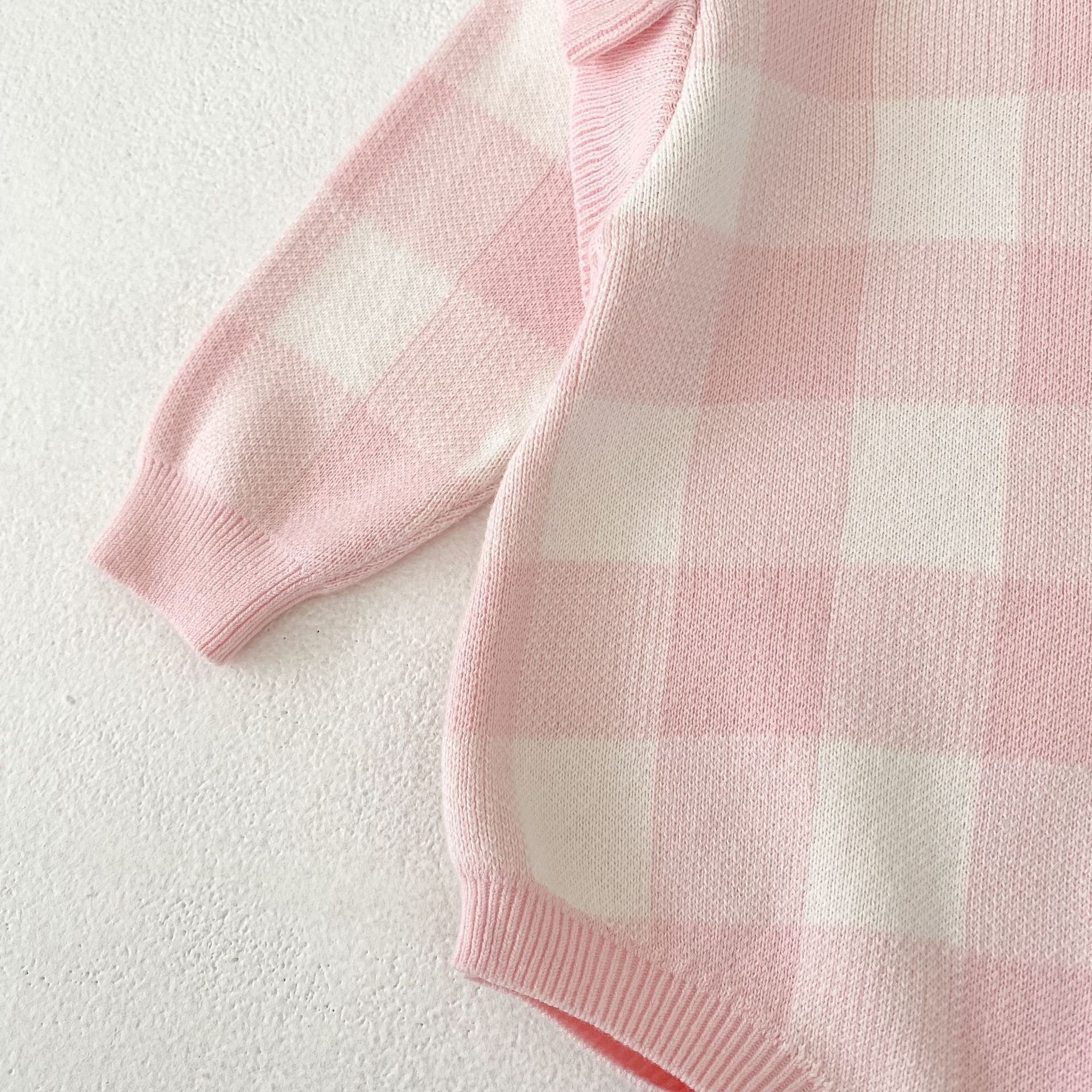 愛らしいピンクのチェック柄が目を引く女の子用ロンパース。