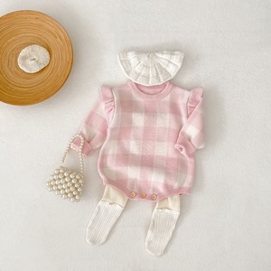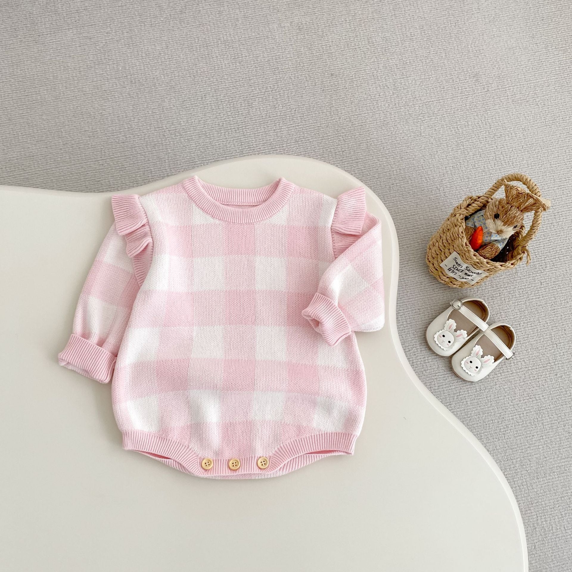 ,ベビー幼児女の子100%綿ピングギンガムチェックニットロンパース フリル肩 かわいい秋冬服 lwb0084