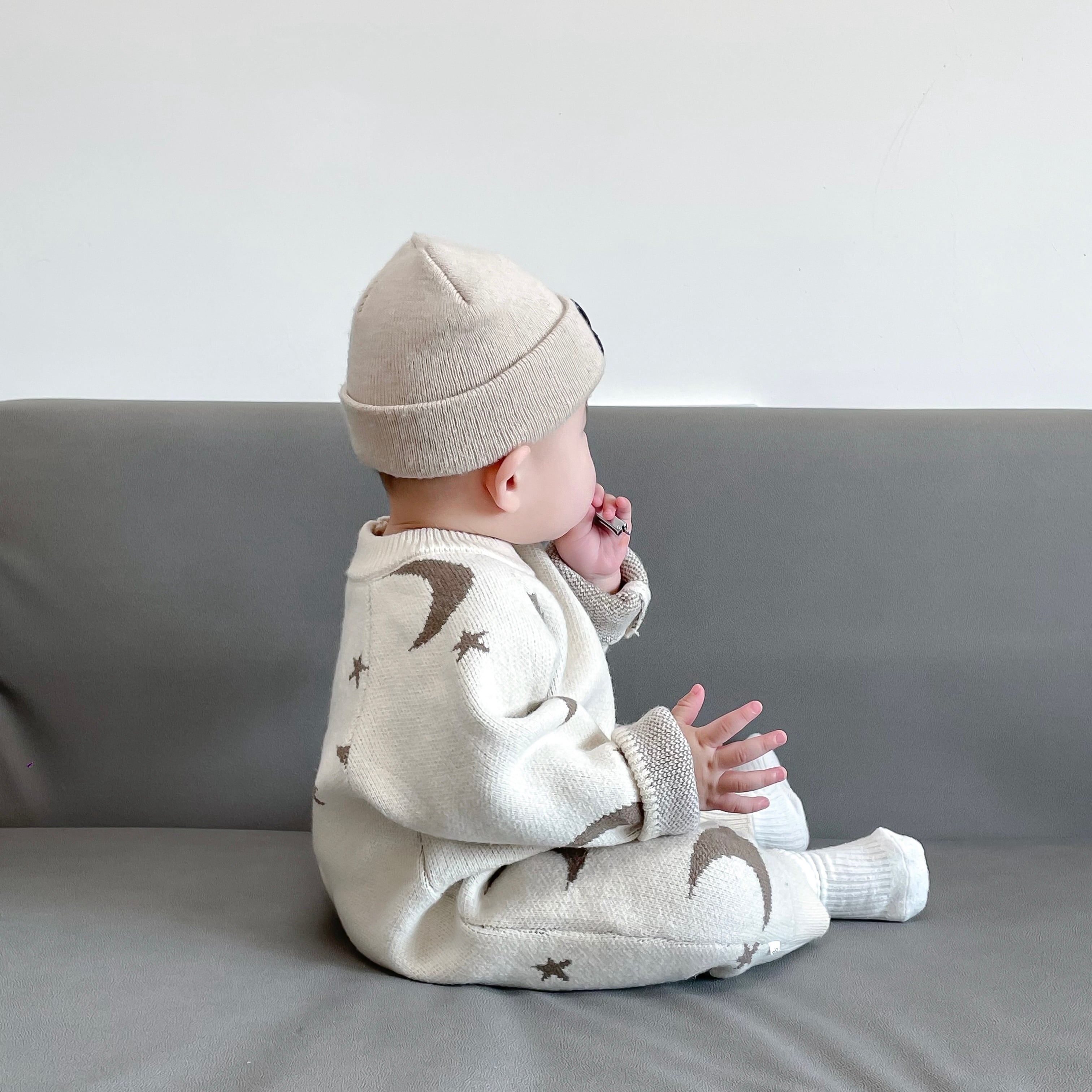 ,ベビー幼児女の子男の子太陽月モチーフニットカバーオール 長袖ロンパース ホワイト オリーブ かわいい秋冬服 lwa0148