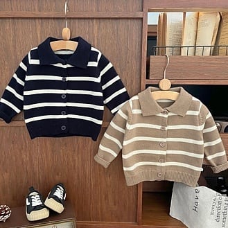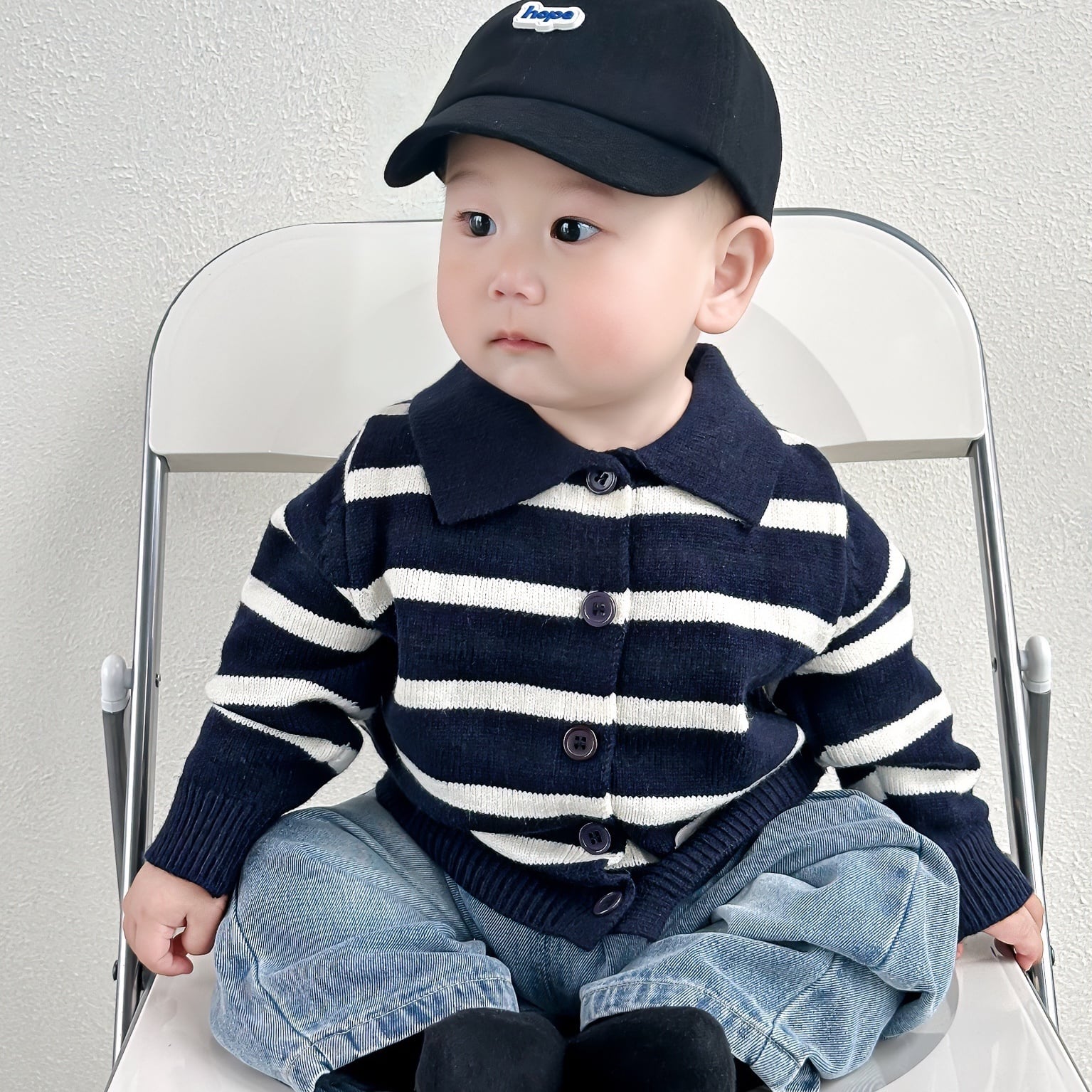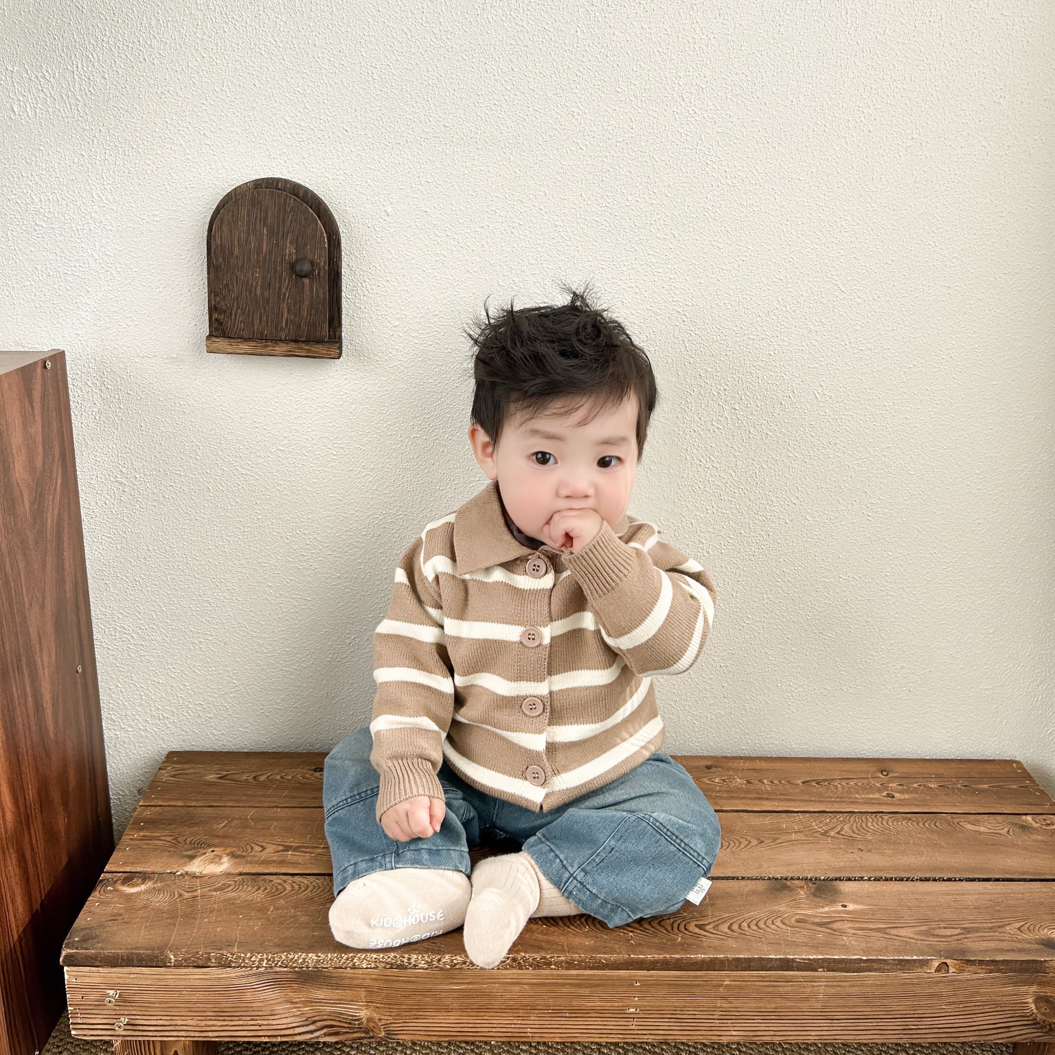 ,ベビー幼児男の子襟付きボーダーニットカーディガン カーキ ネイビー 暖かいアウター かわいい秋冬服 lwa0149
