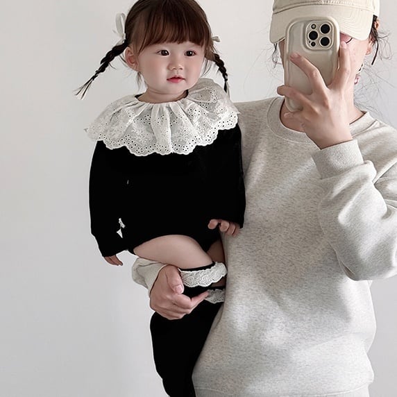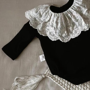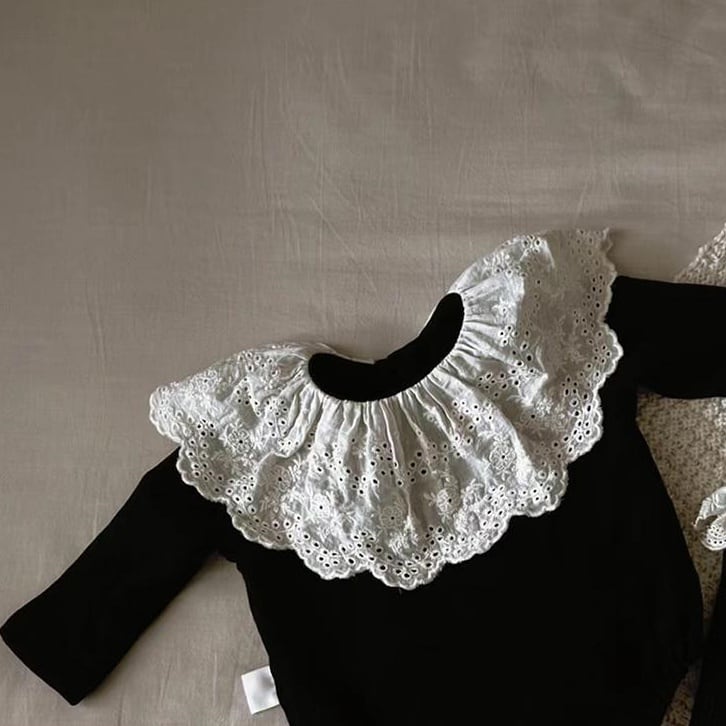 長袖のブラックロンパースは、襟元にホワイトレースのフリルをあしらい、とてもエレガントで華やかな印象に。