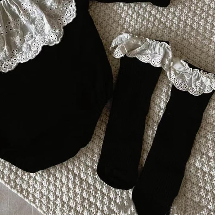 ,ベビー幼児女の子フリルビッグ襟長袖ロンパース ソックス付き ブラック モノトーン かわいい秋冬服 lwa0052