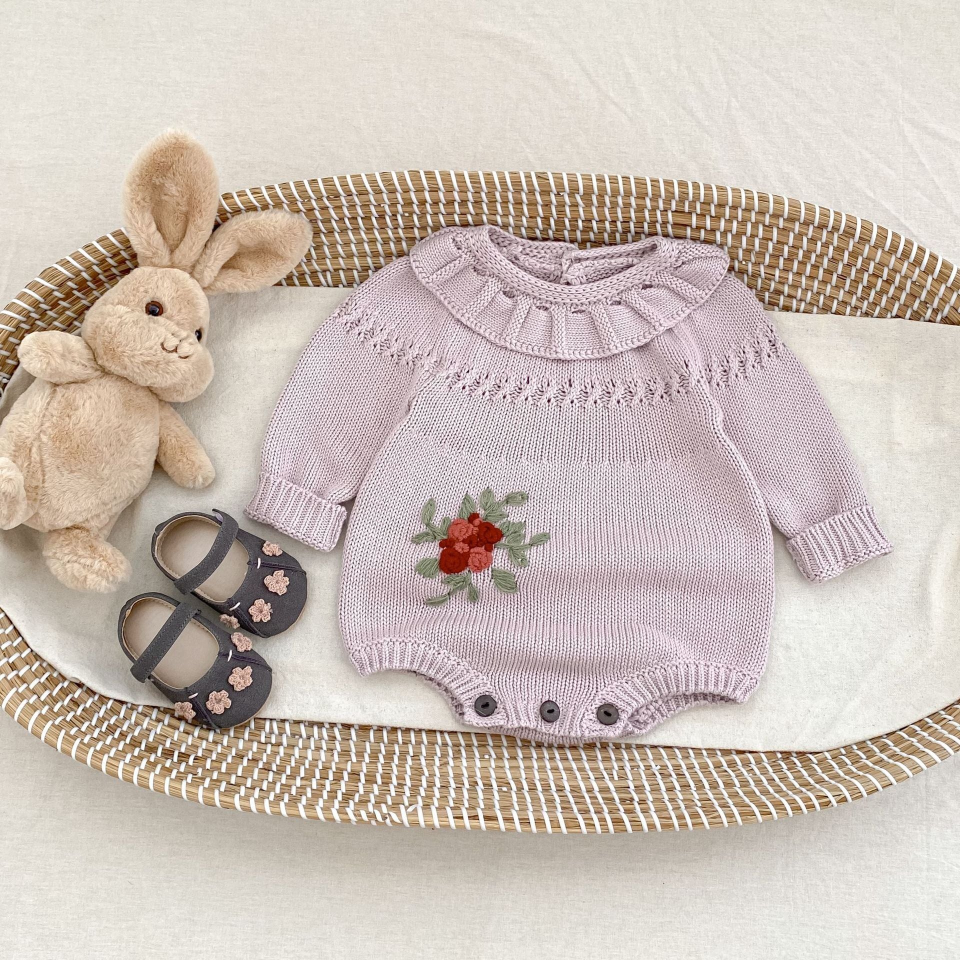 ,ベビー女の子100%綿フリル襟ニットロンパース 花刺繡付き くすみパープル 暖かい秋冬子供服 lwb0033