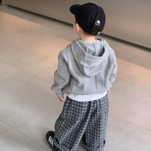 グレーの落ち着いた色合いがおしゃれな、キッズ用ニットパーカー。