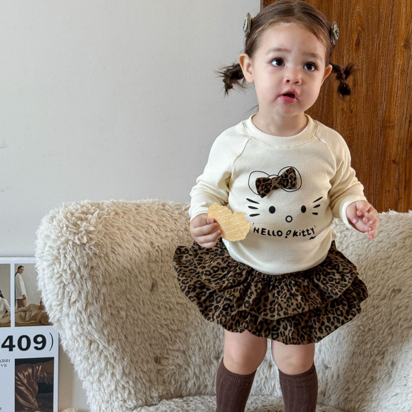 アイボリーの長袖トップスには、大人気キャラクターのキュートなプリントと、アクセントになるレオパード柄のリボンをデザイン。