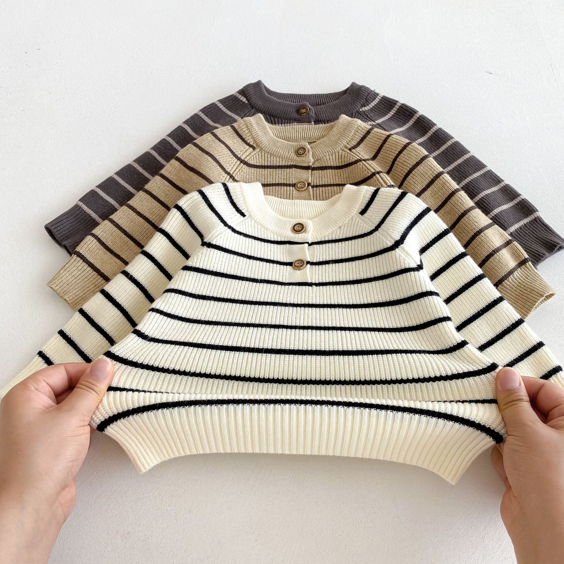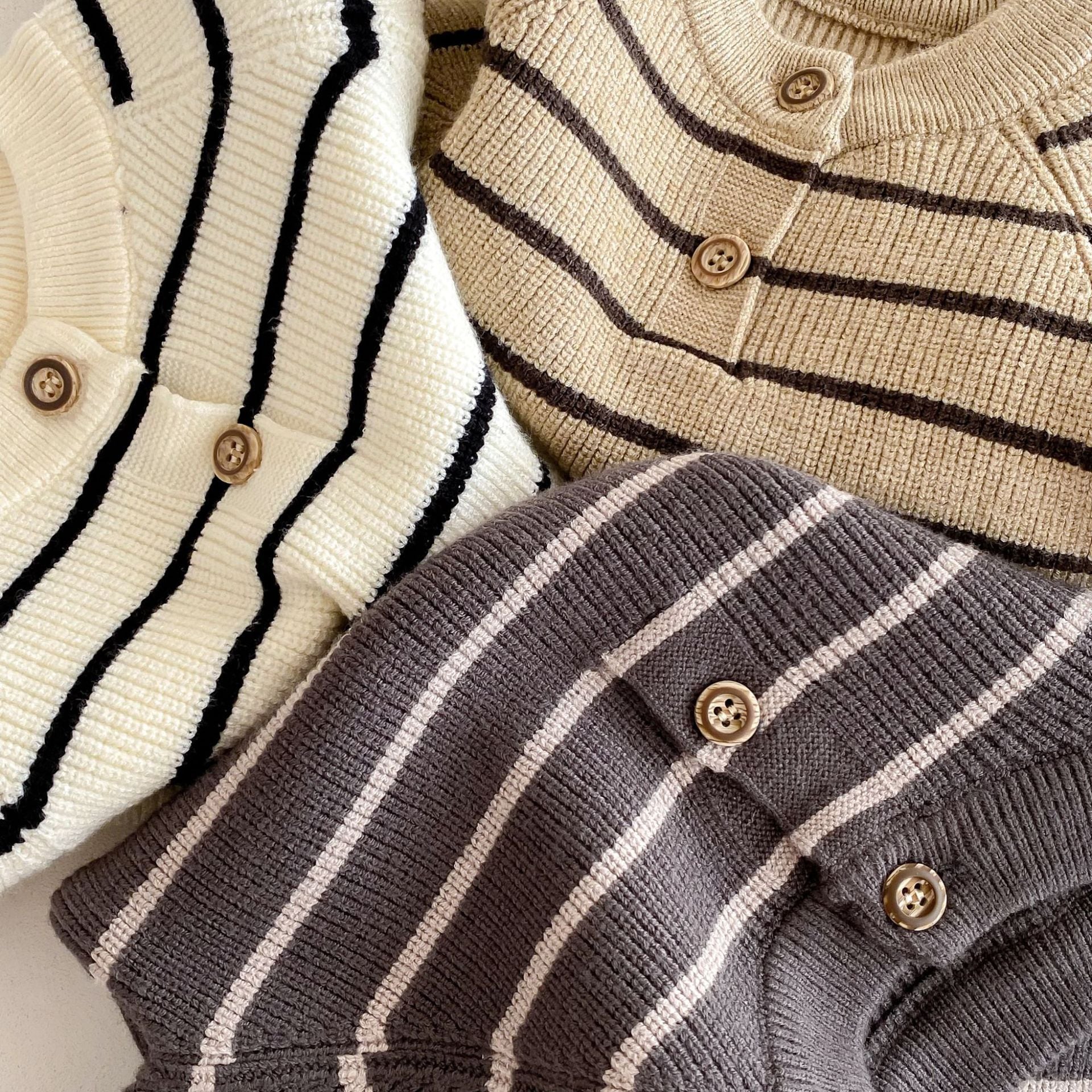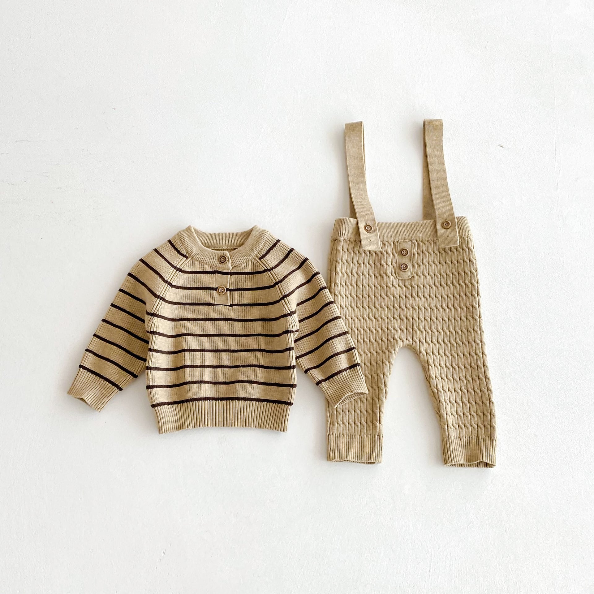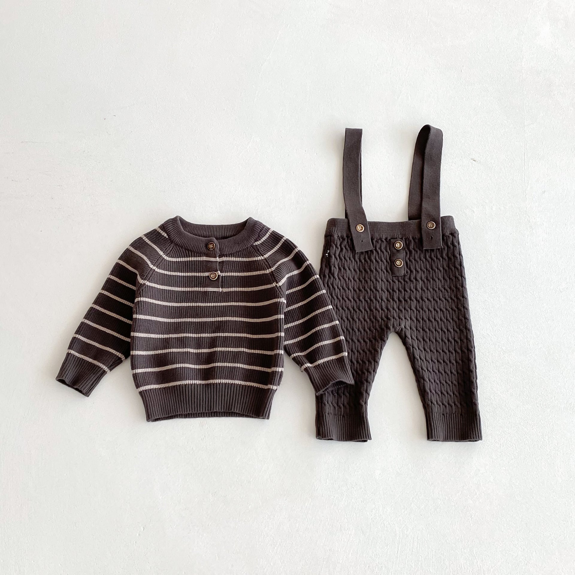 ,ベビー男の子あたたかニット2点セット ボーダーセーター サロペットパンツ ロンパース カーキ ブラウン ブラック lwb0204