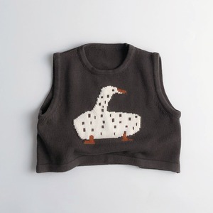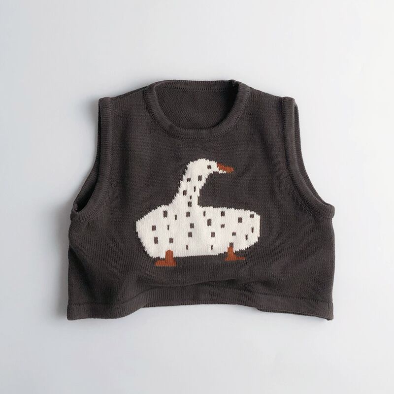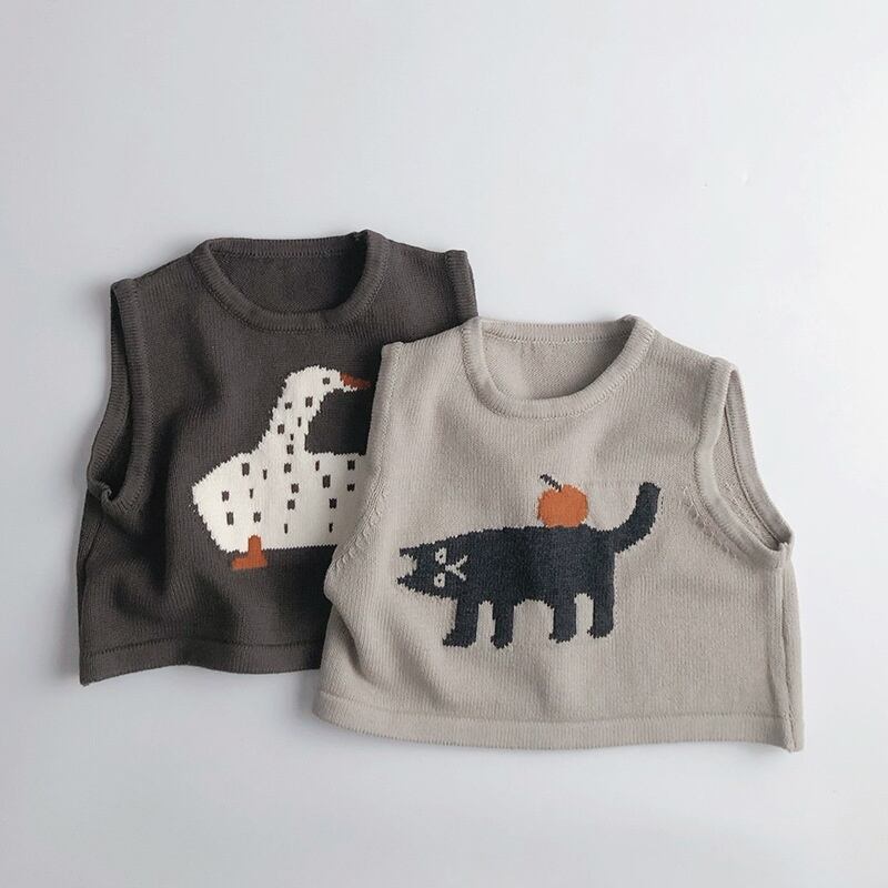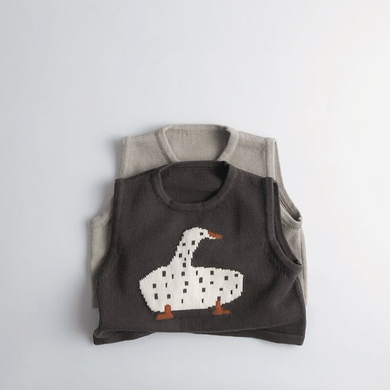 ,幼児キッズ女の子男の子100%綿ねこアヒルモチーフニットベスト あたたか秋冬トップス ライトグレー ダークグレー lwk0009