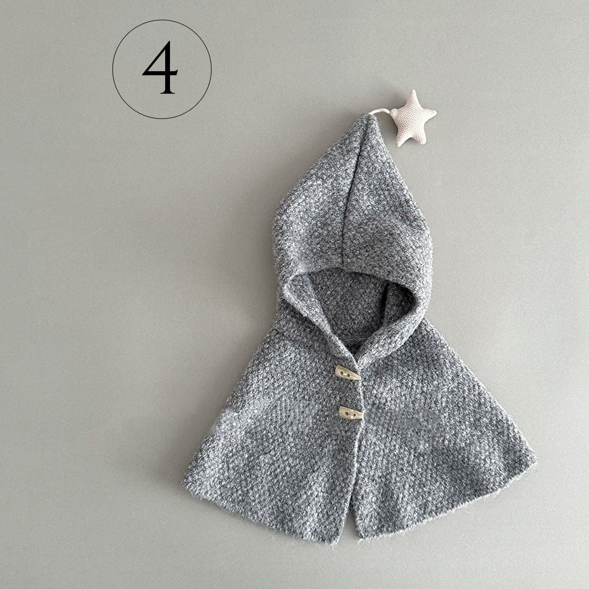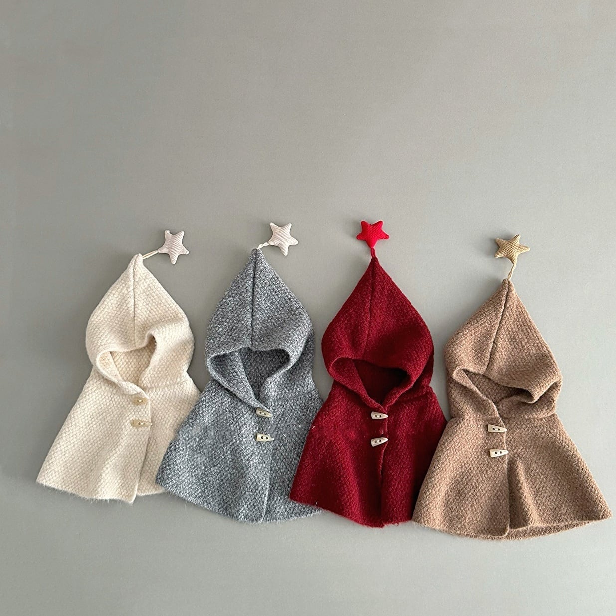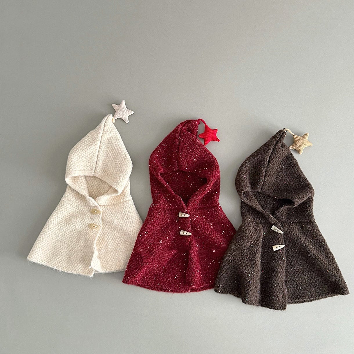,幼児キッズ女の子男の子星フード付きニットポンチョ ケープ クリスマスコーデ ホワイト レッド ブラウン グレー 防寒グッズ lwa0122