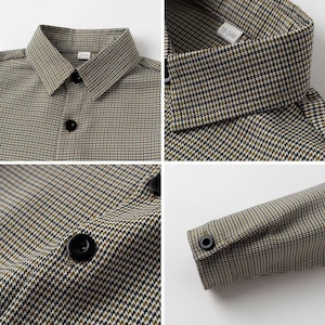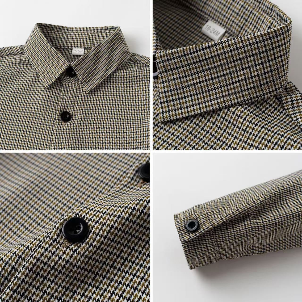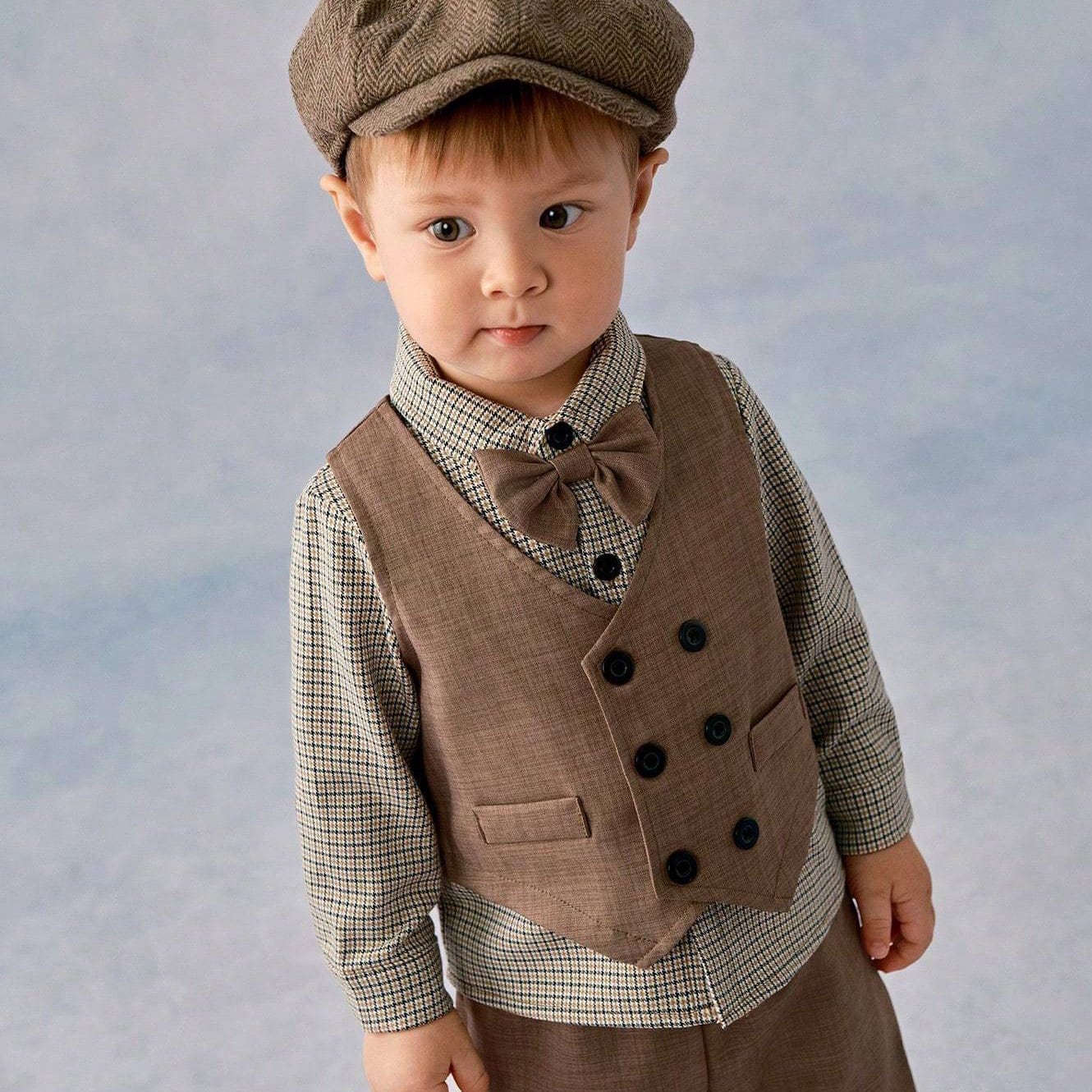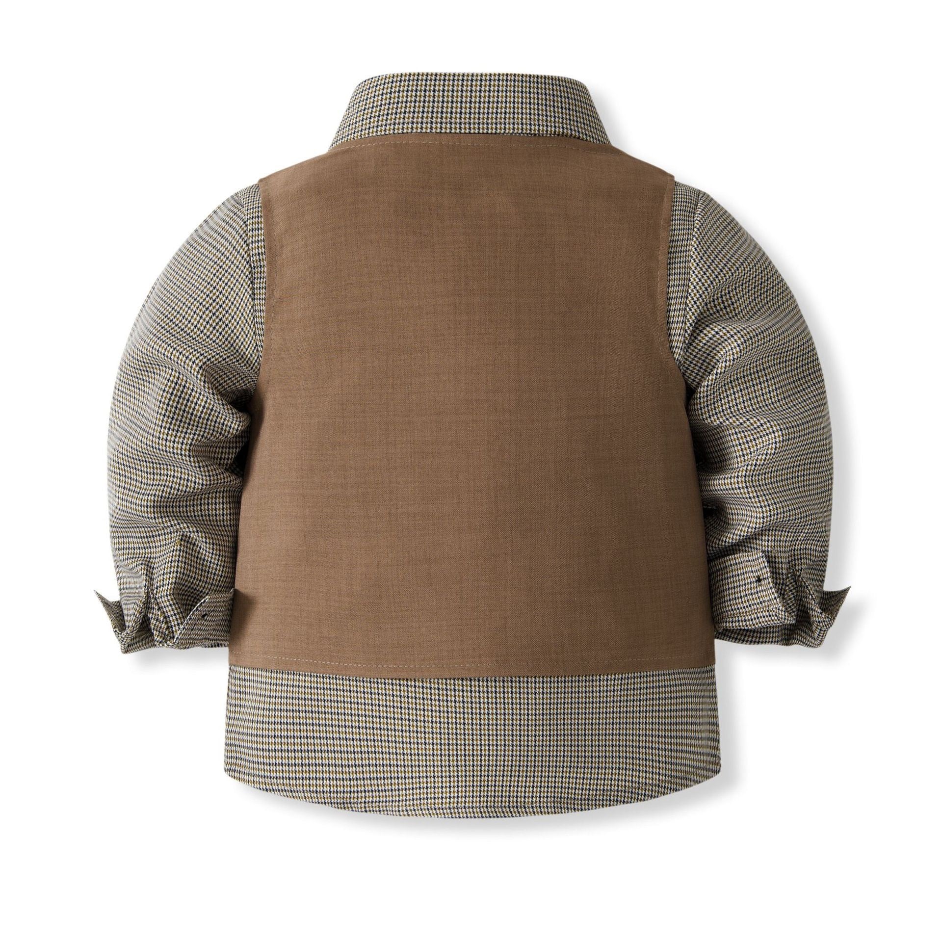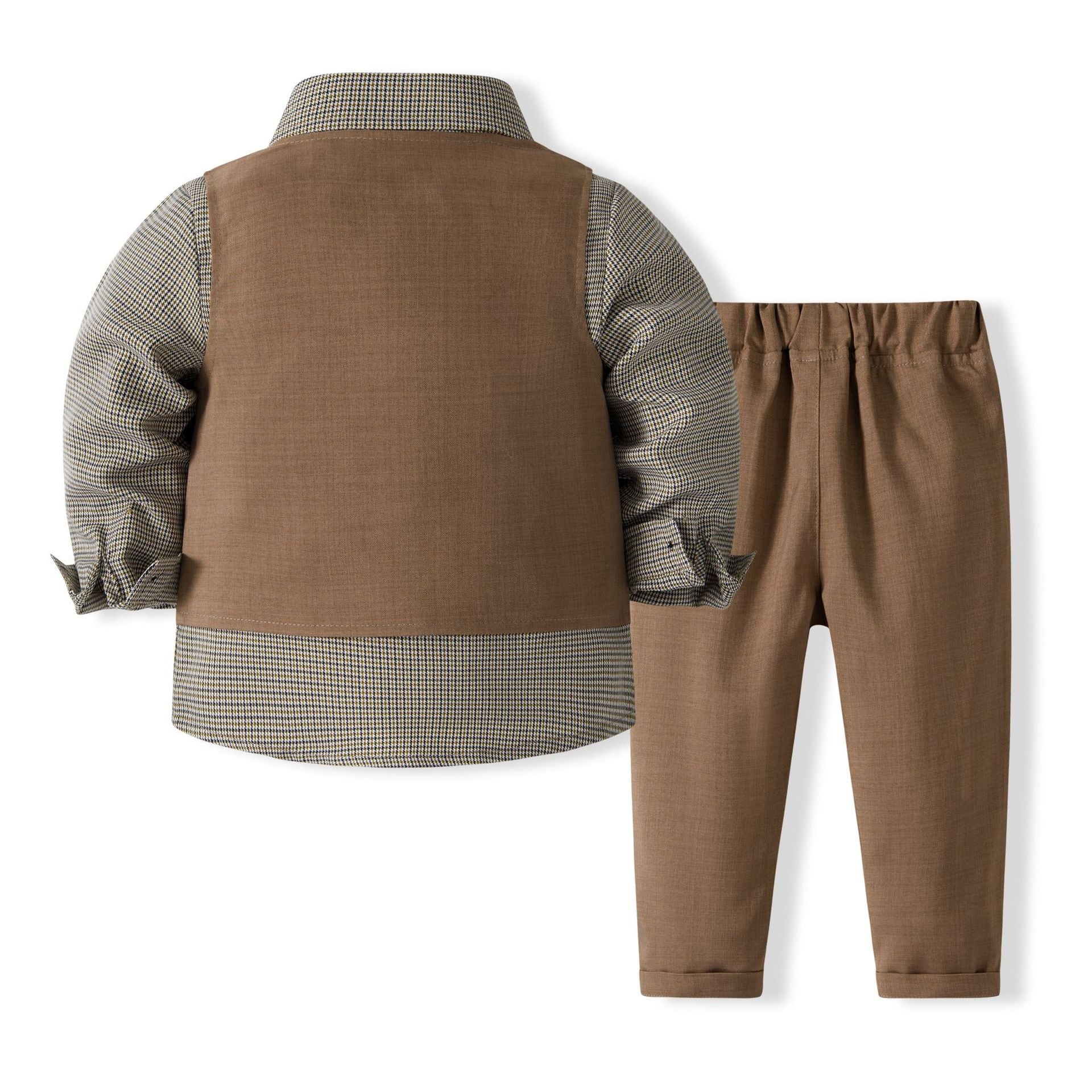 シャツは落ち着いたグレーのチェック柄で、ブラウンのベストとパンツは統一感があり、