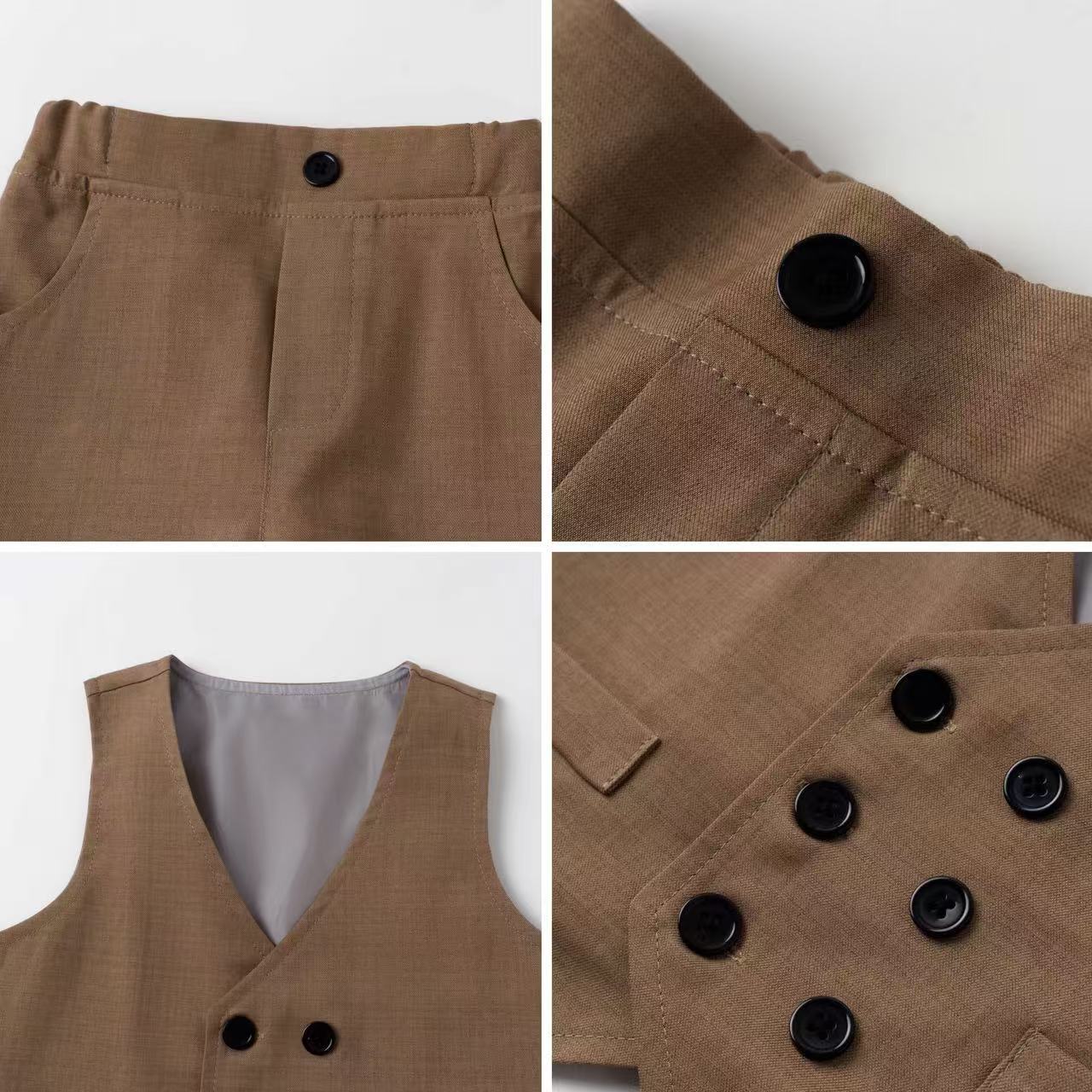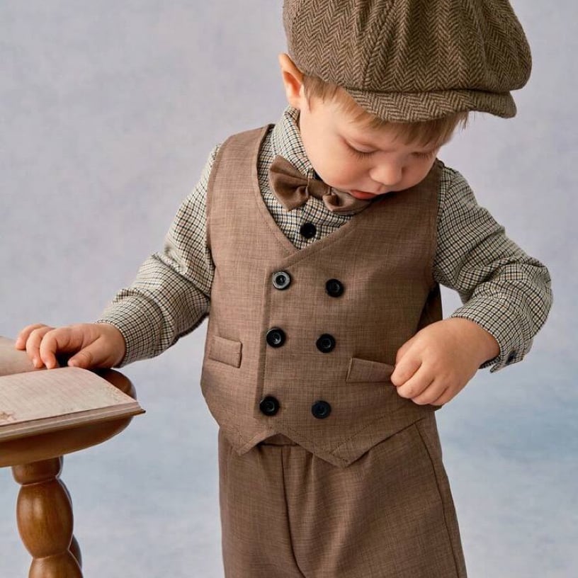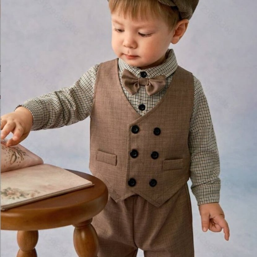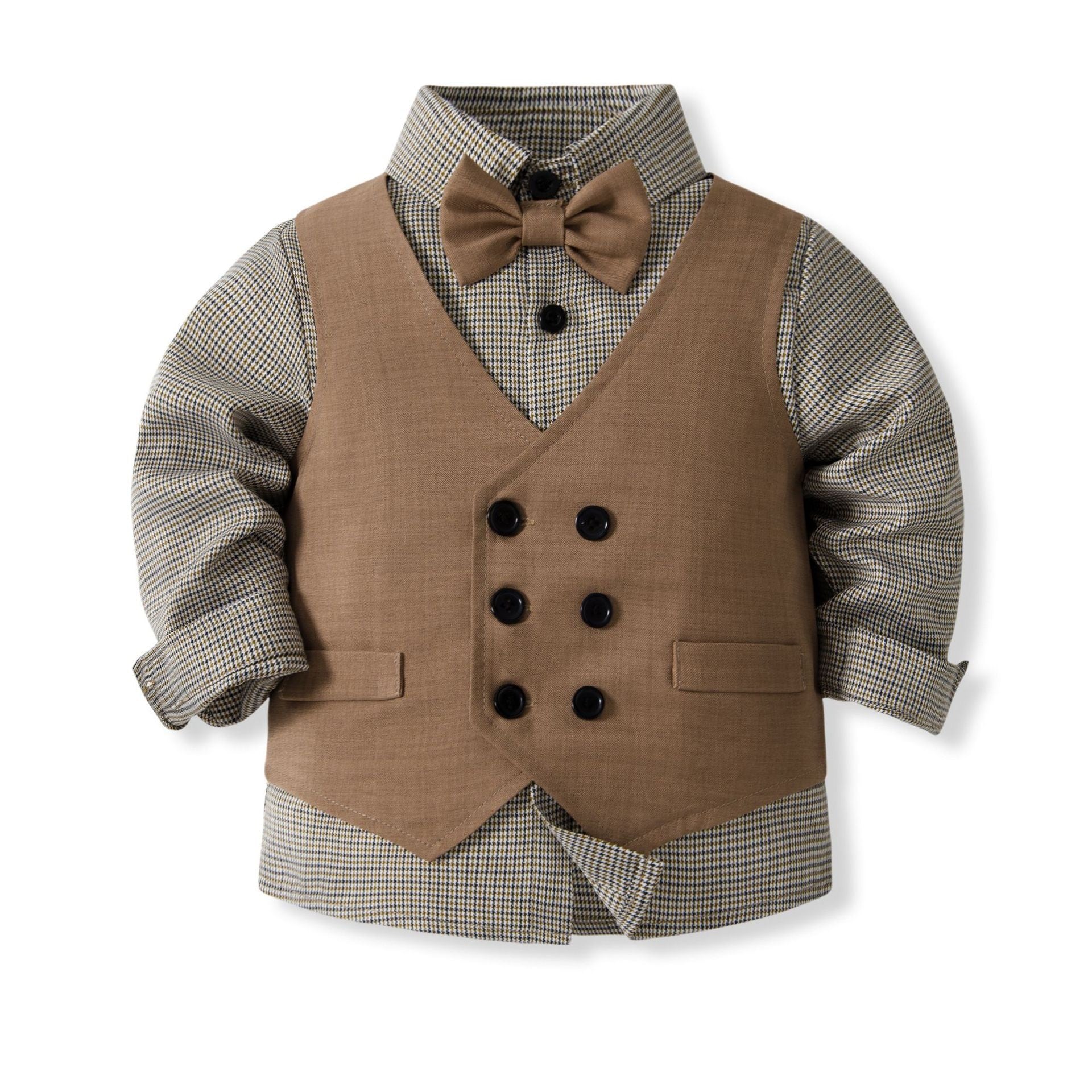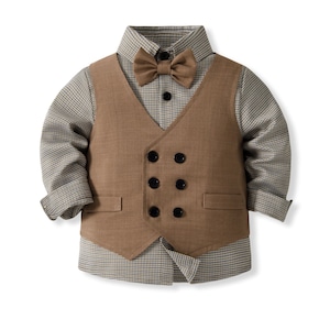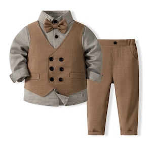 ,幼児キッズ男の子スーツ4点セット 蝶ネクタイ付きシャツ ベスト 長ズボン フォーマルウエア 発表会 入園入学式 結婚式 ブラウン lwk0072