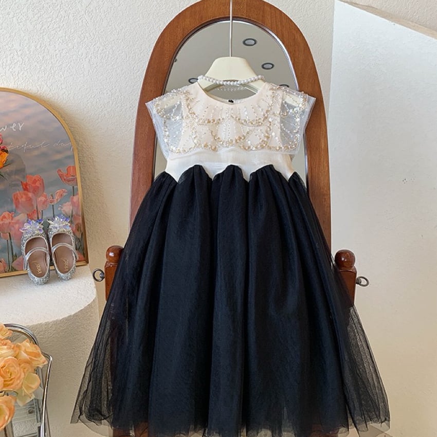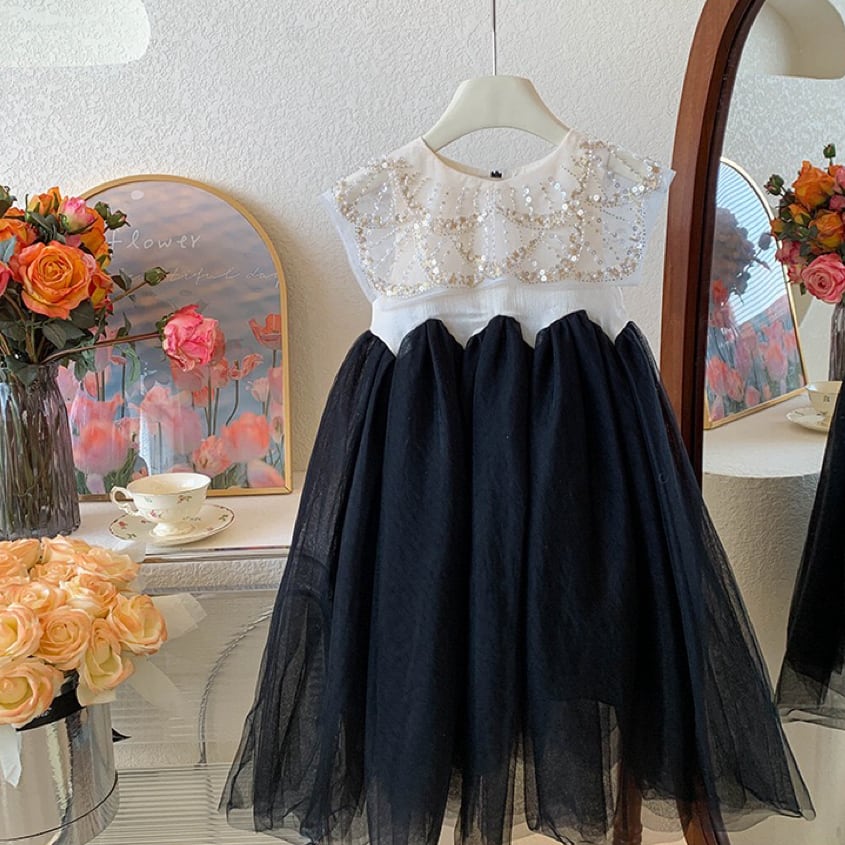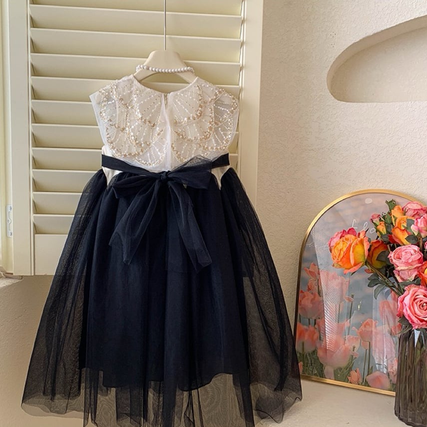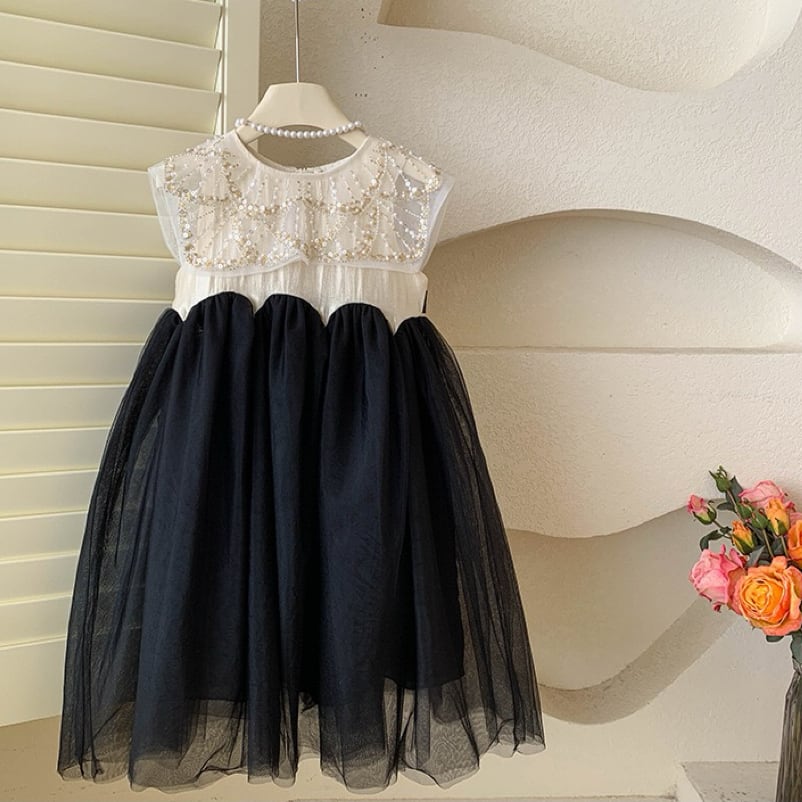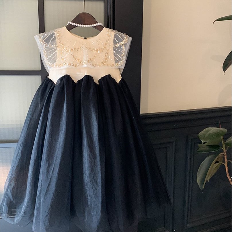 ,キッズ女の子フノースリーブドレスワンピース チュール アイボリー ブラック 誕生日 発表会 lwk0070