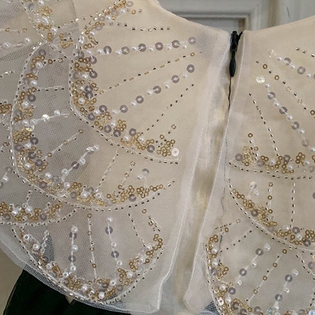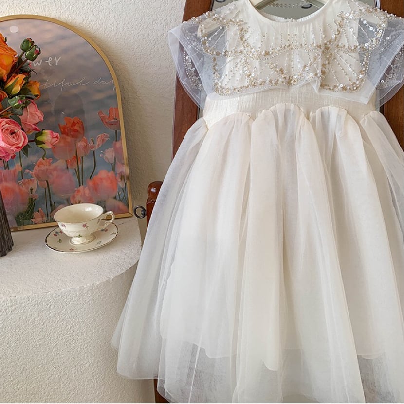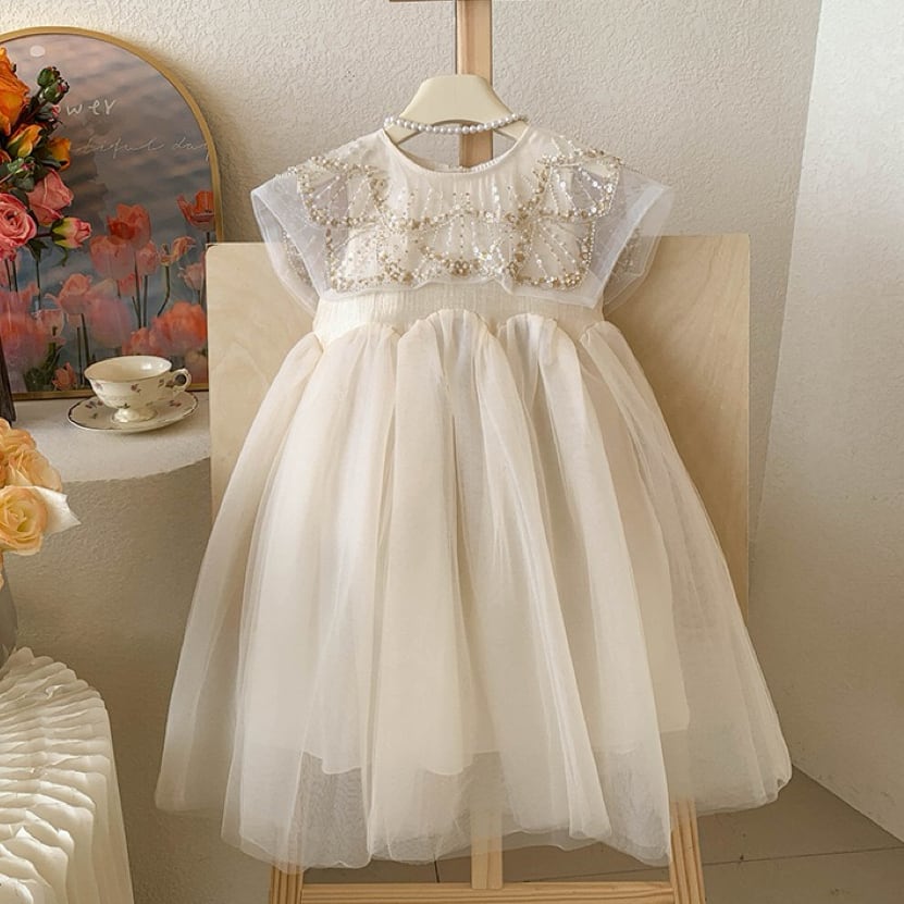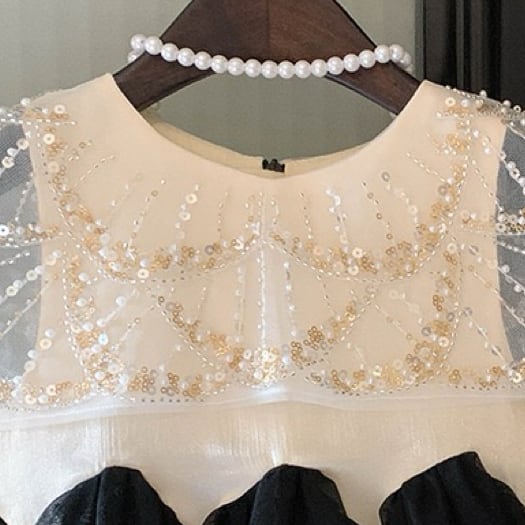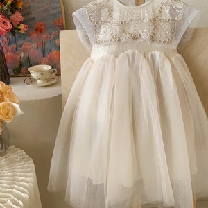 キラキラ輝くスパンコール付きビッグ襟が特徴の女の子用ドレスワンピース。