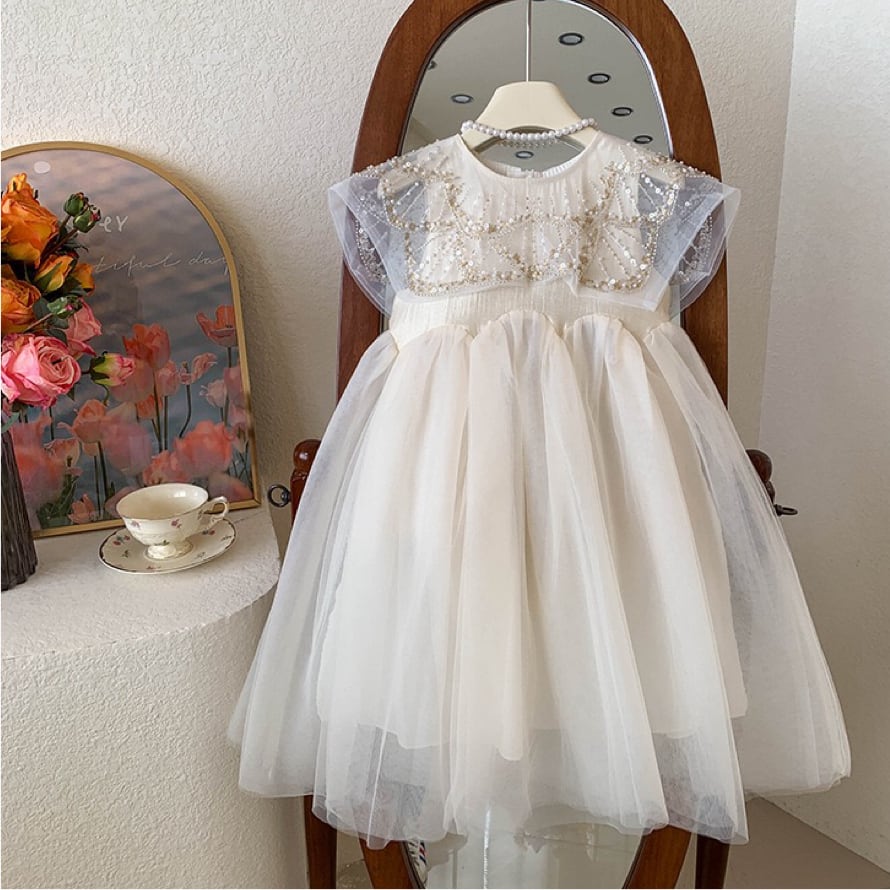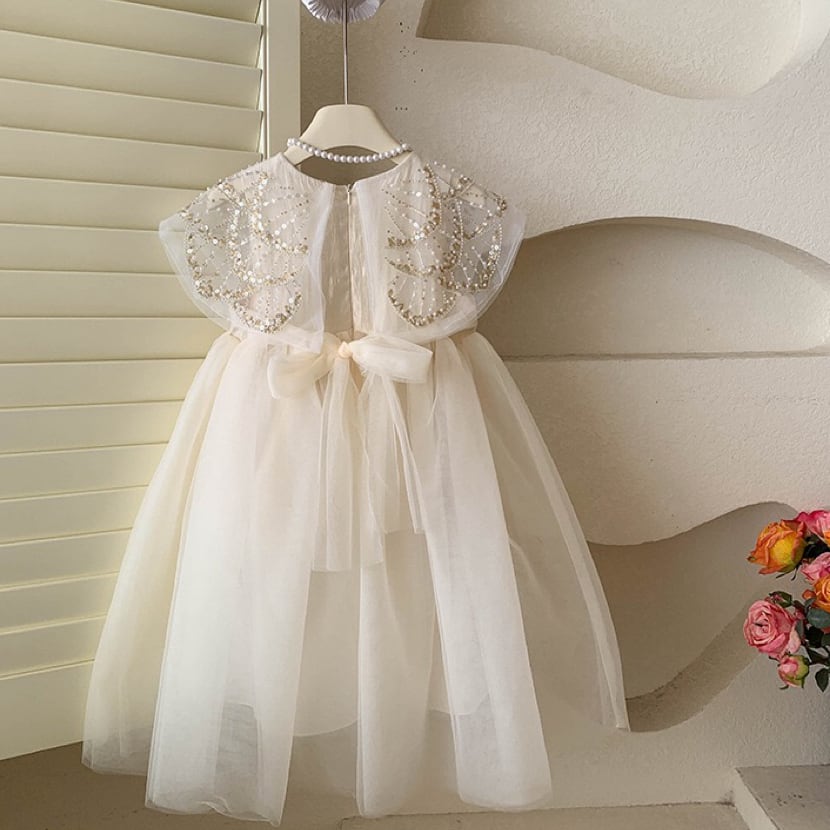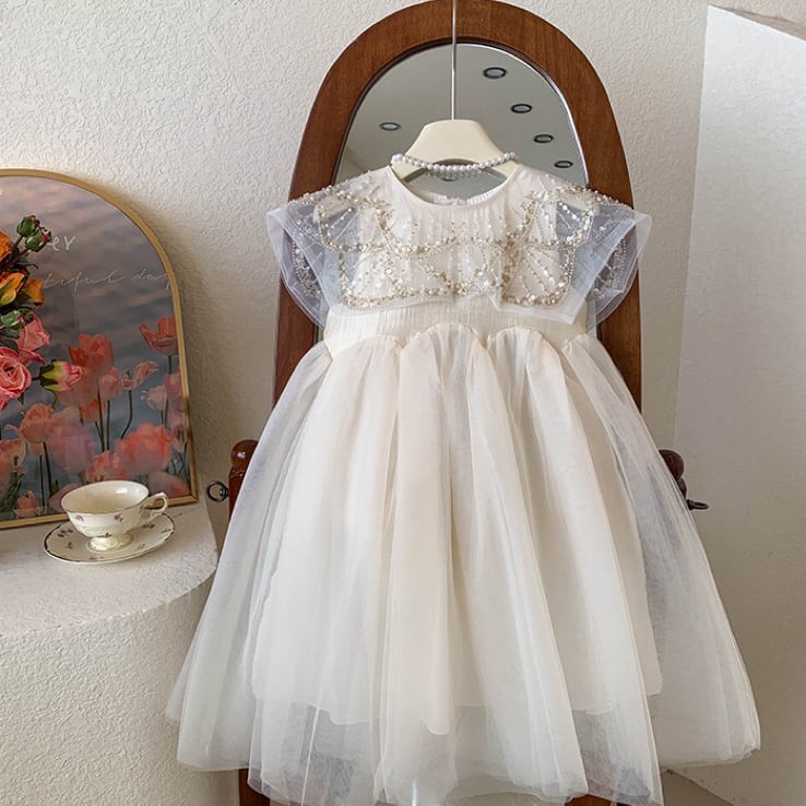 柔らかなチュール生地がふんわりとしたシルエットを作り出し、動くたびに愛らしさを引き立てます。