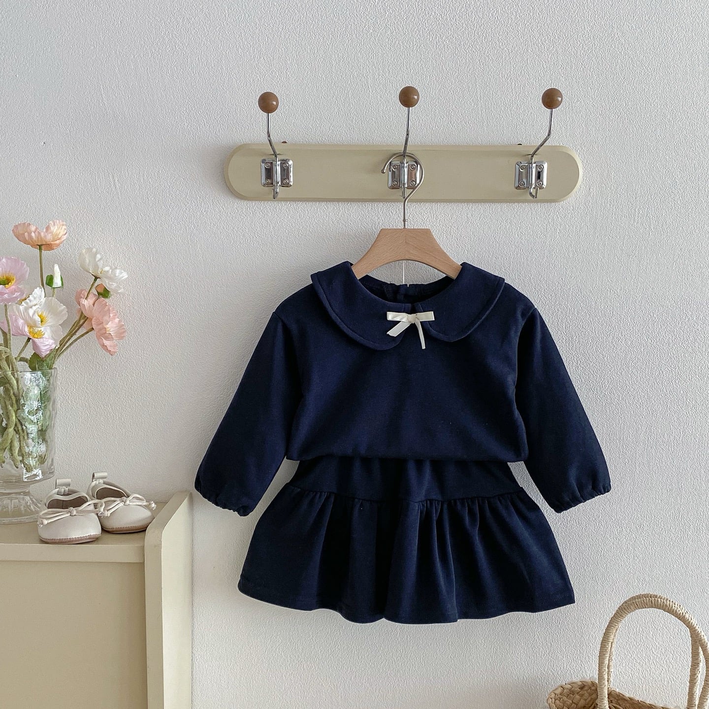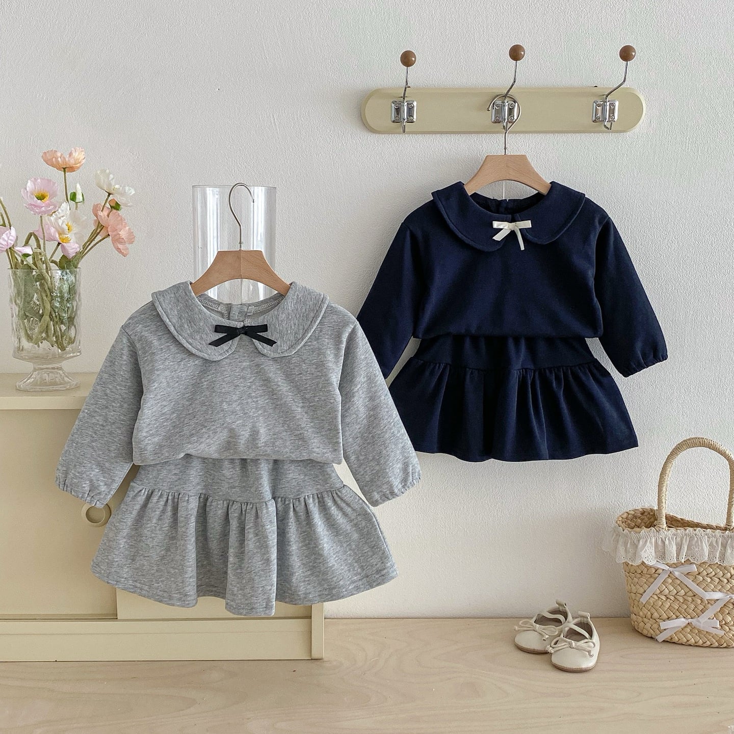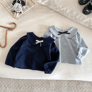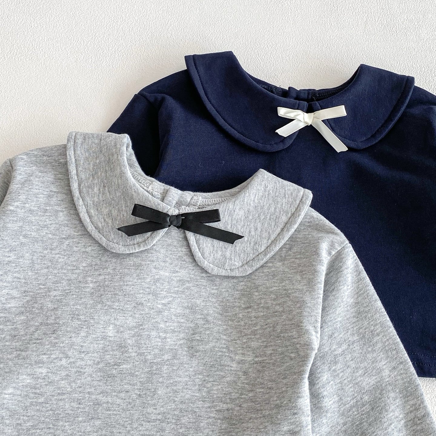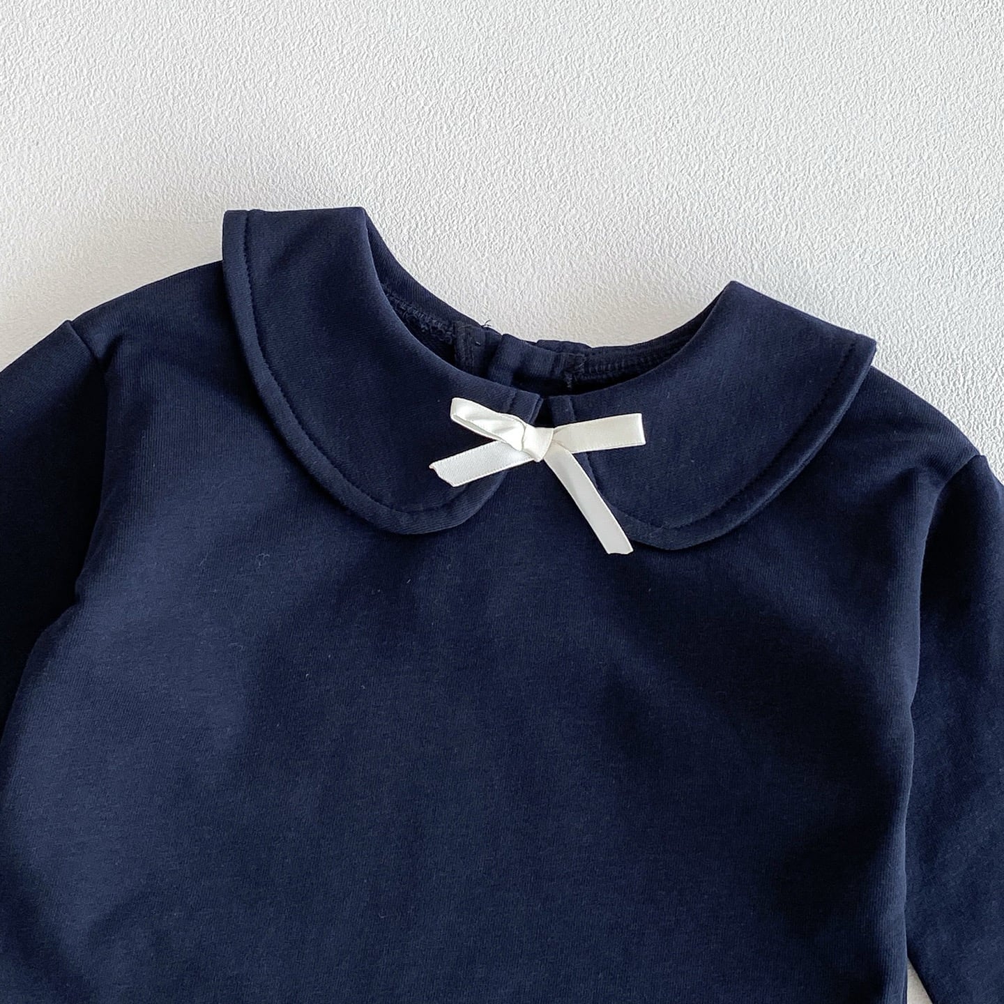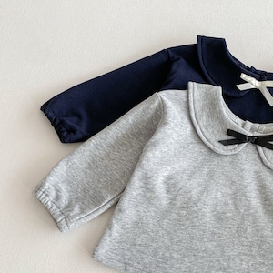 トップスは長袖仕様で、首元には可愛らしいリボンとフリルをあしらい、さりげなく女の子らしさを演出。
