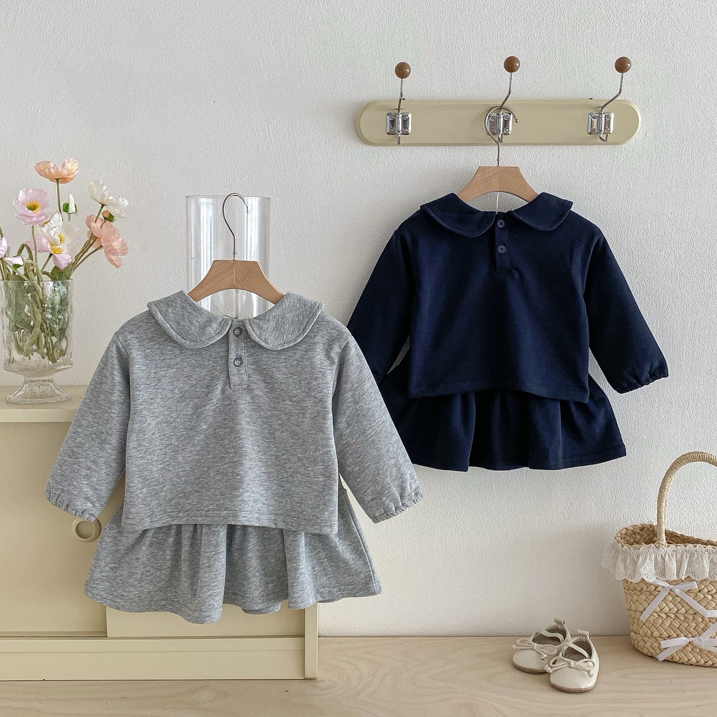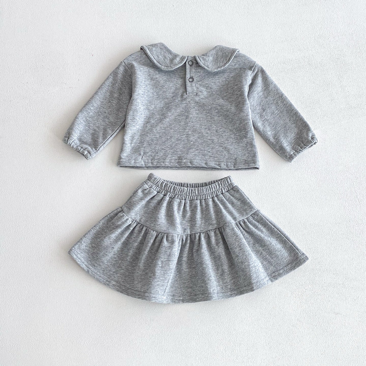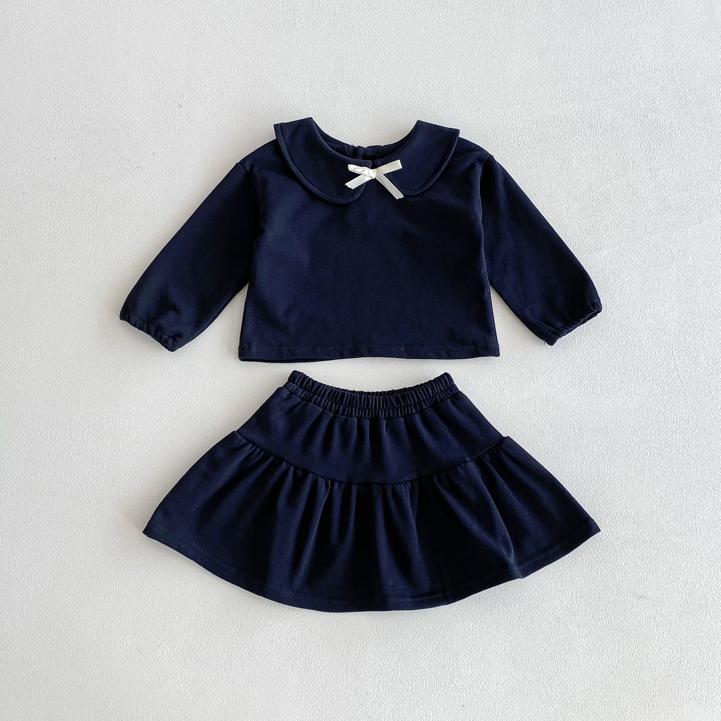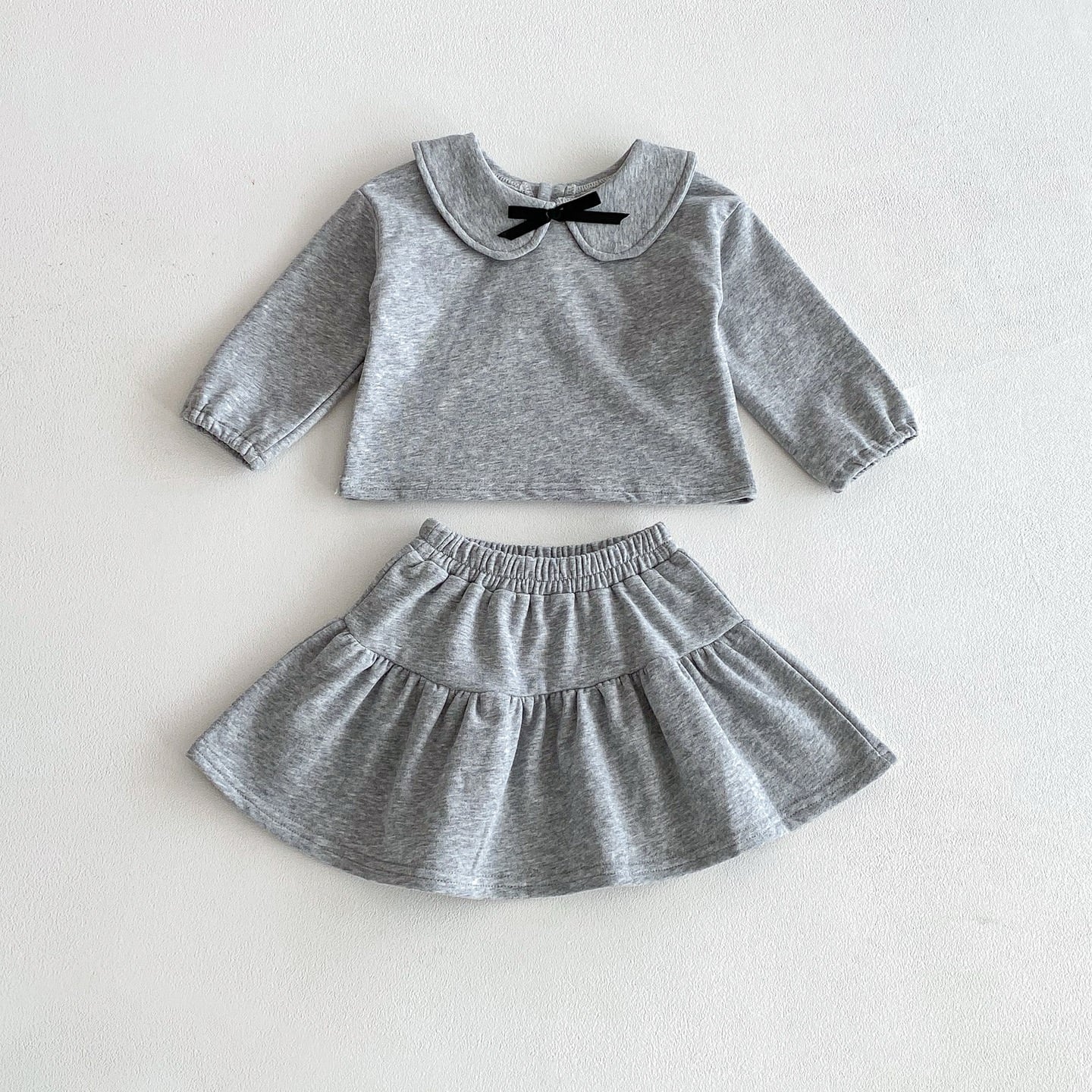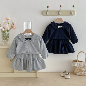 トップスとスカートの2点セットで、カラーは上品なグレーと落ち着いたネイビーの2色をご用意しました。