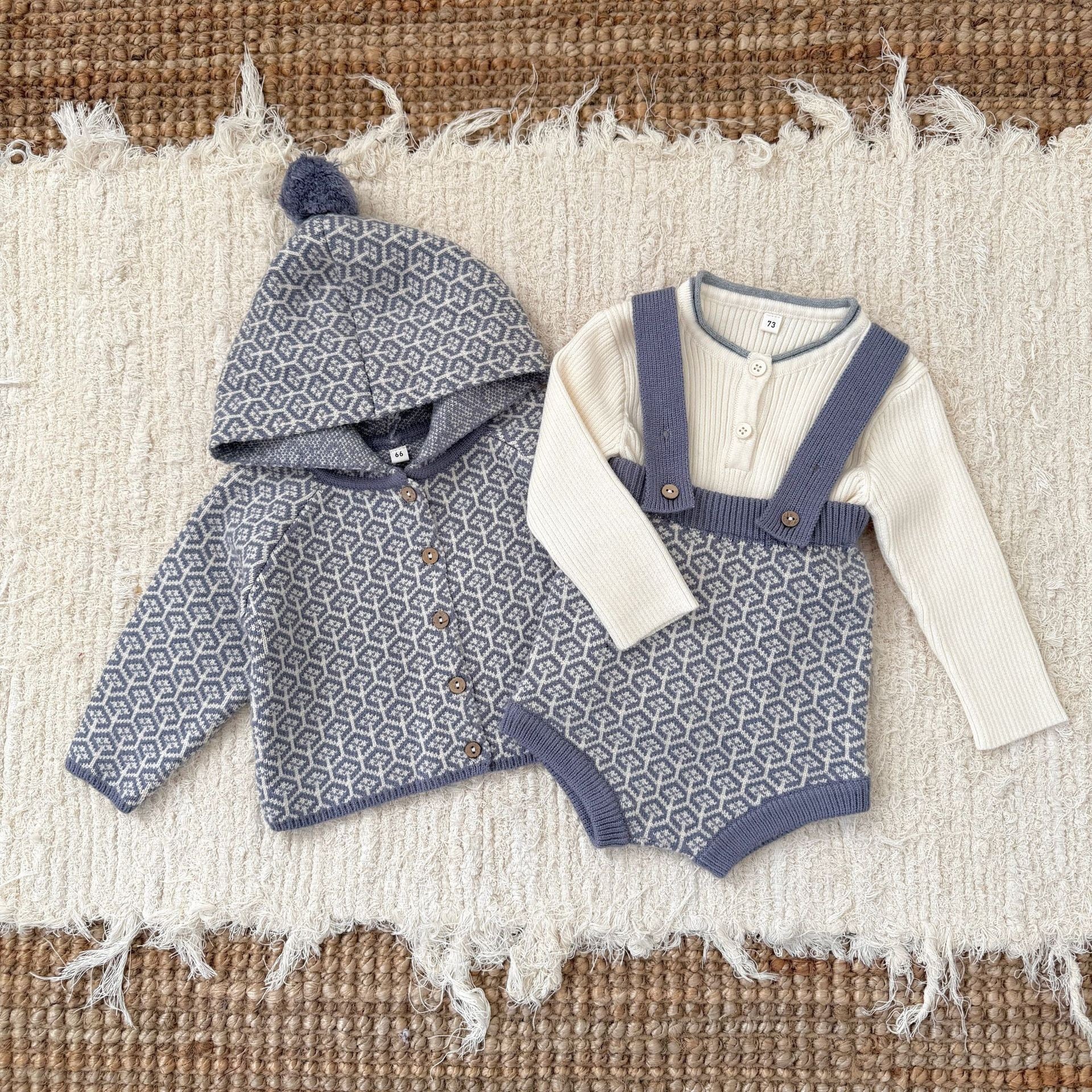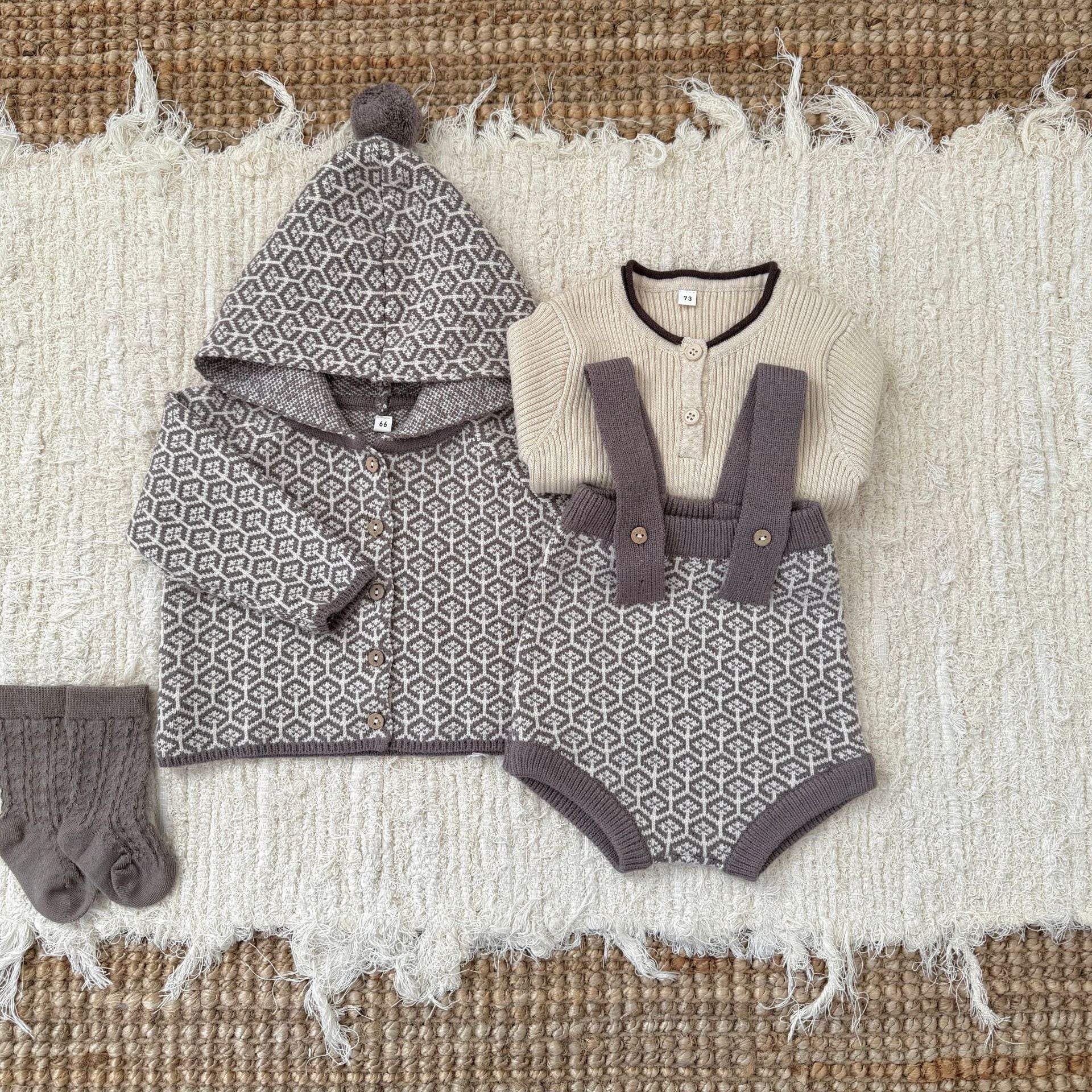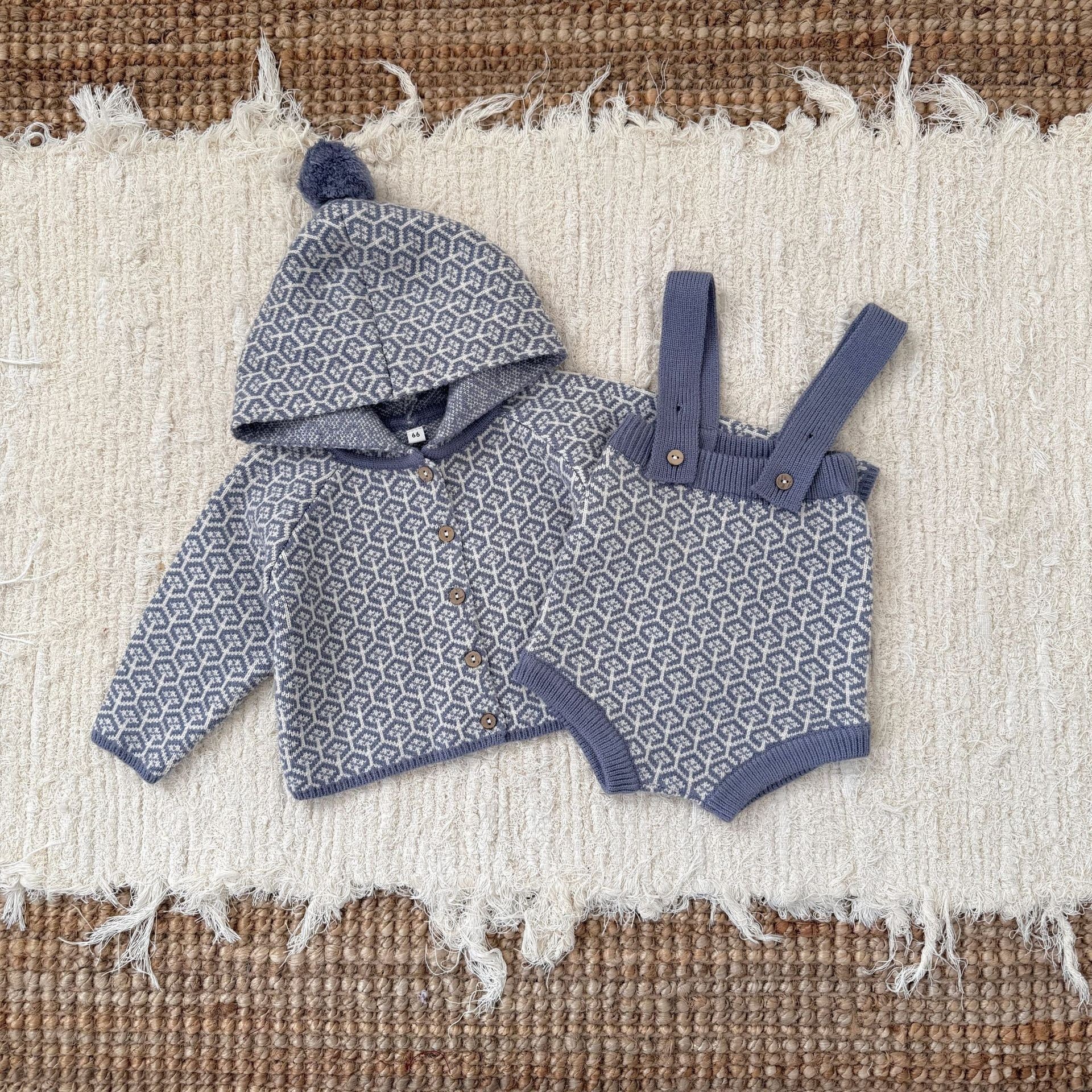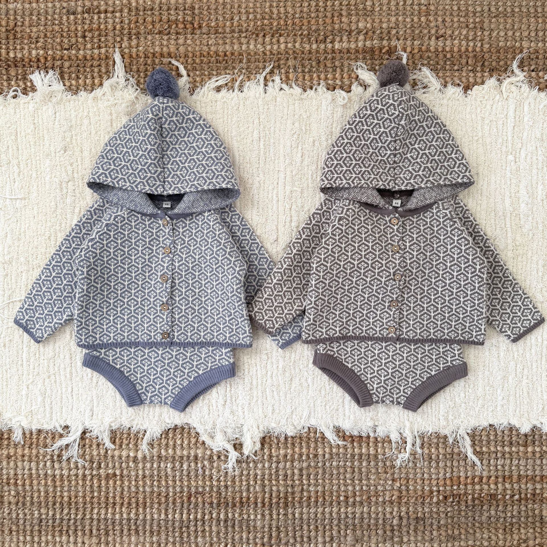 ,ポンポンフード付き レトロ柄ニットセットアップ