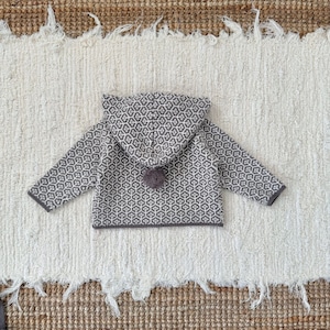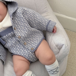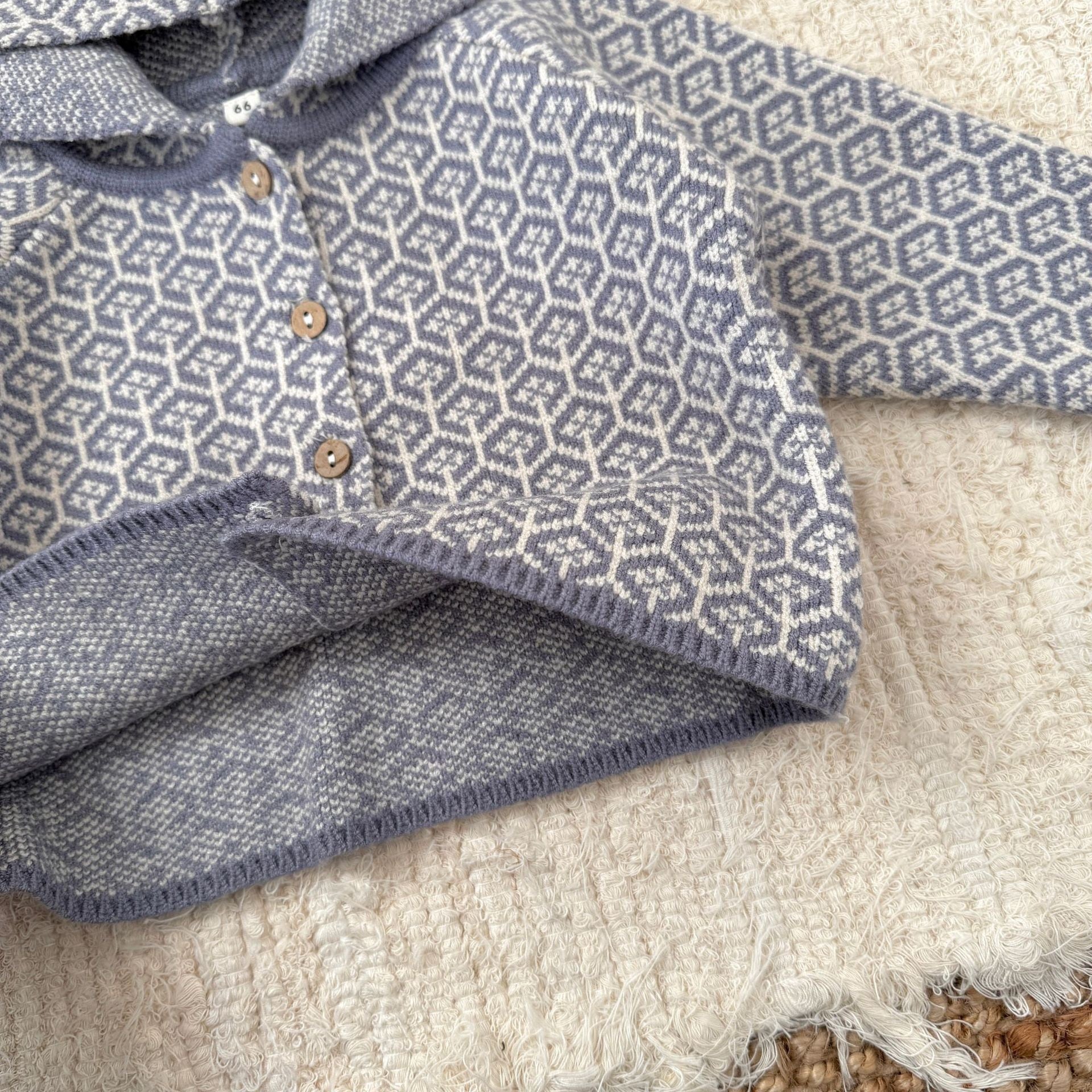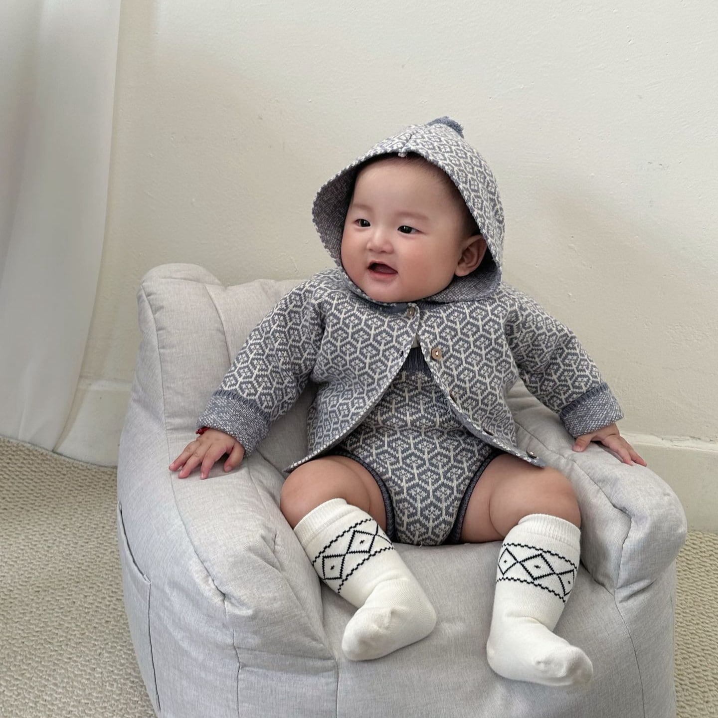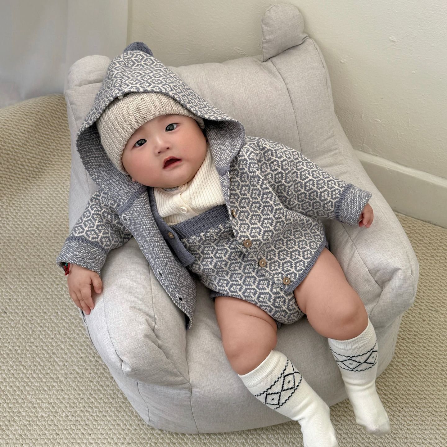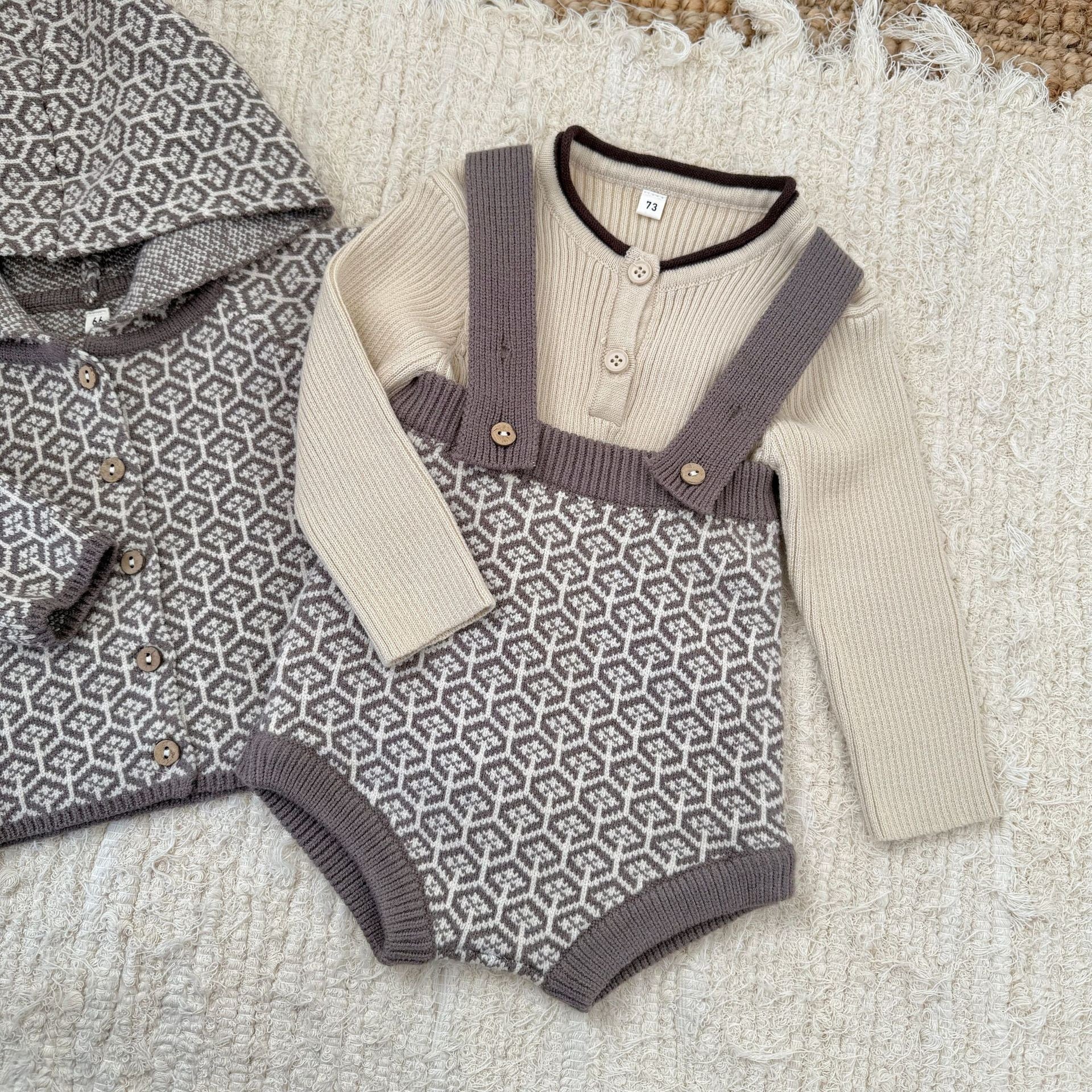 ,ポンポンフード付き レトロ柄ニットセットアップ