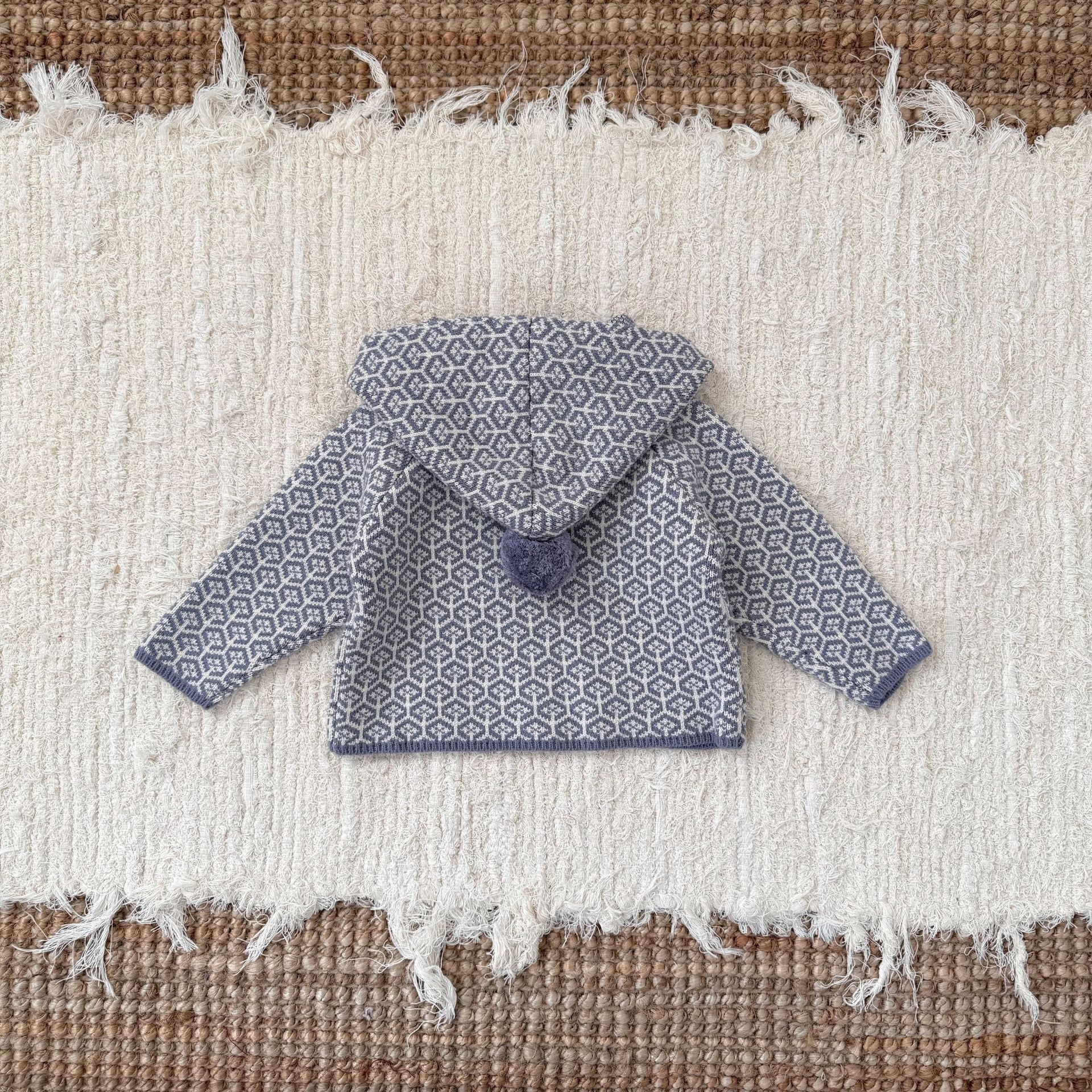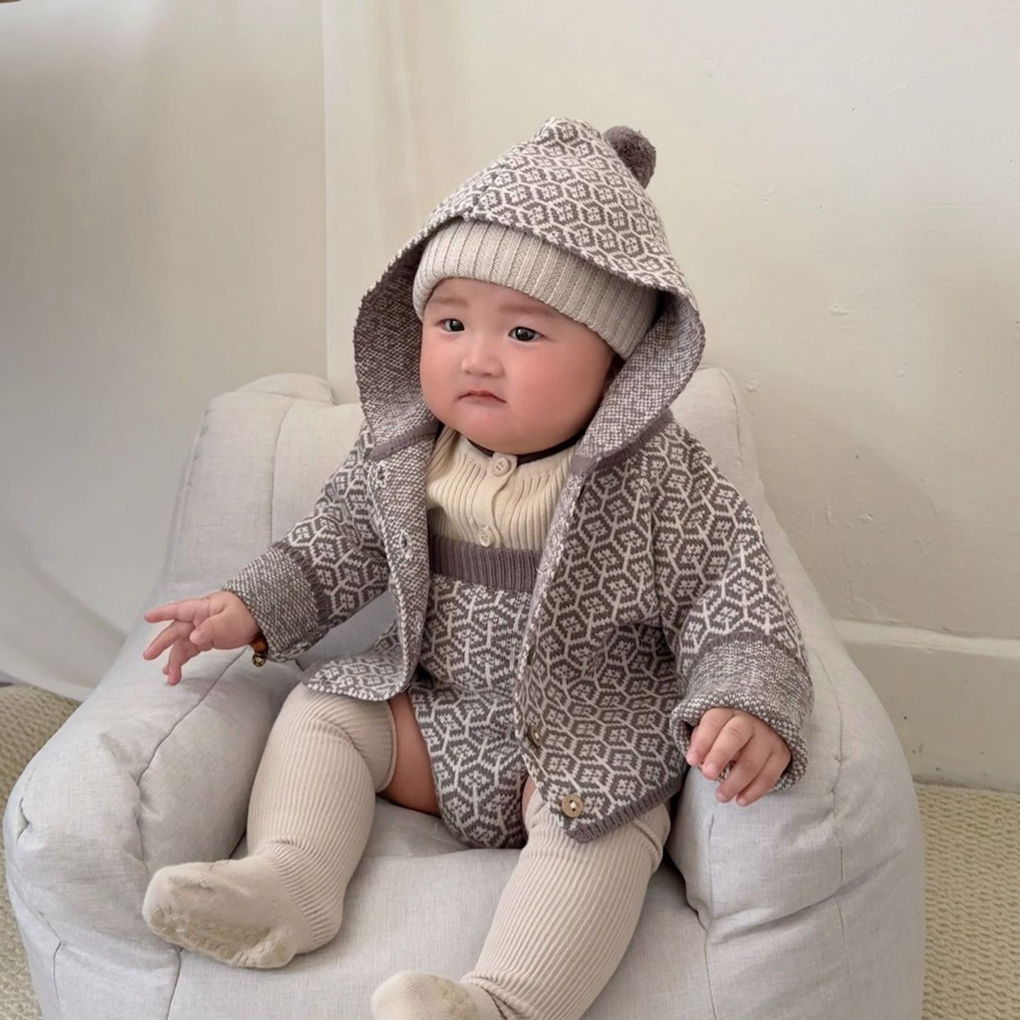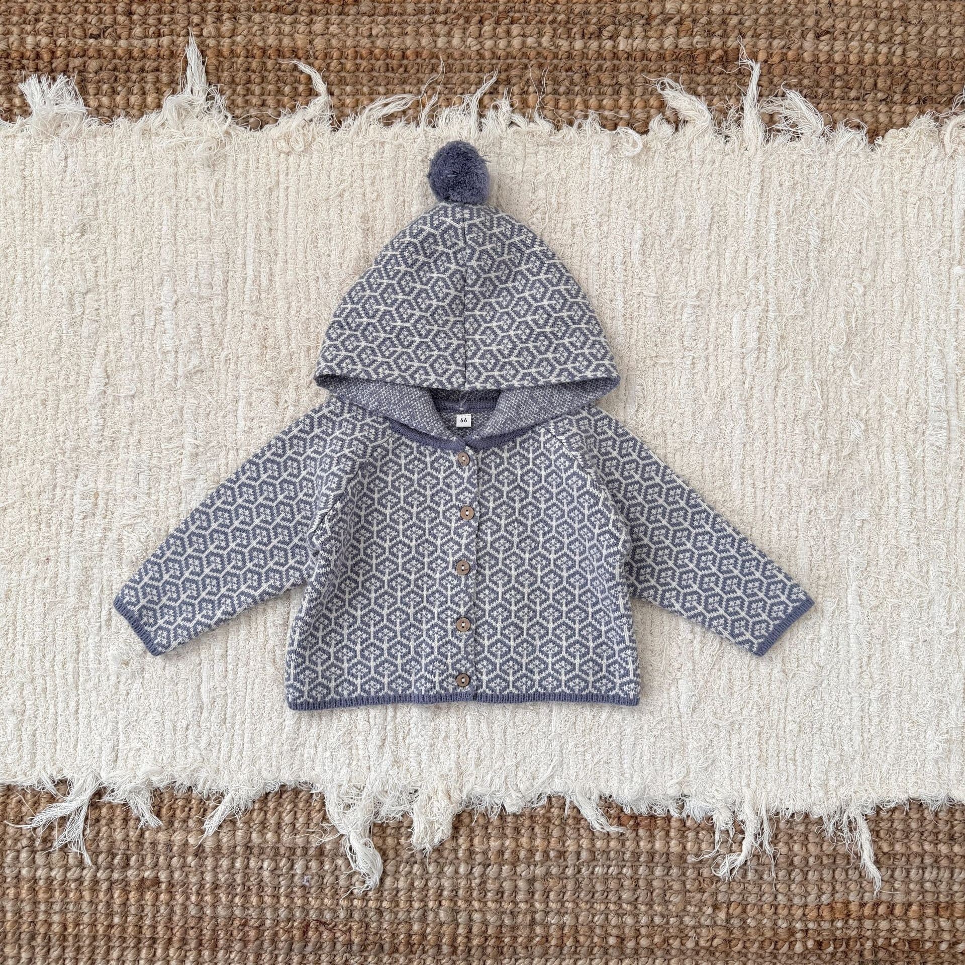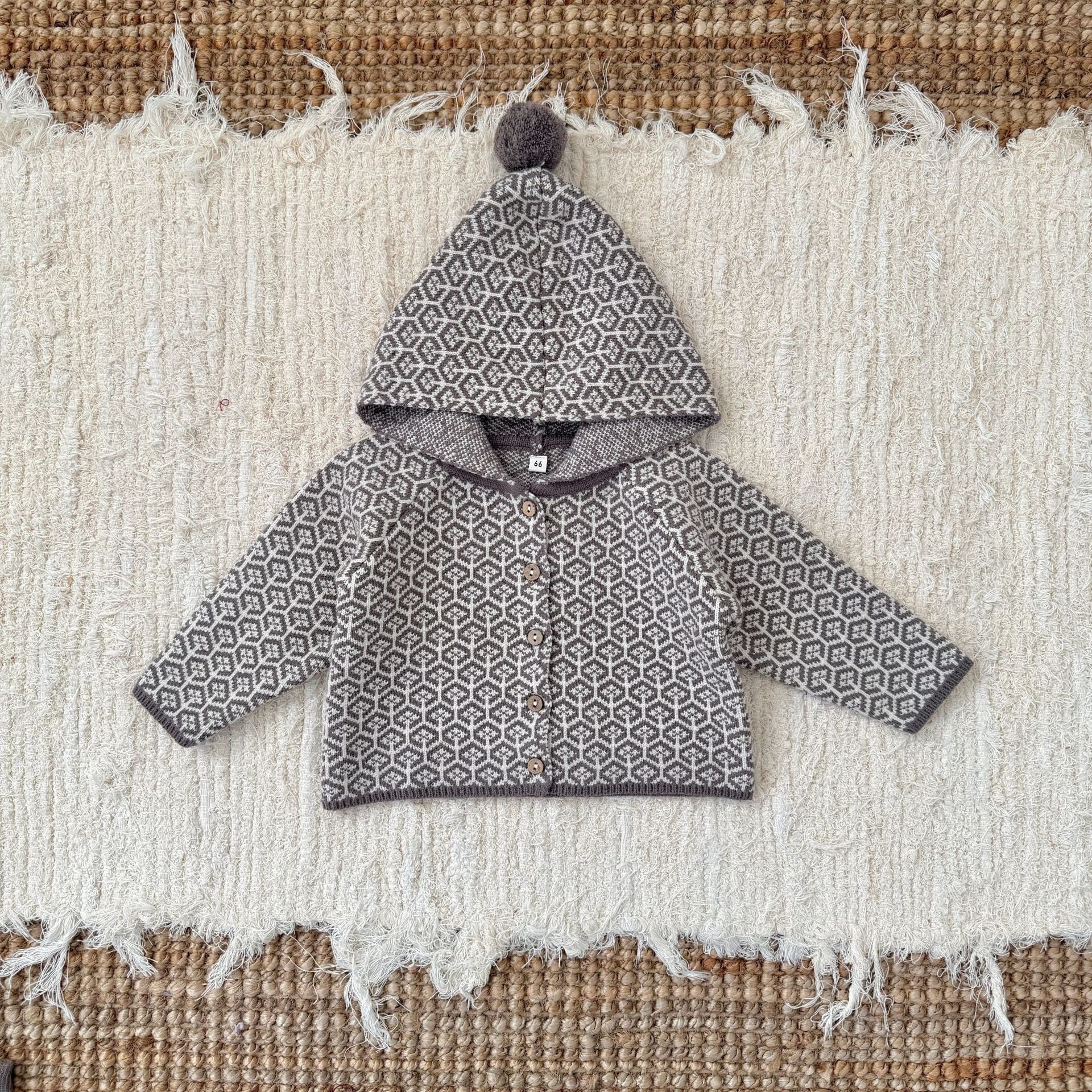 カーディガンは前開きのボタン仕様なので着脱しやすく、フードの先にはふわふわのポンポン付きで、思わず抱きしめたくなる愛らしさを演出します。