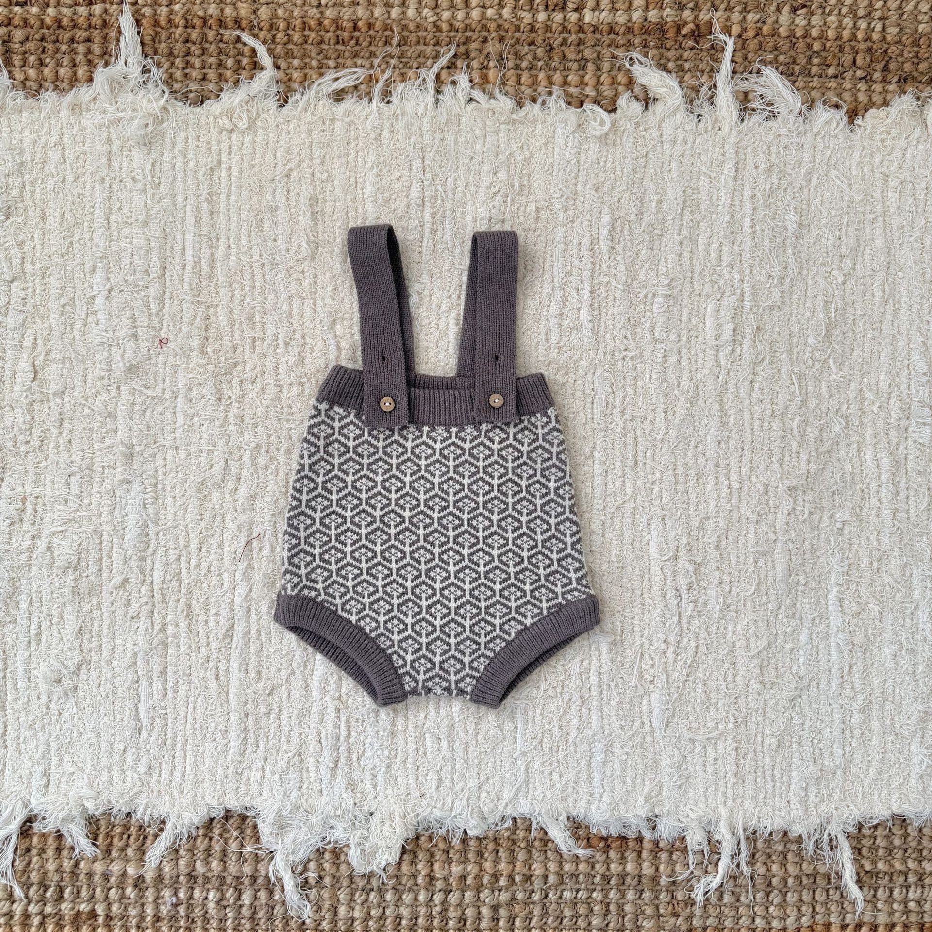 フード付きデザインの長袖カーディガンとサスペンダーロンパースの2点セットで、
