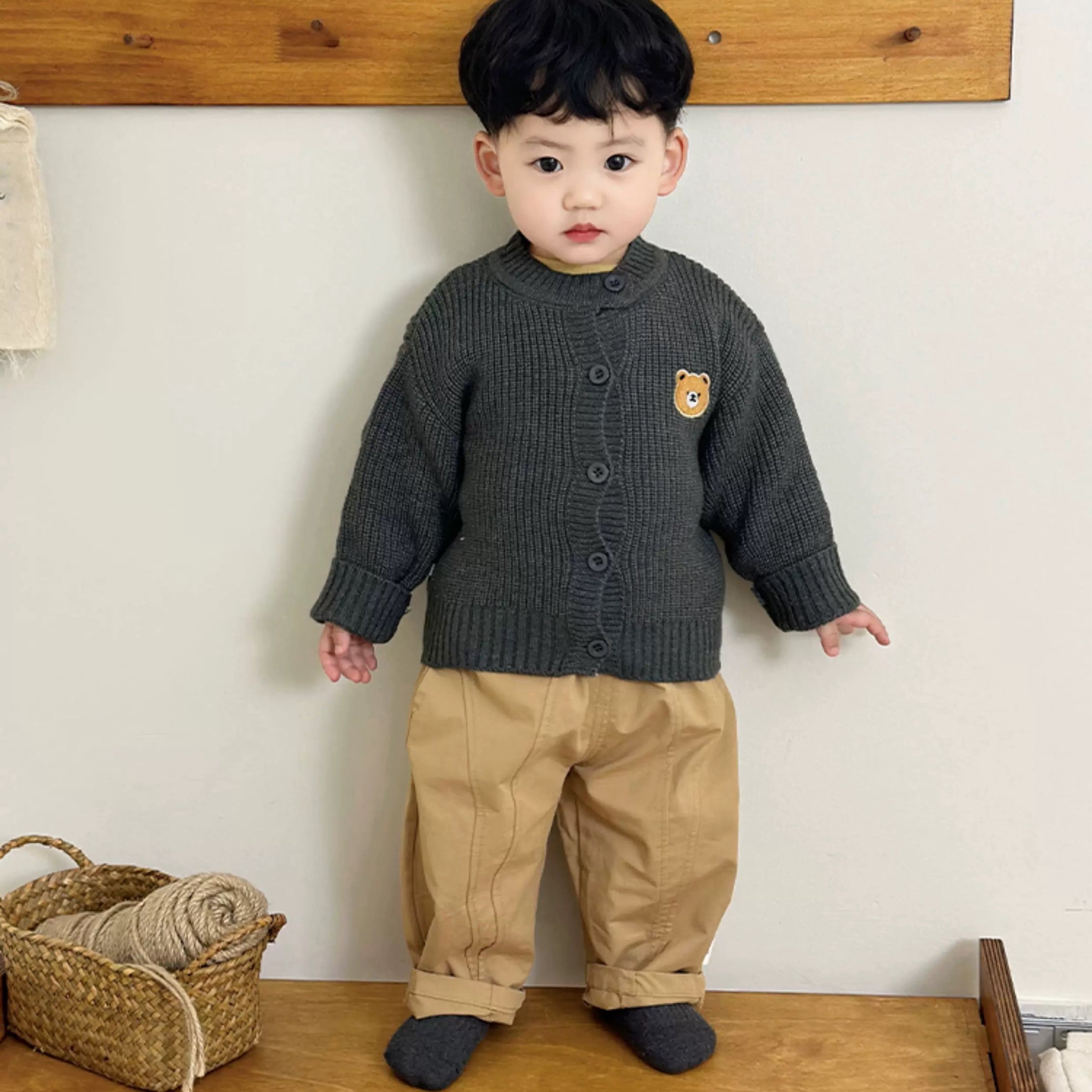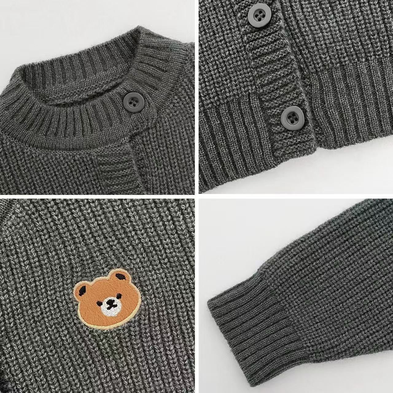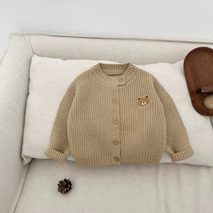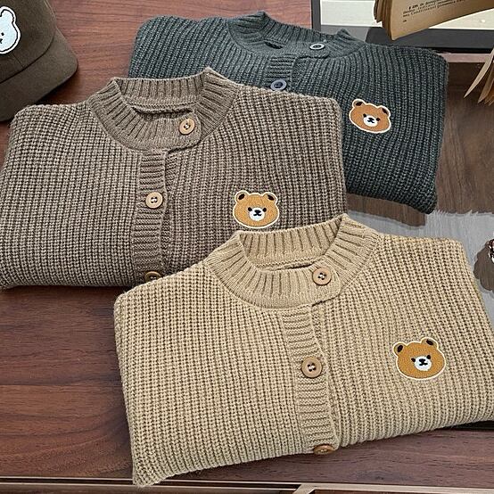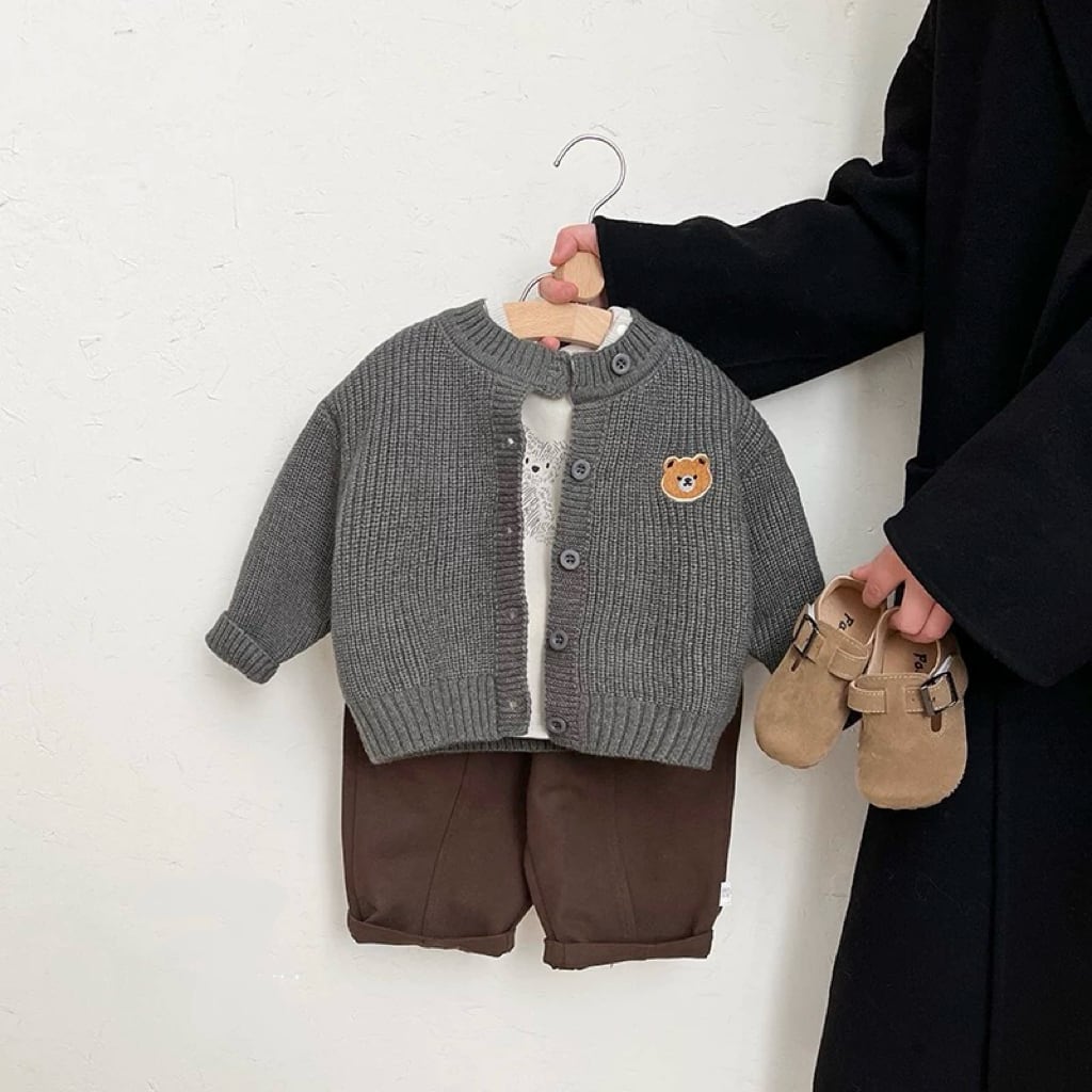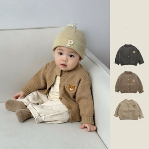 くまワッペンが可愛い男の子用ニットカーディガンで、秋から春までの長いシーズンを一緒に過ごせます!