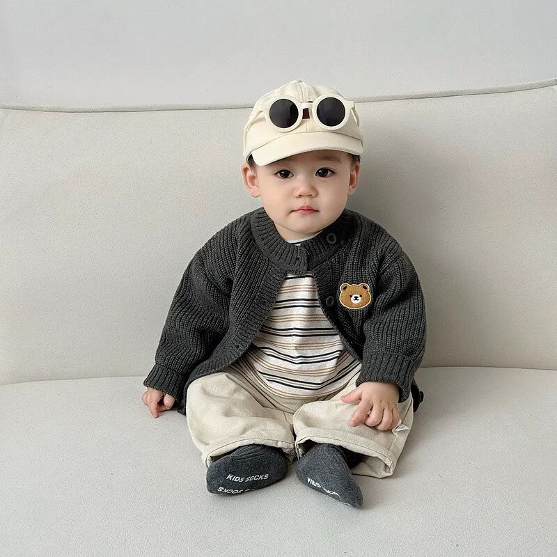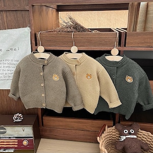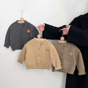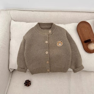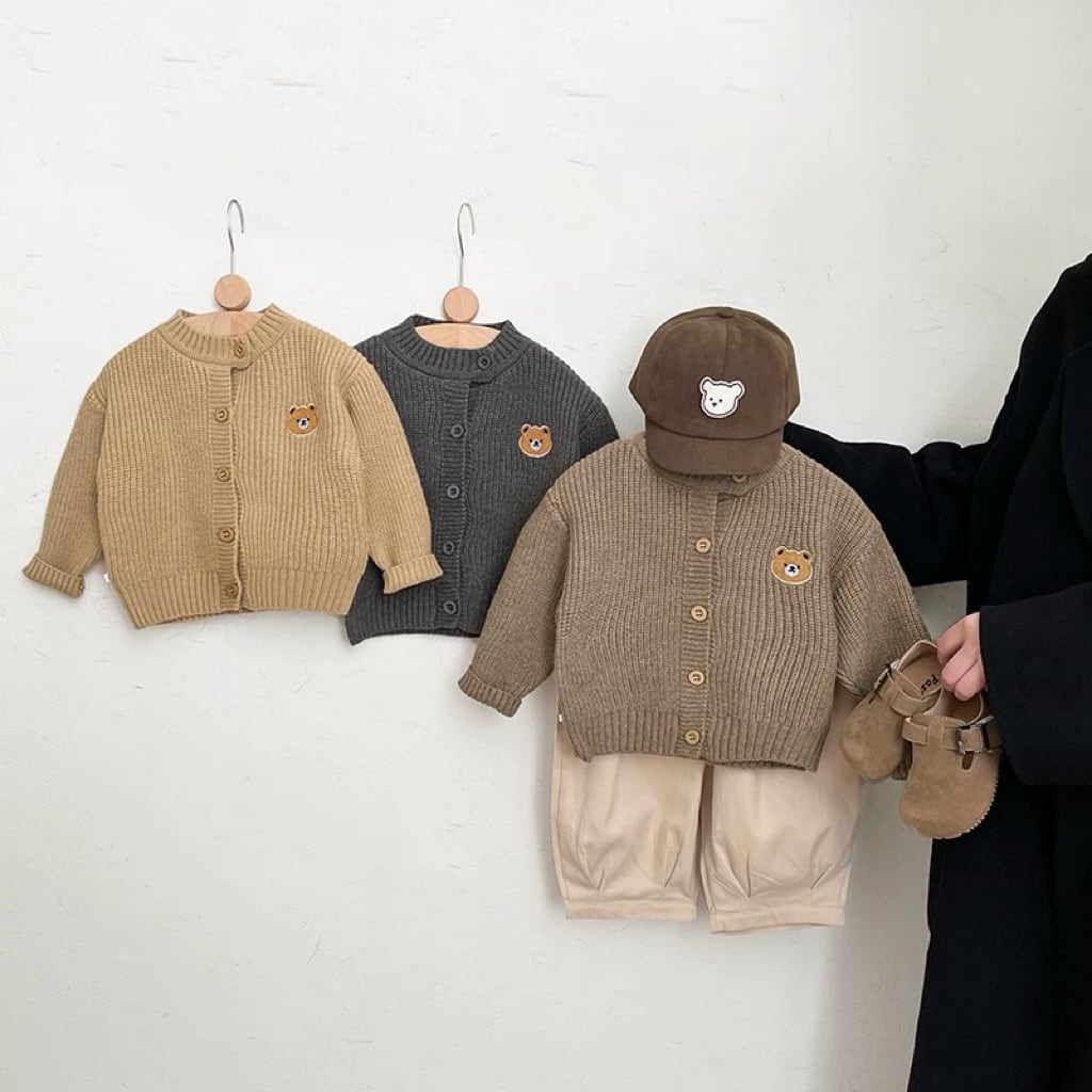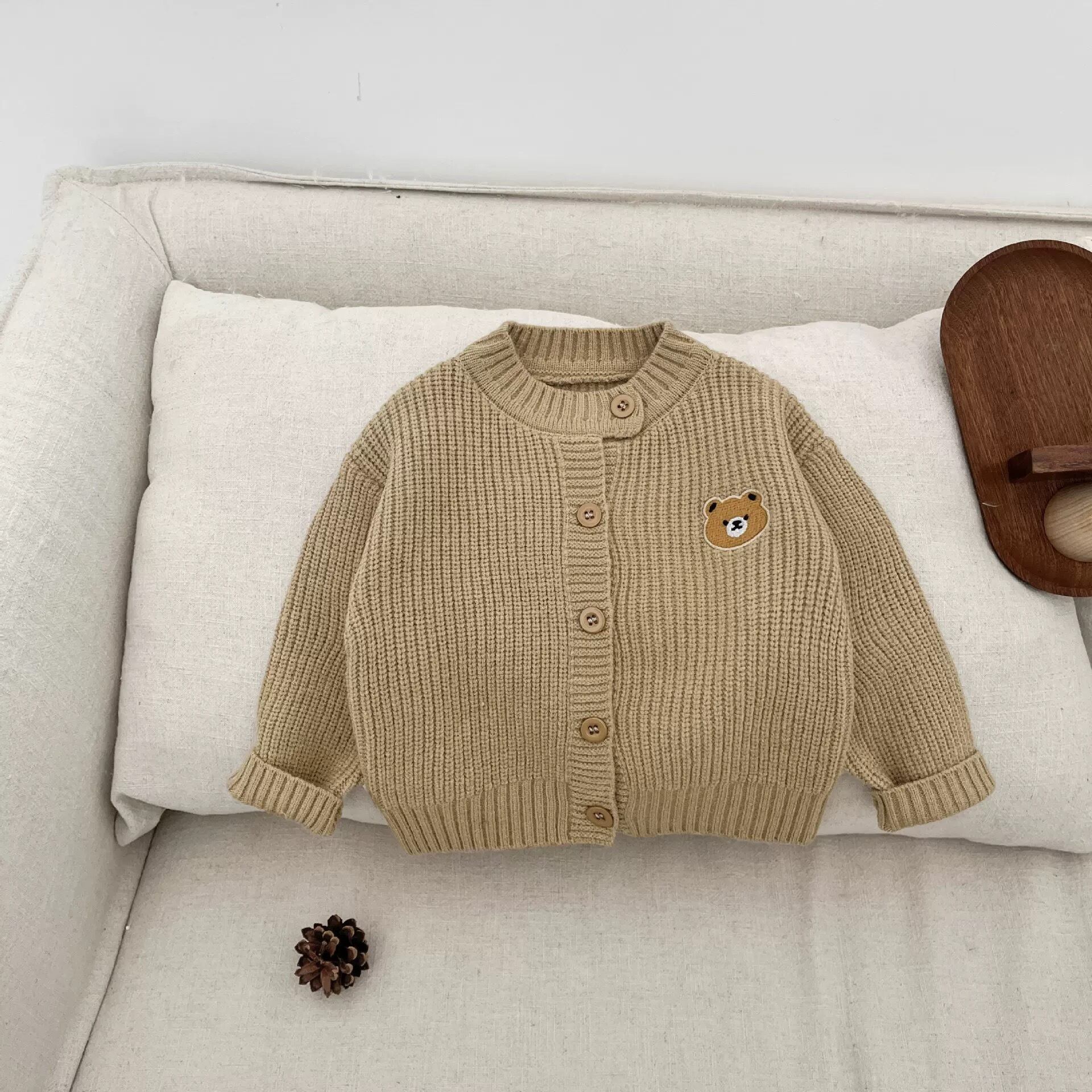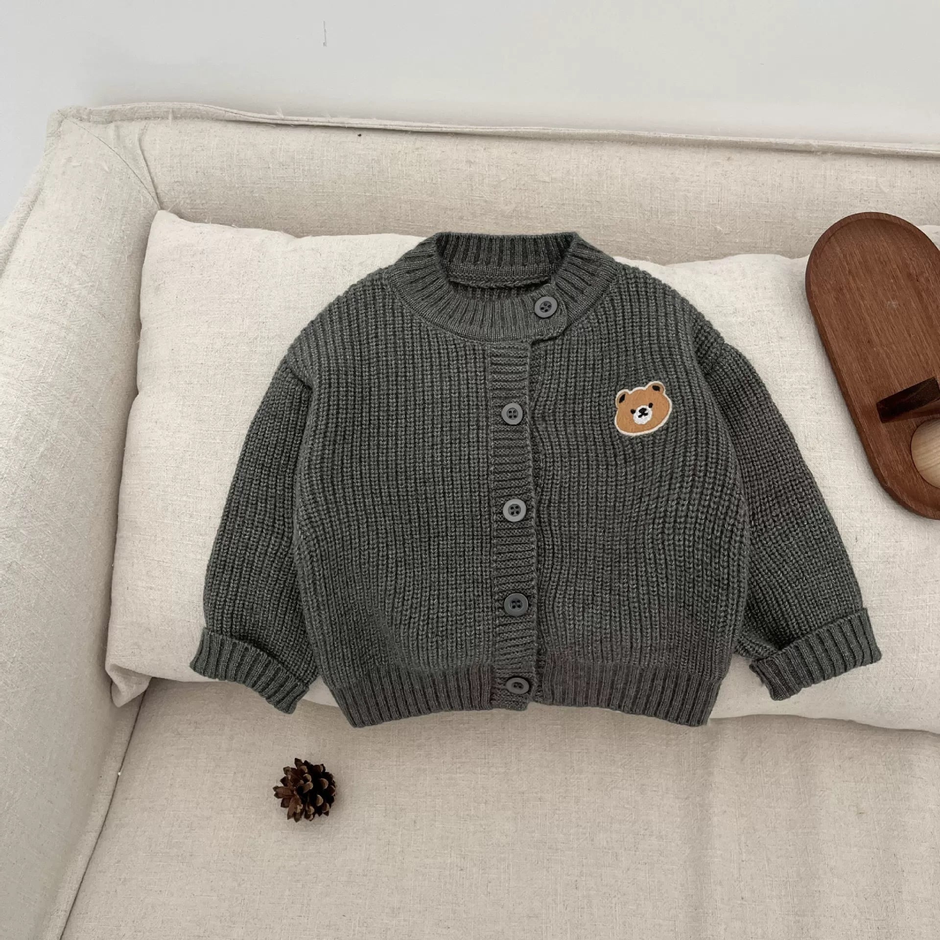 くまワッペンが可愛い男の子用ニットカーディガンで、秋から春までの長いシーズンを一緒に過ごせます!