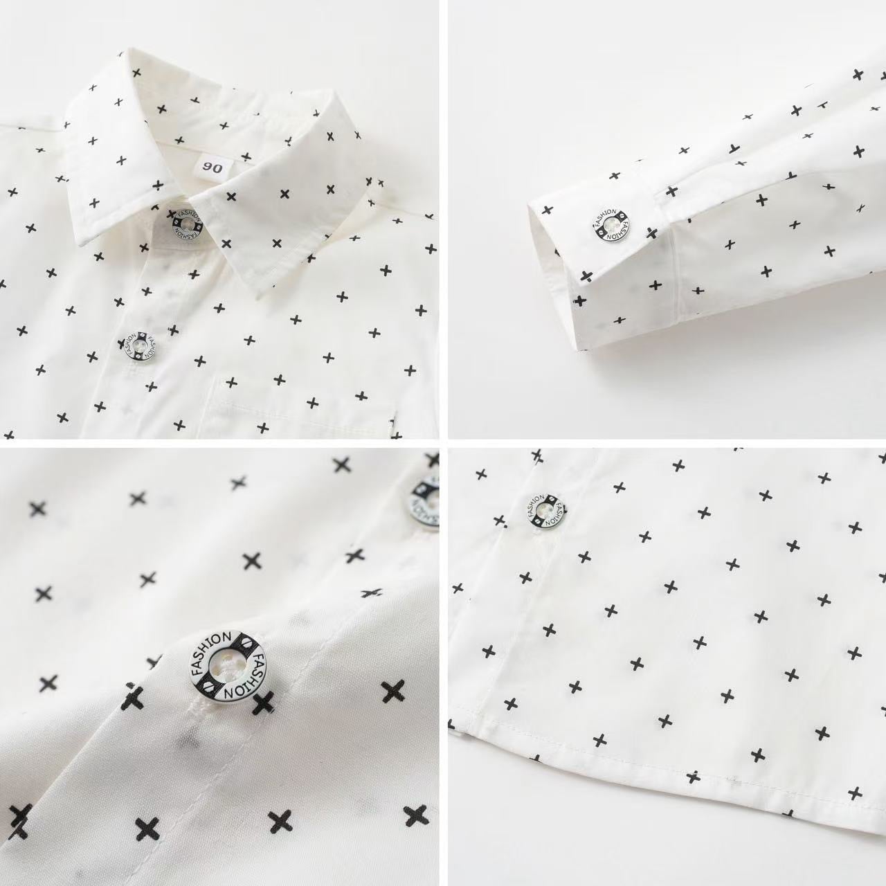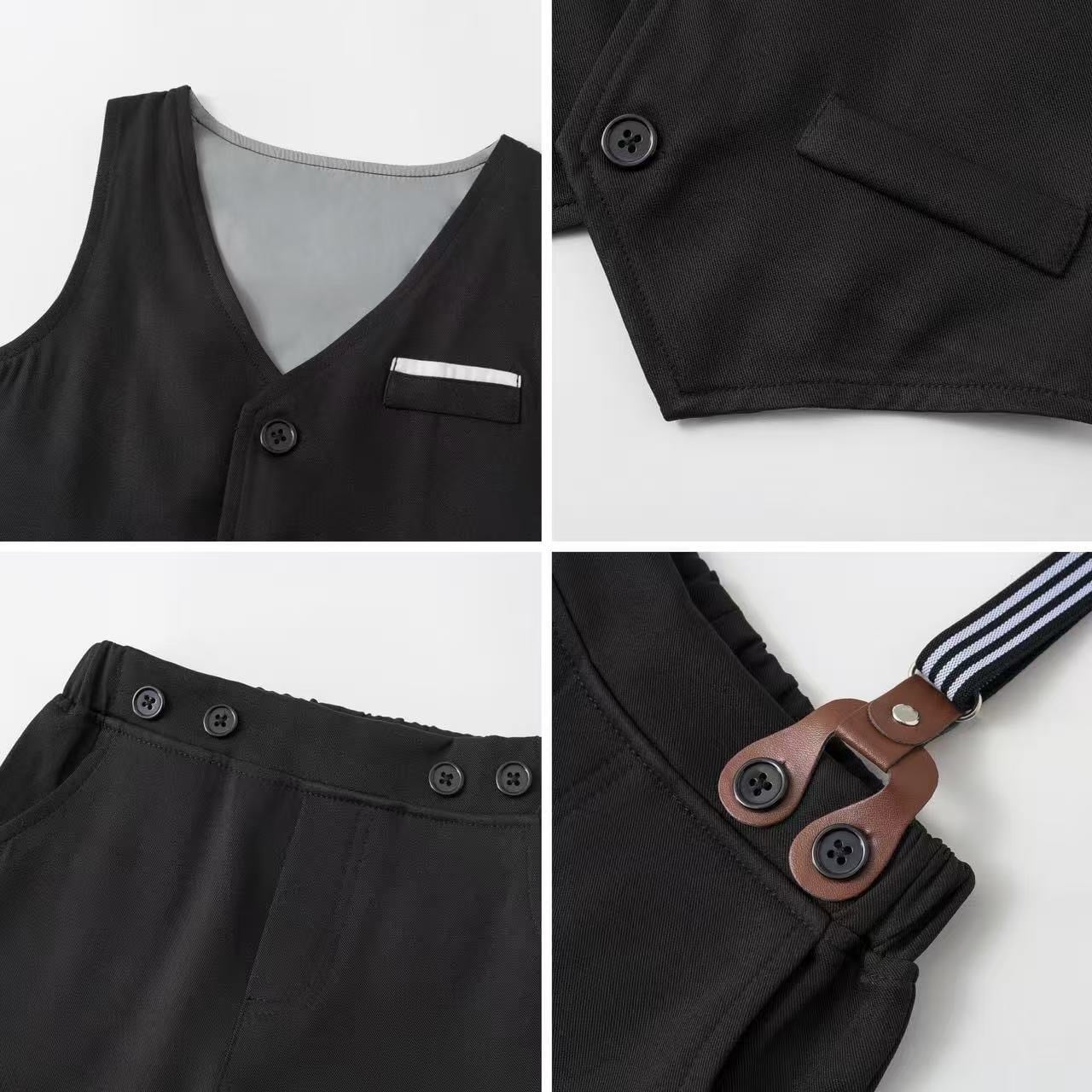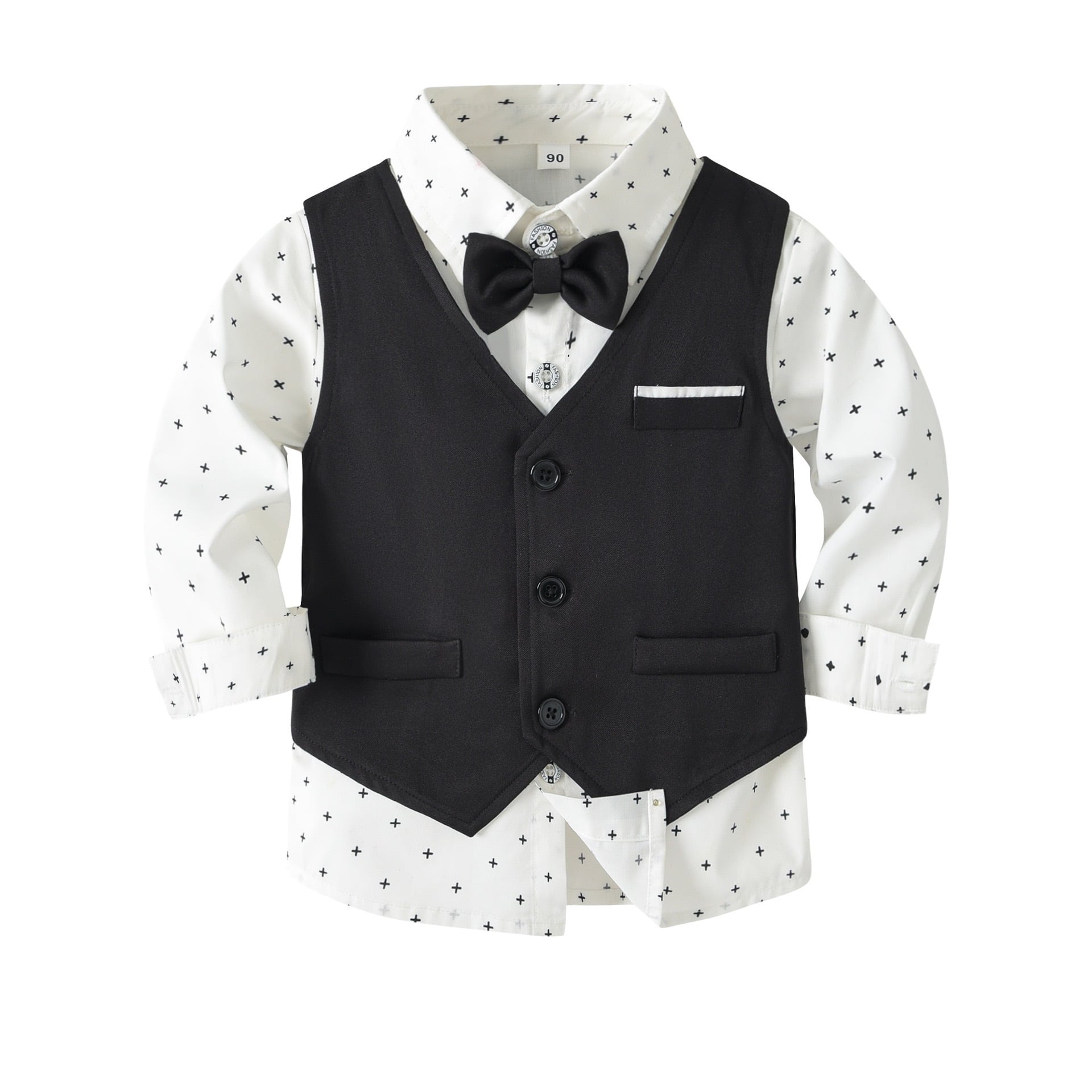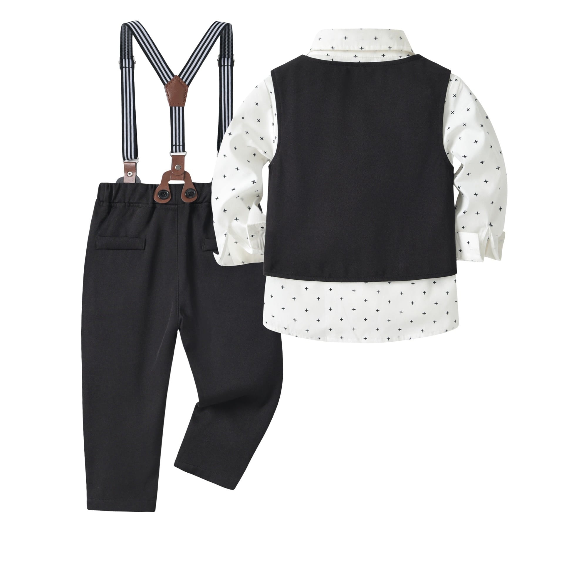 ブラックカラーのベストとパンツはシックで洗練された印象を与え、シャツはおしゃれな黒い十字柄で、全体を程よく引き立てます。