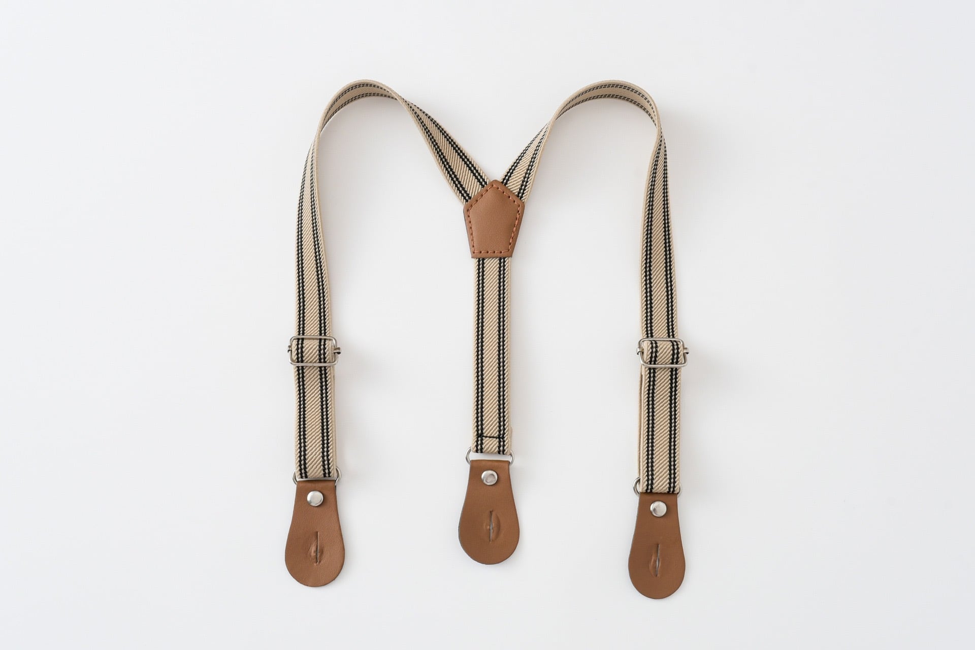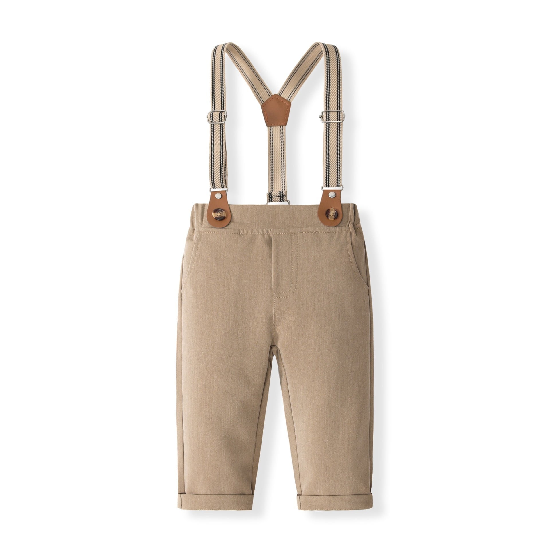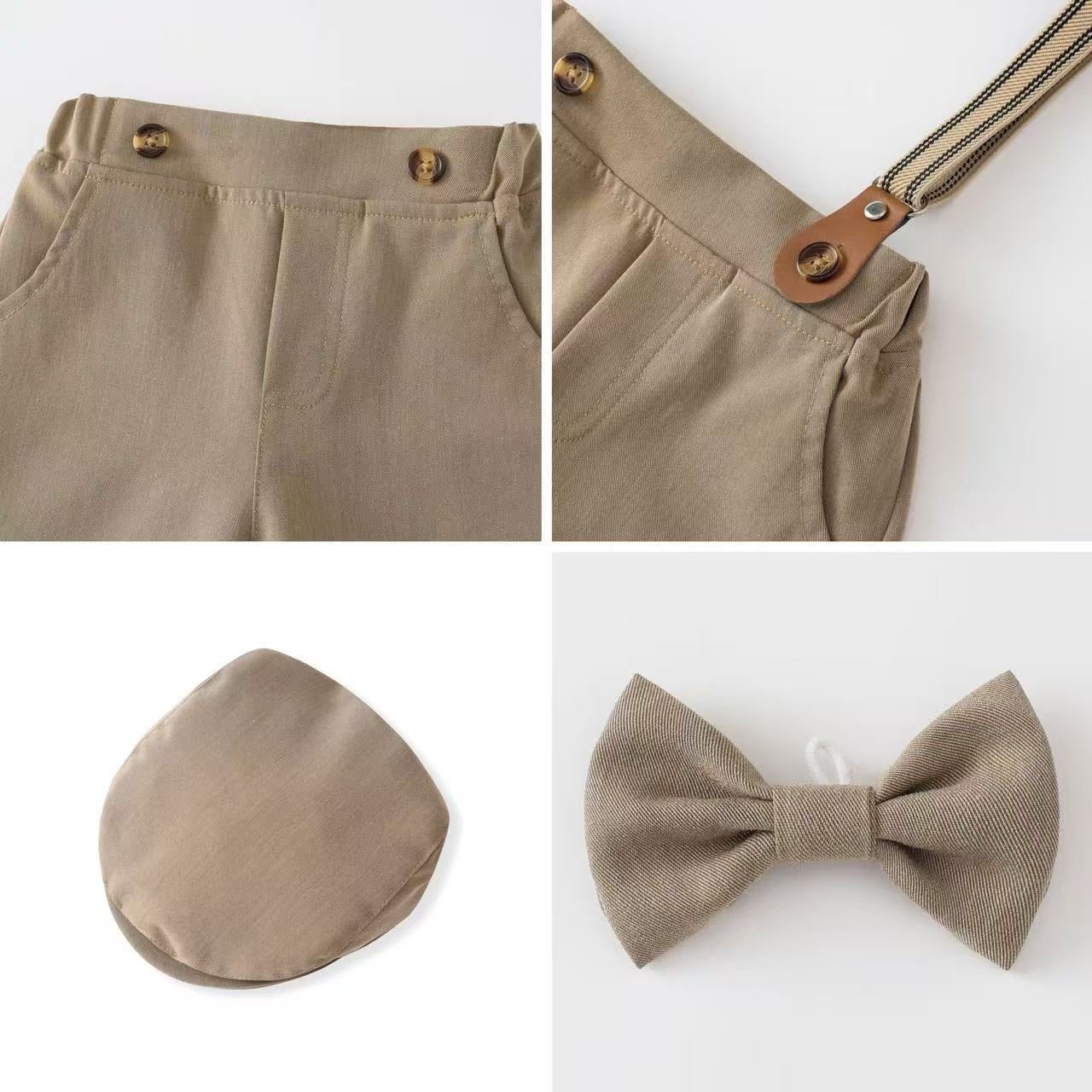 上質な素材を使用した子ども用フォーマルセットは、シャツ、長ズボンとサスペンダーに、蝶ネクタイとベレー帽が付いた豪華なセットアップです。
