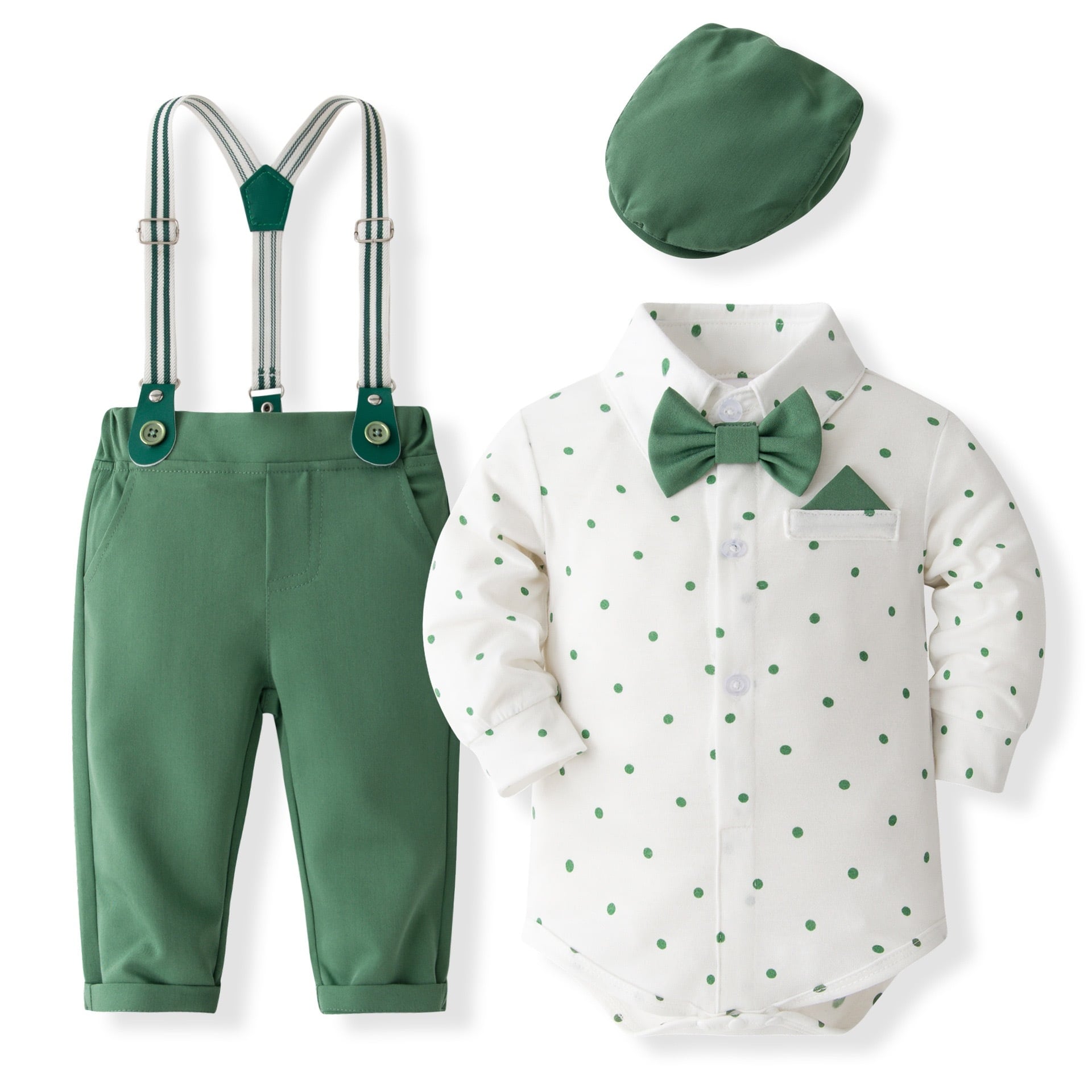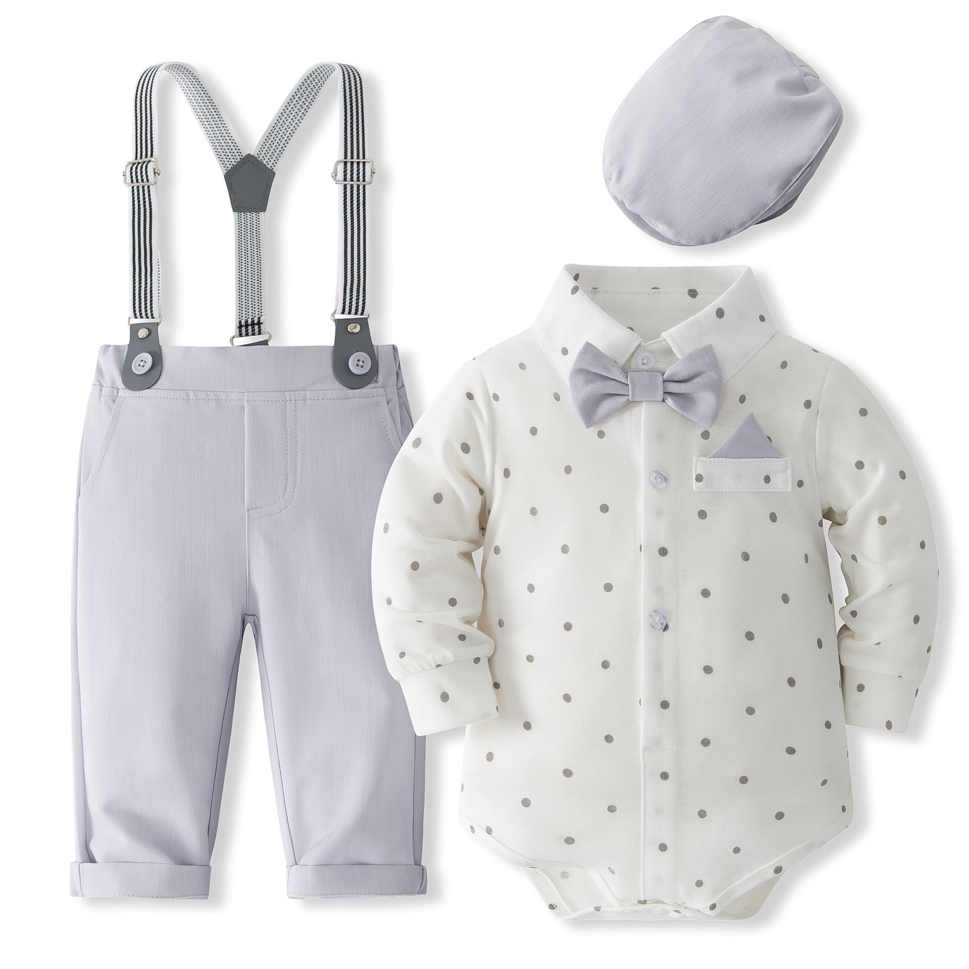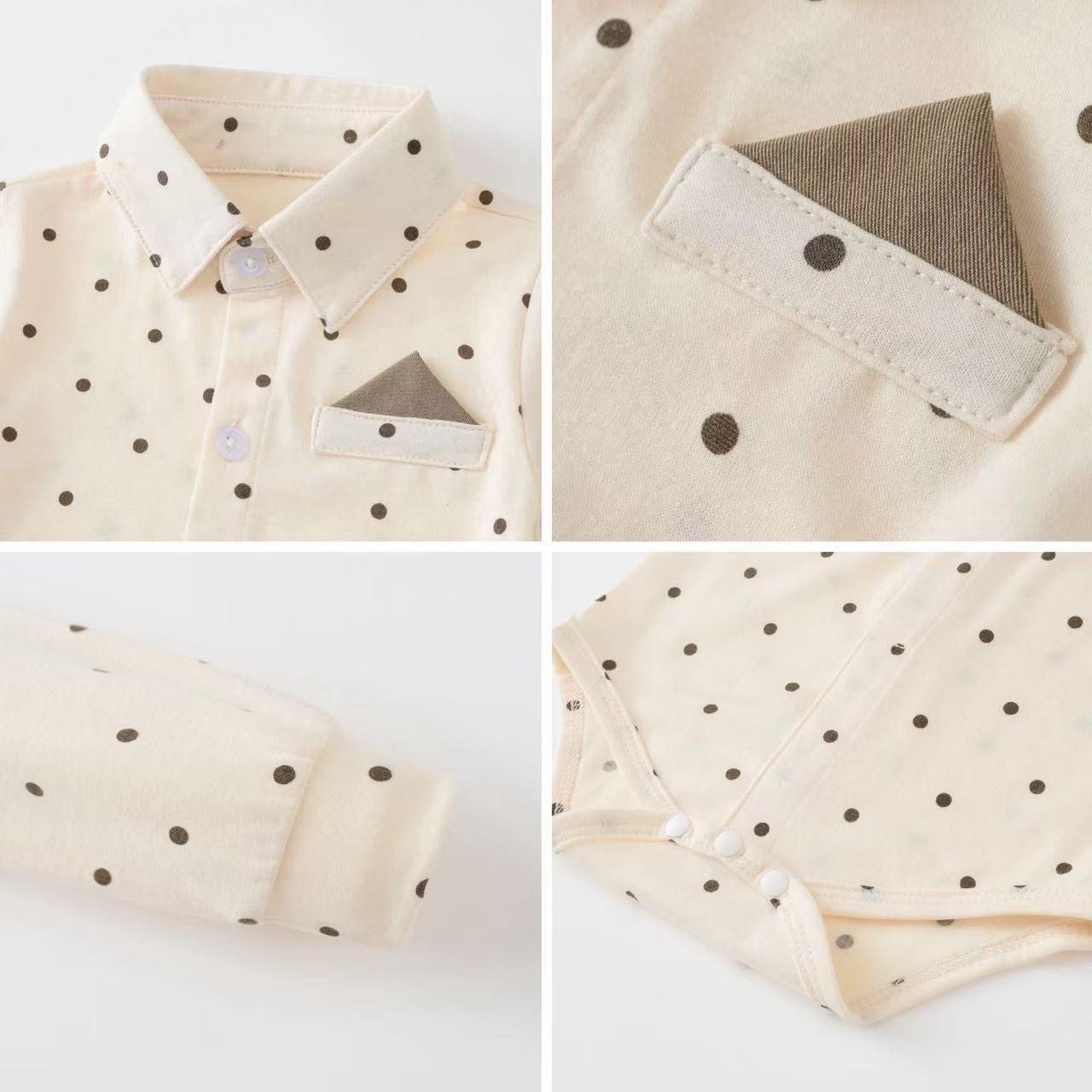 シャツはかわいいドット柄で、左胸にはさりげないポケット装飾を施し、パンツはサスペンダー付きで、着るだけで一気におしゃれで紳士的な印象に仕上がります。
