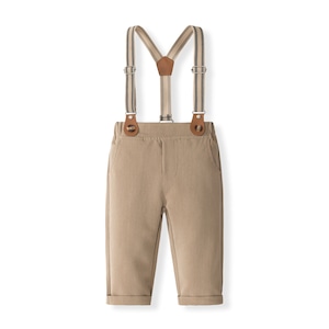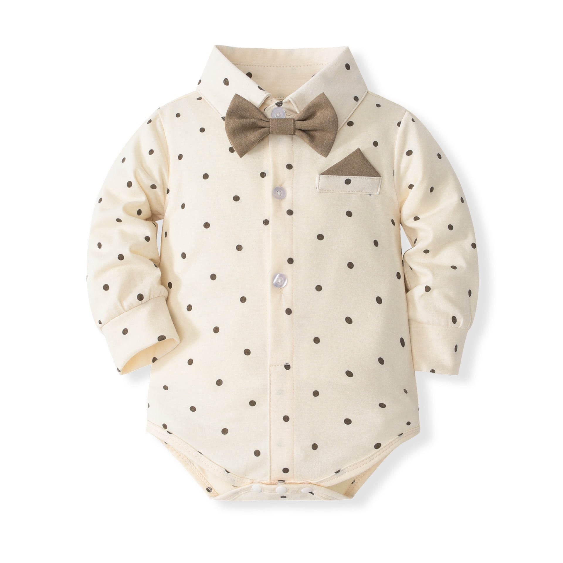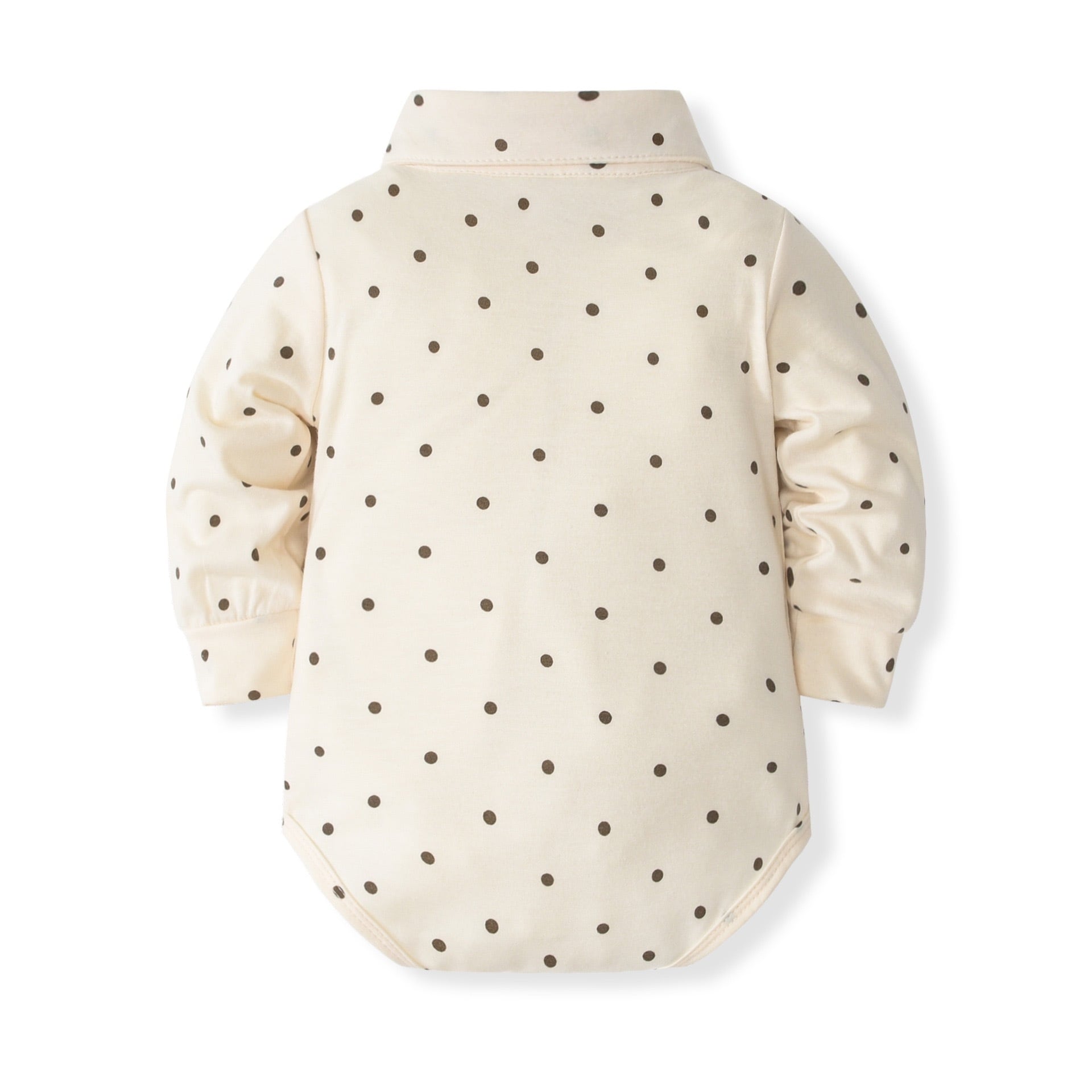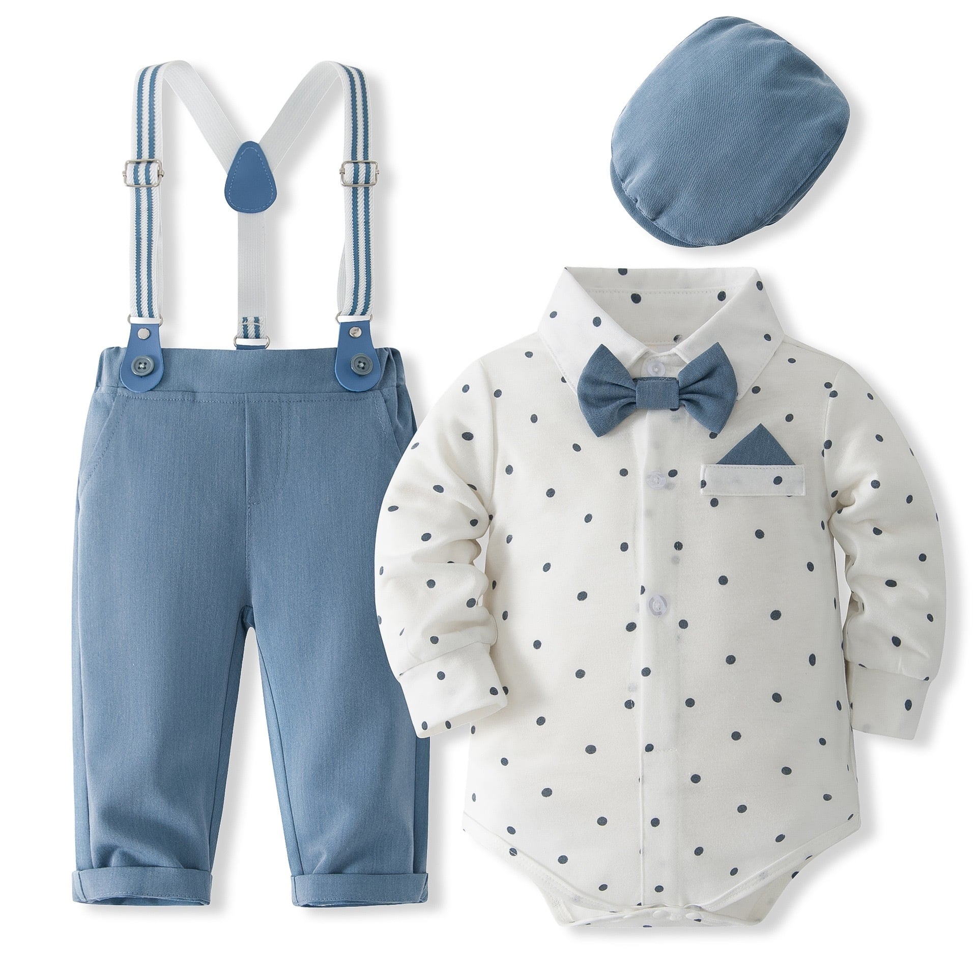 シャツはかわいいドット柄で、左胸にはさりげないポケット装飾を施し、パンツはサスペンダー付きで、着るだけで一気におしゃれで紳士的な印象に仕上がります。