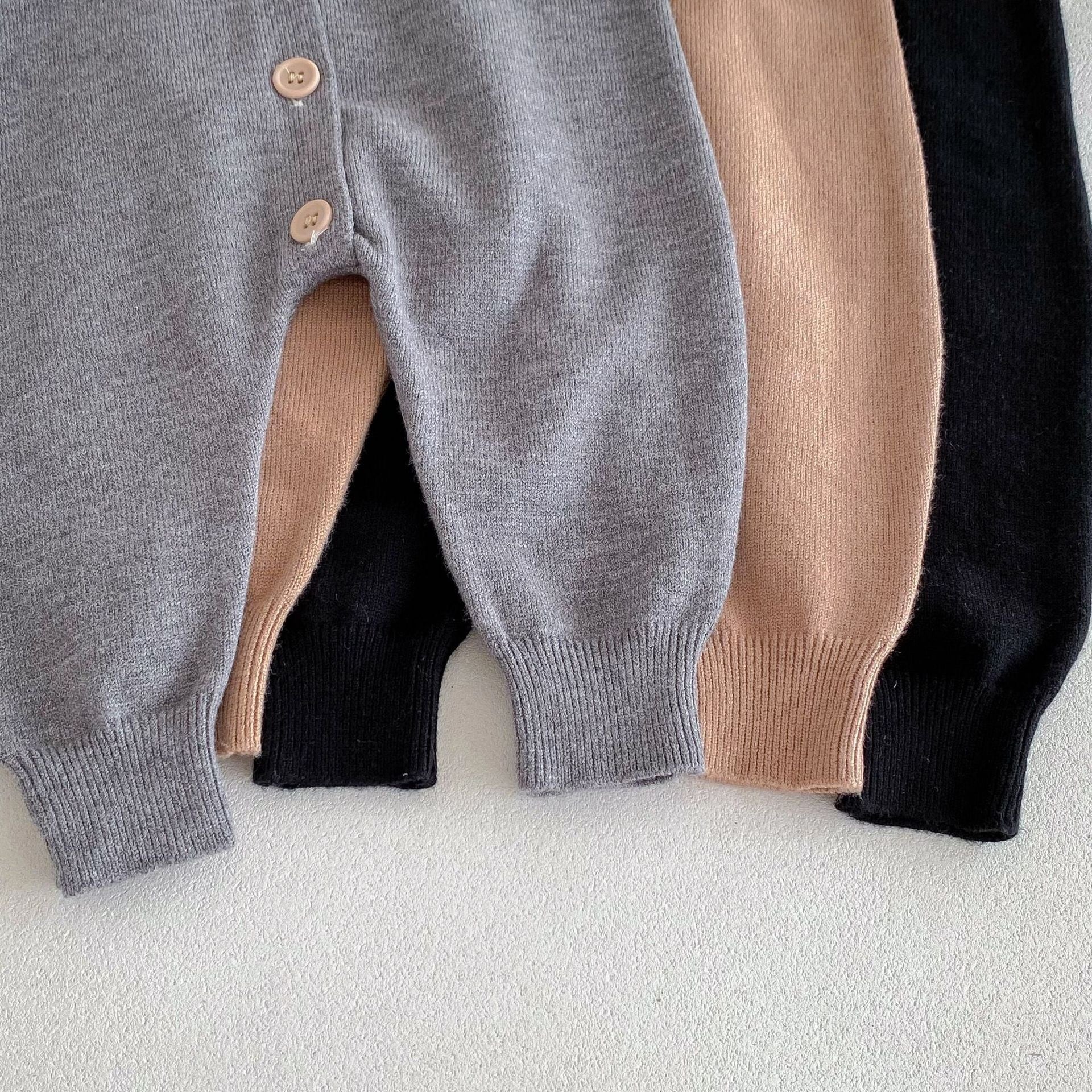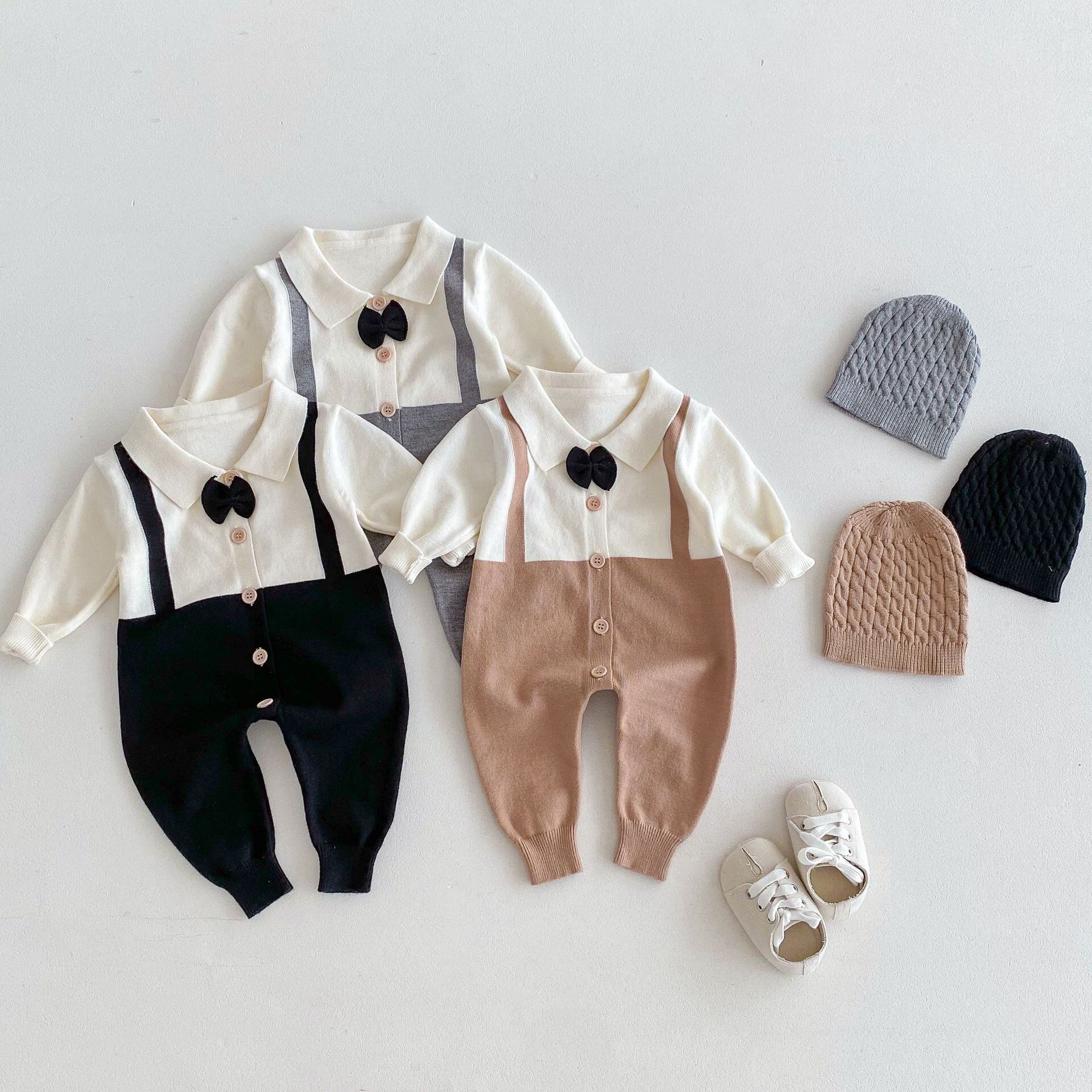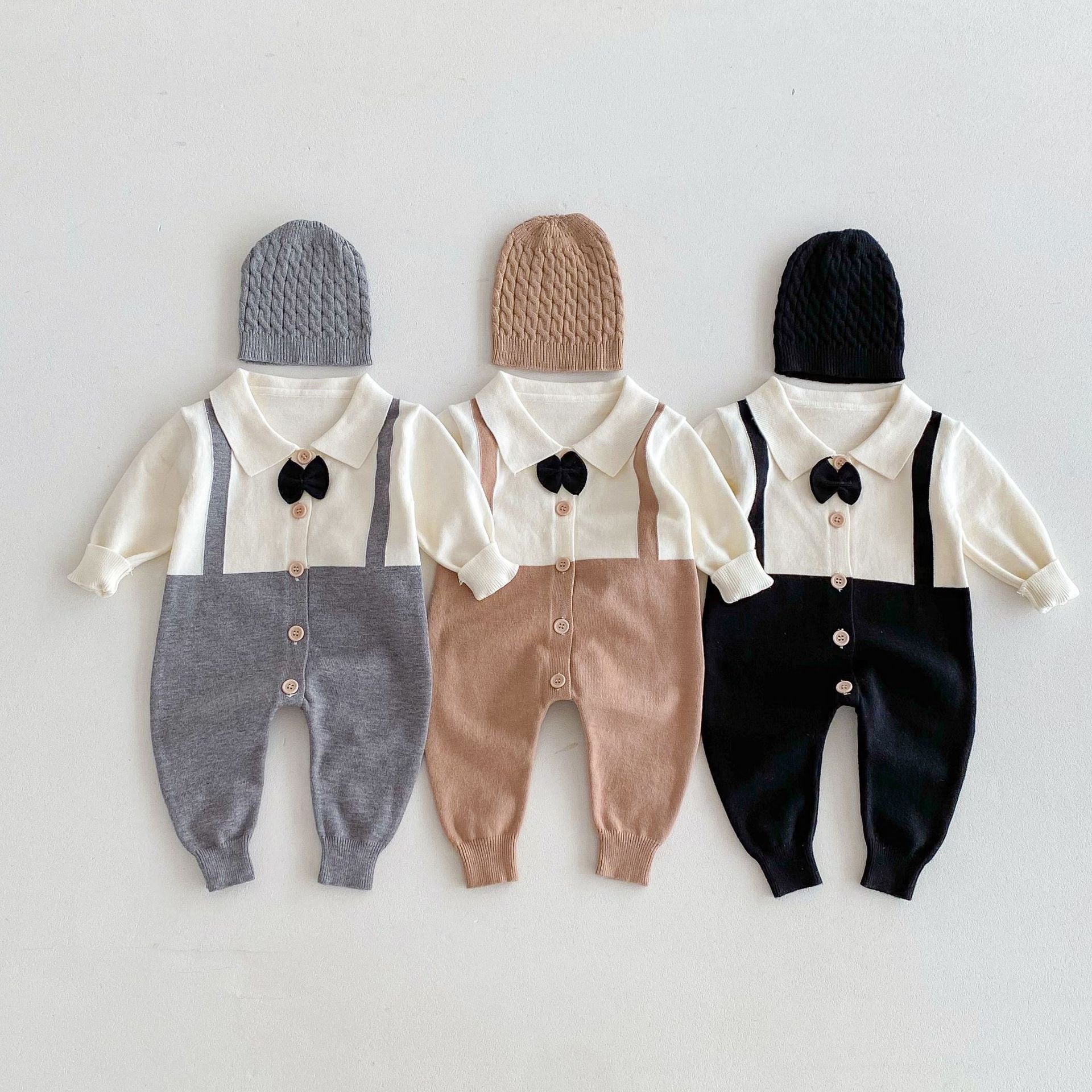 ブラック・グレー・ブラウンの3色展開で、どんなシーンにも合わせやすいベビー用ロンパースです。