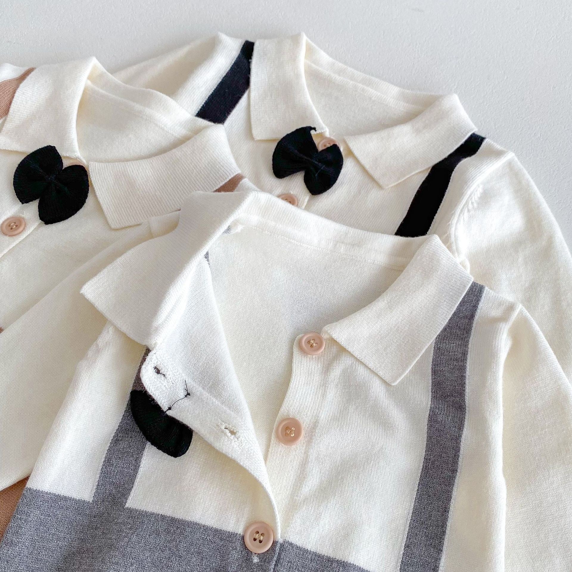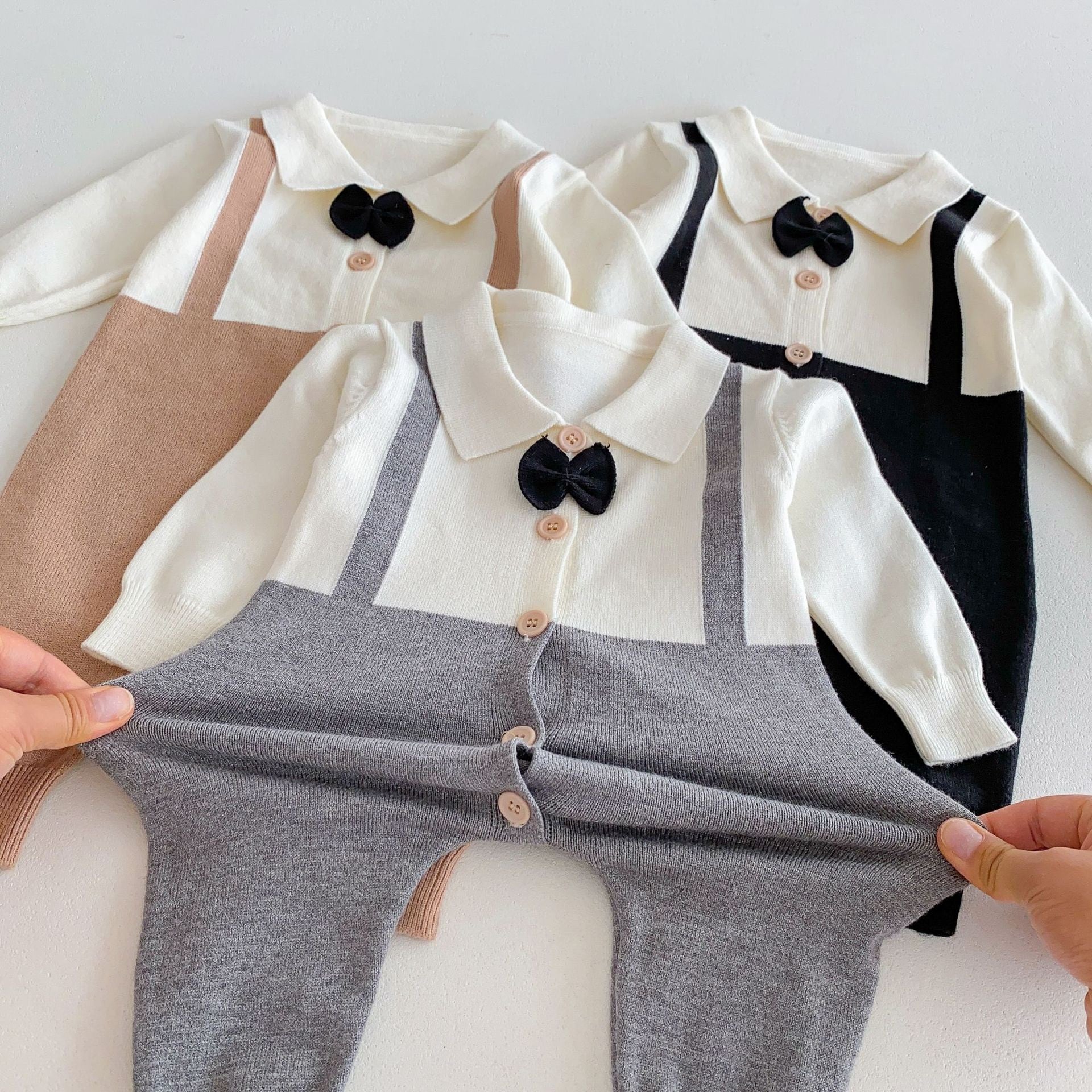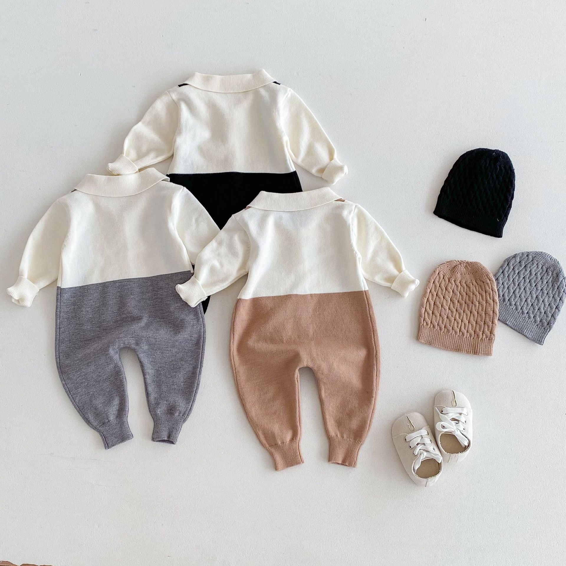 ブラック・グレー・ブラウンの3色展開で、どんなシーンにも合わせやすいベビー用ロンパースです。