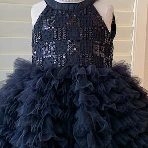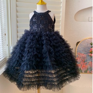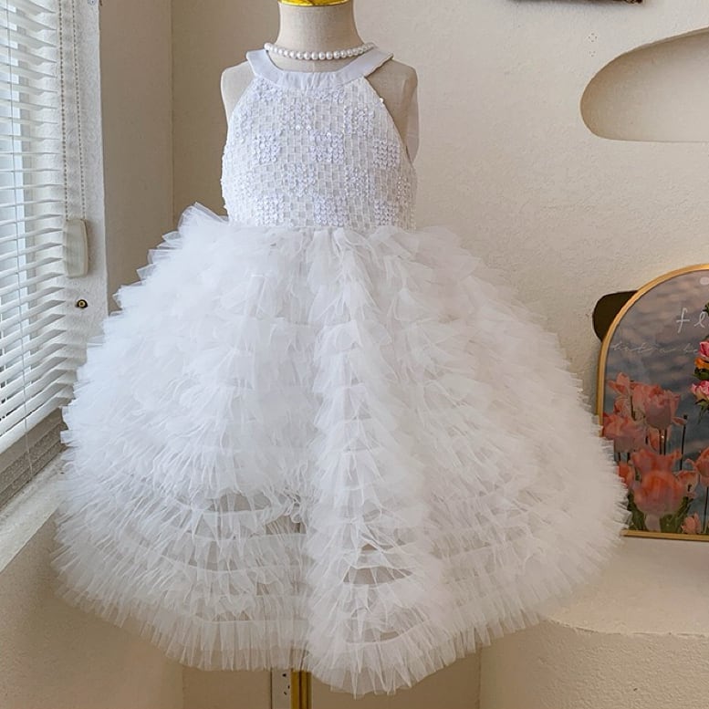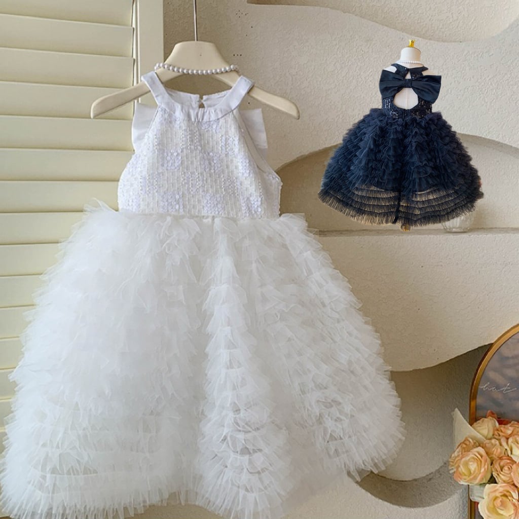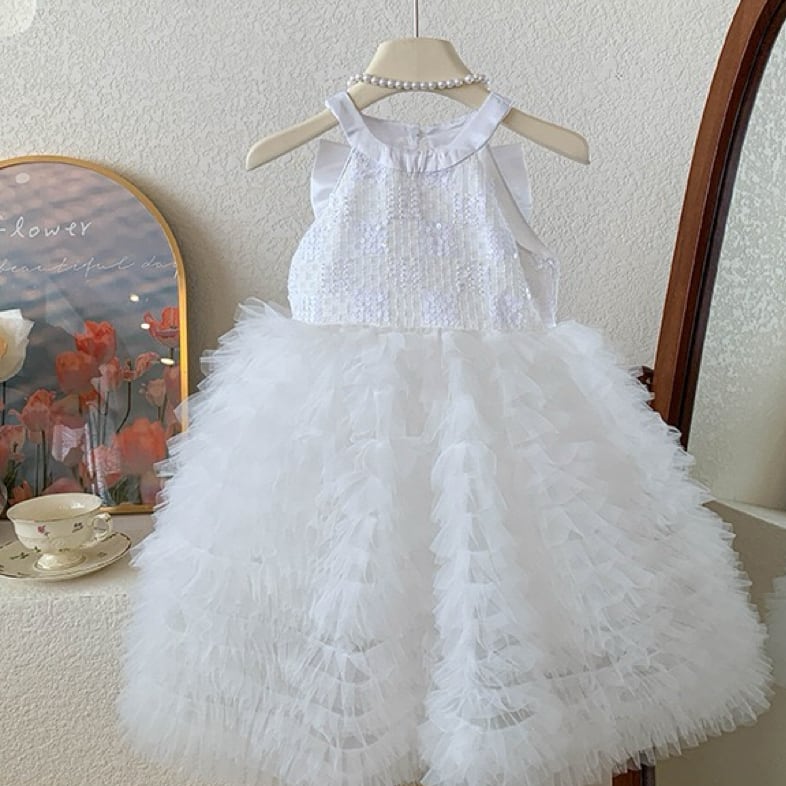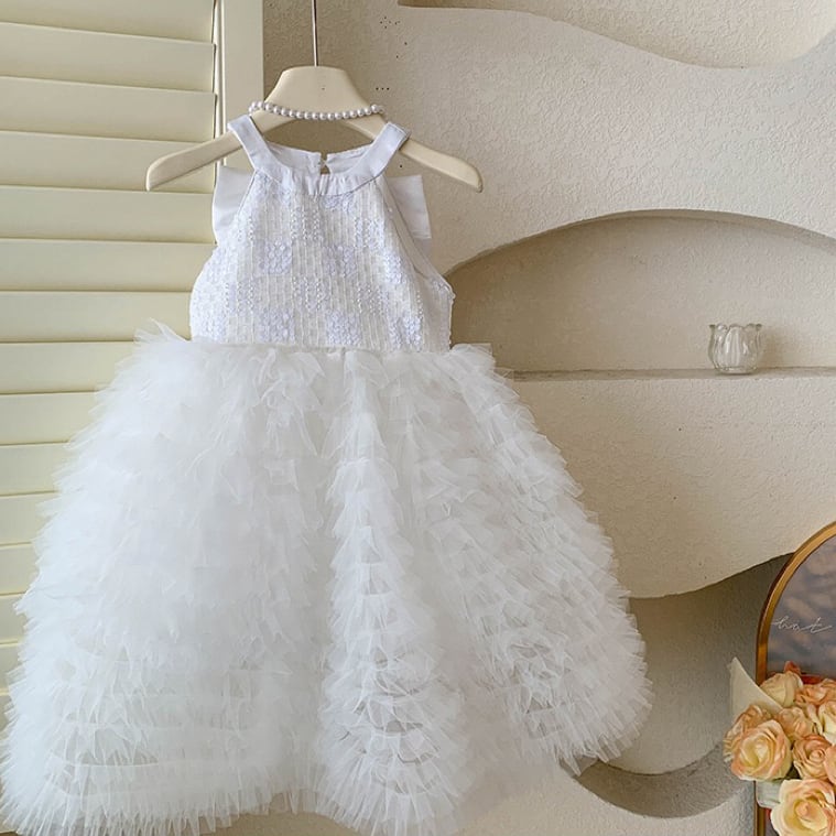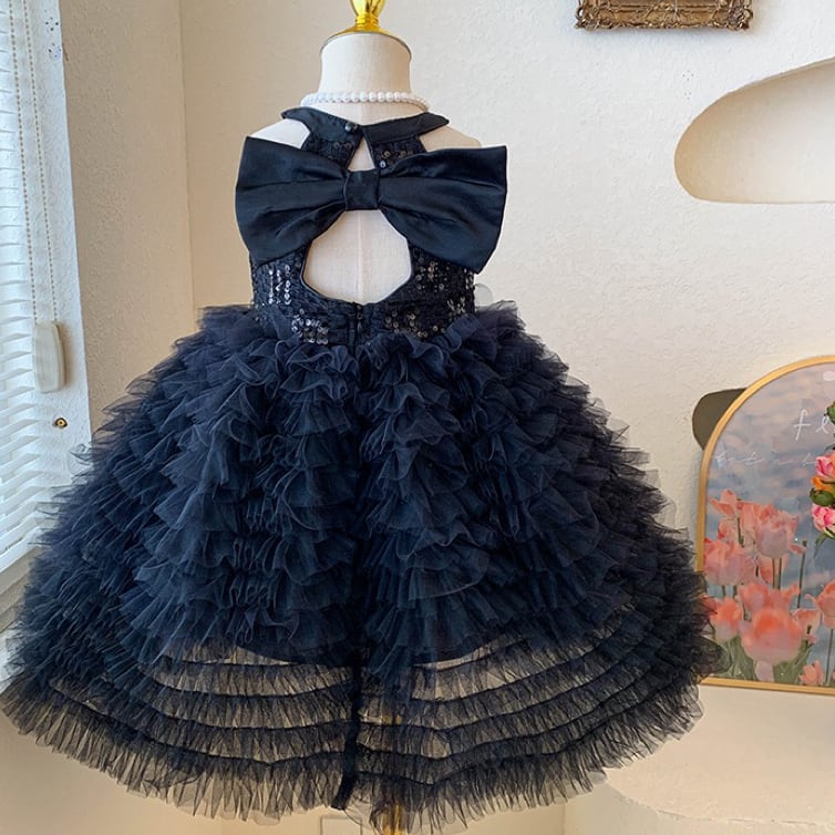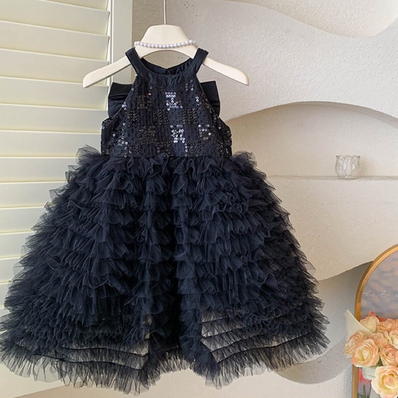 キラキラと輝くスパンコールをあしらった上半身に、ふんわり広がるAラインのボリュームスカートを組み合わせた、まるでおとぎ話から飛び出してきたような女の子用フォーマルドレスワンピースです。