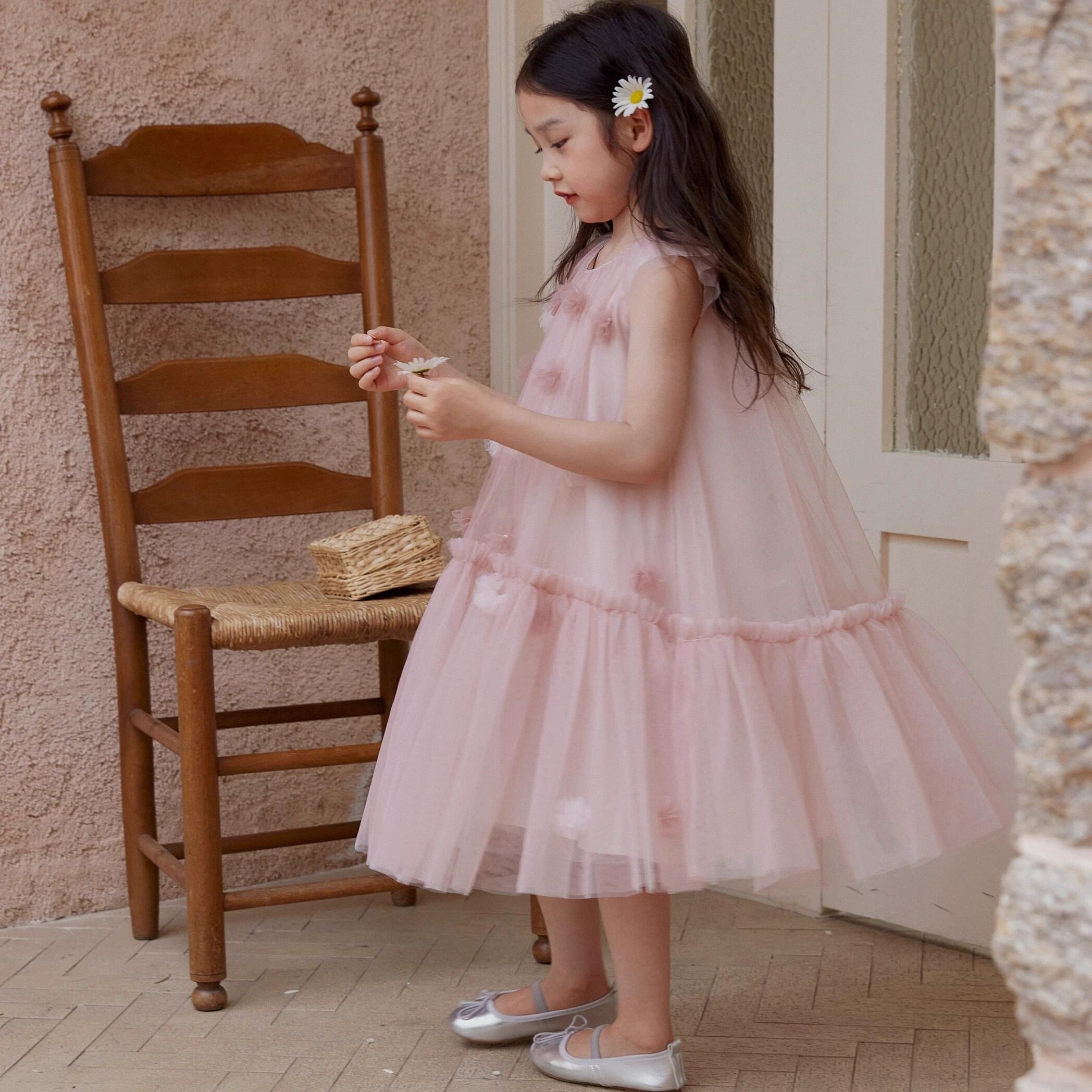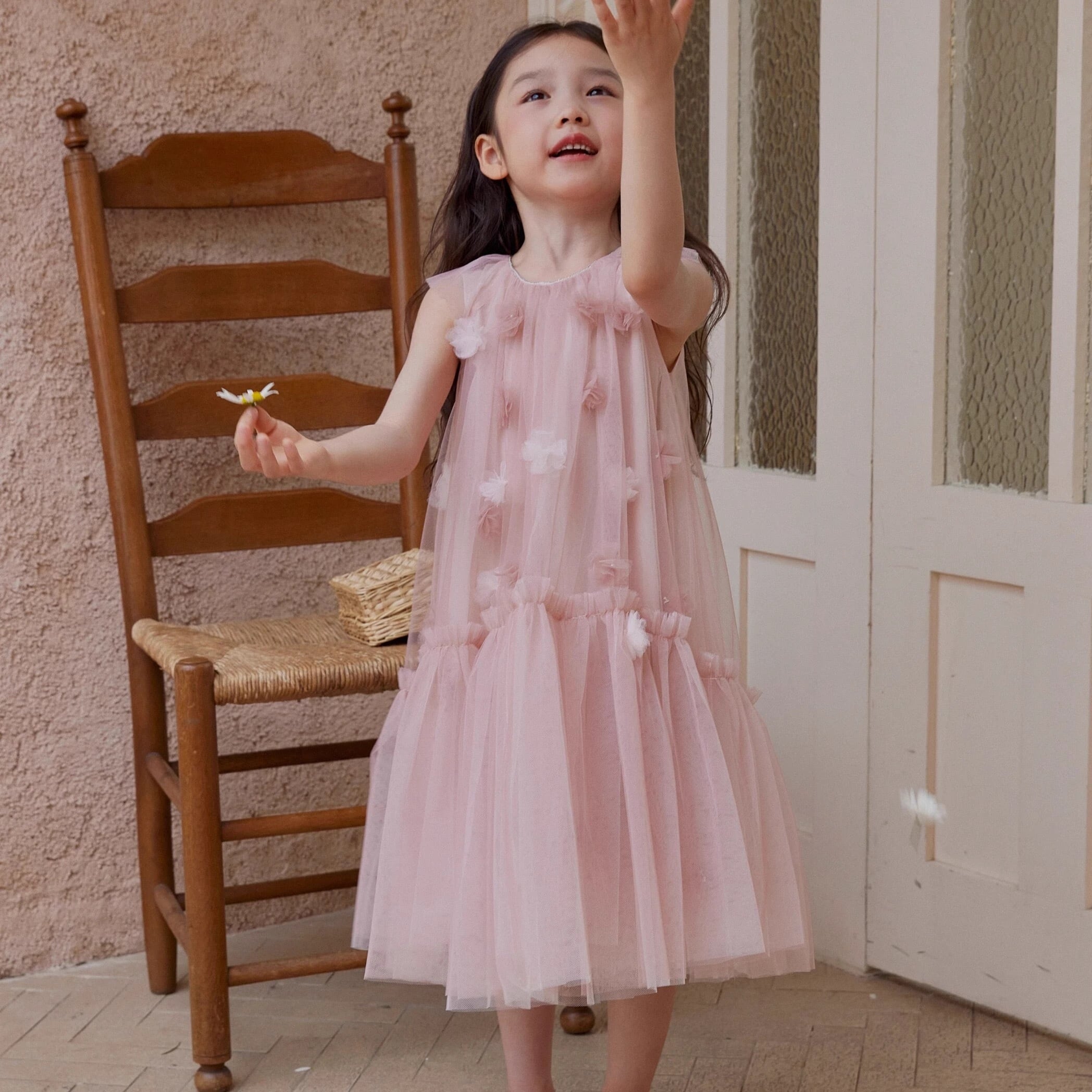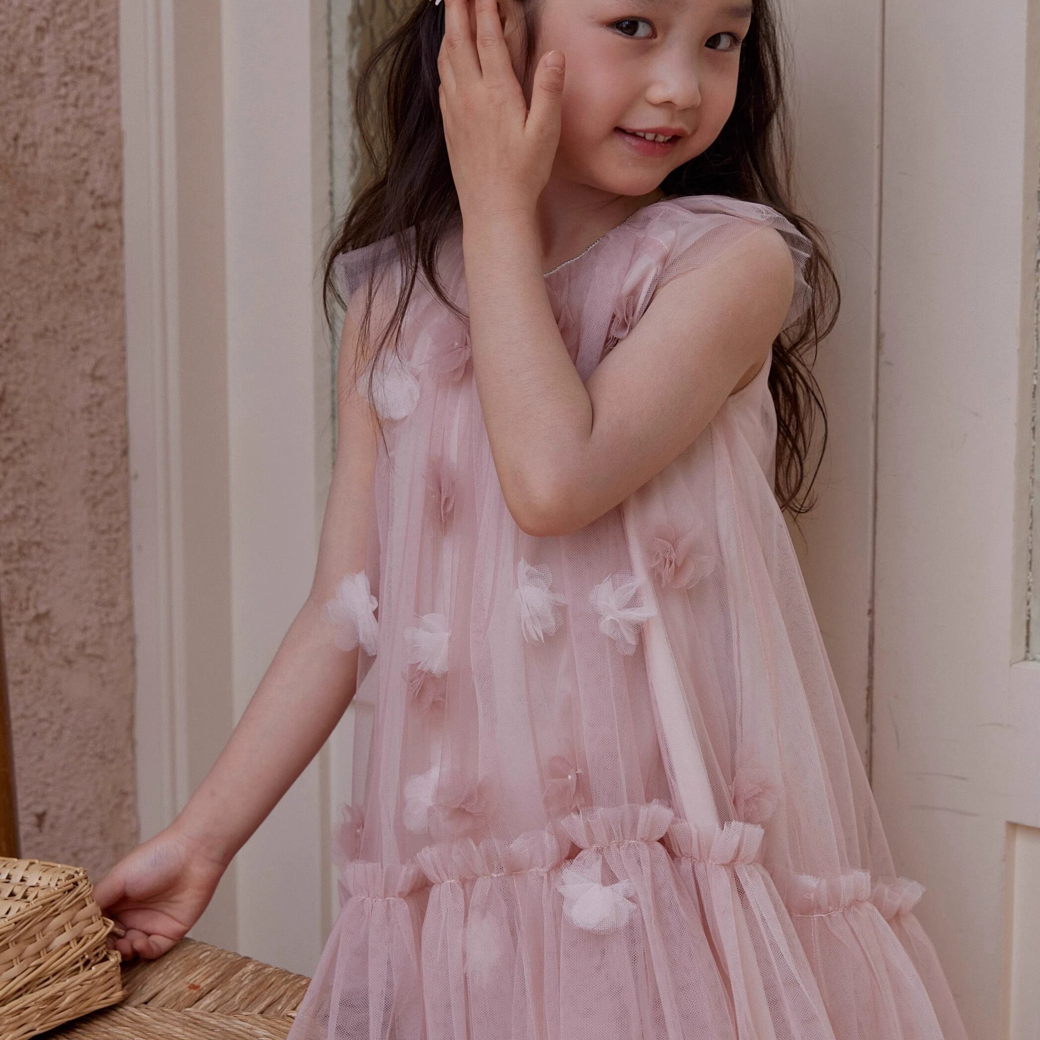全体にはピンクとホワイトの立体的なお花が贅沢にあしらわれ、動くたびにふんわりと華やかさが広がり、まるでおとぎ話の中のプリンセスのような一着。
