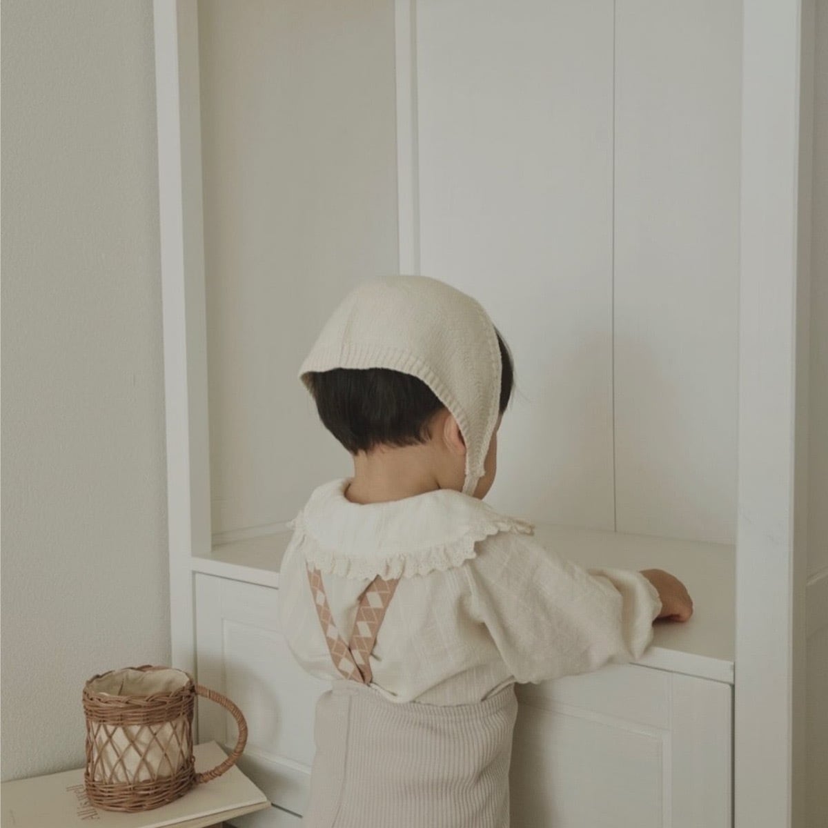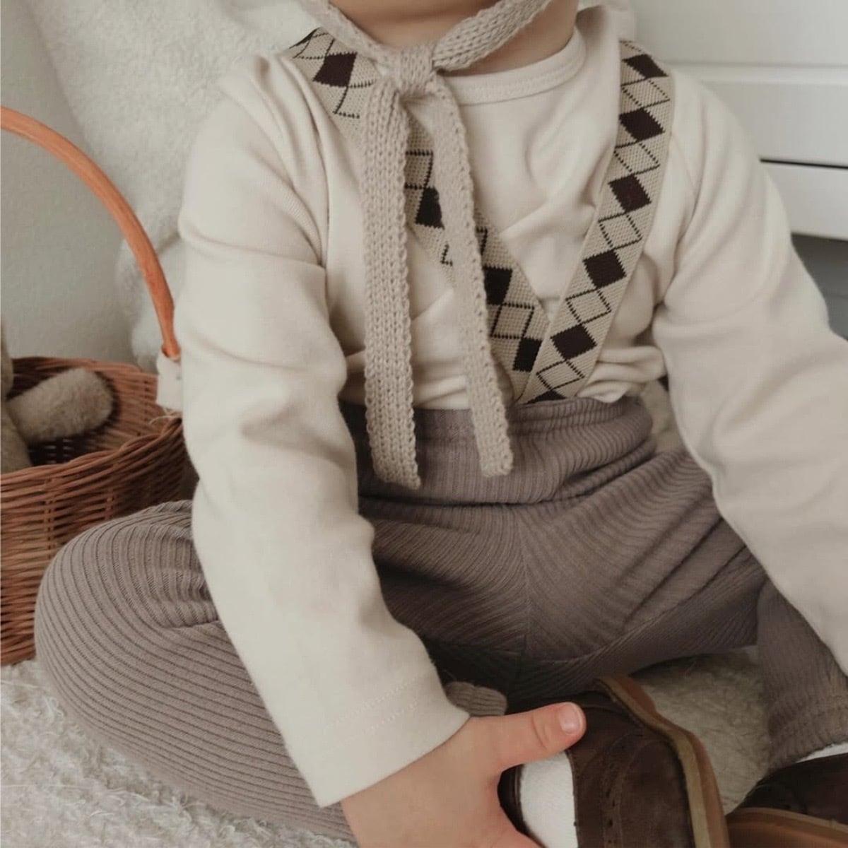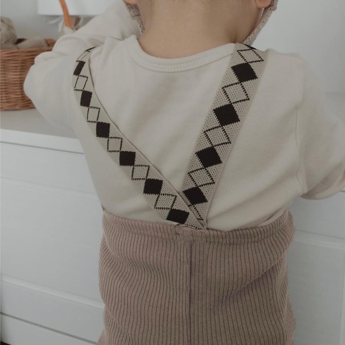 サスペンダーには幾何模様を取り入れ、さりげなく個性をプラスした新鮮でおしゃれなデザインに仕上げました。